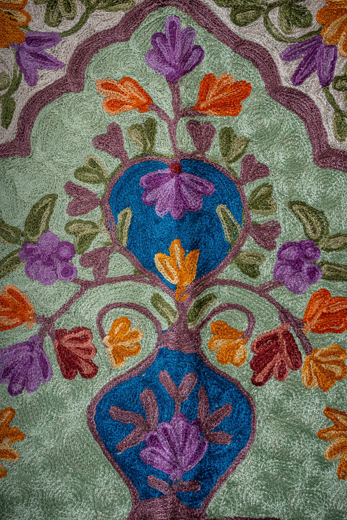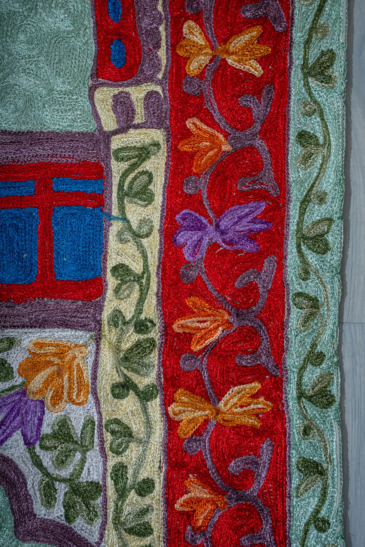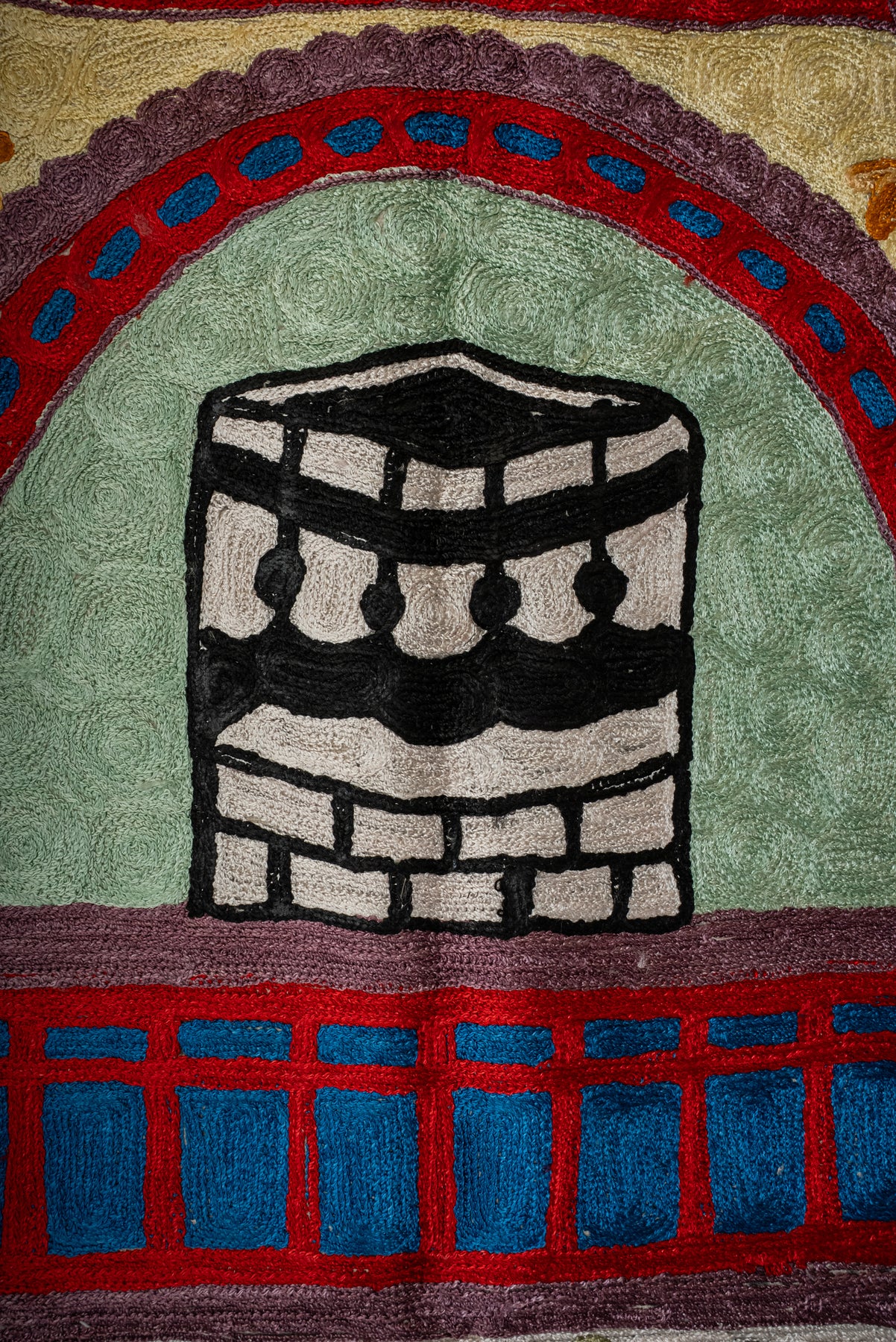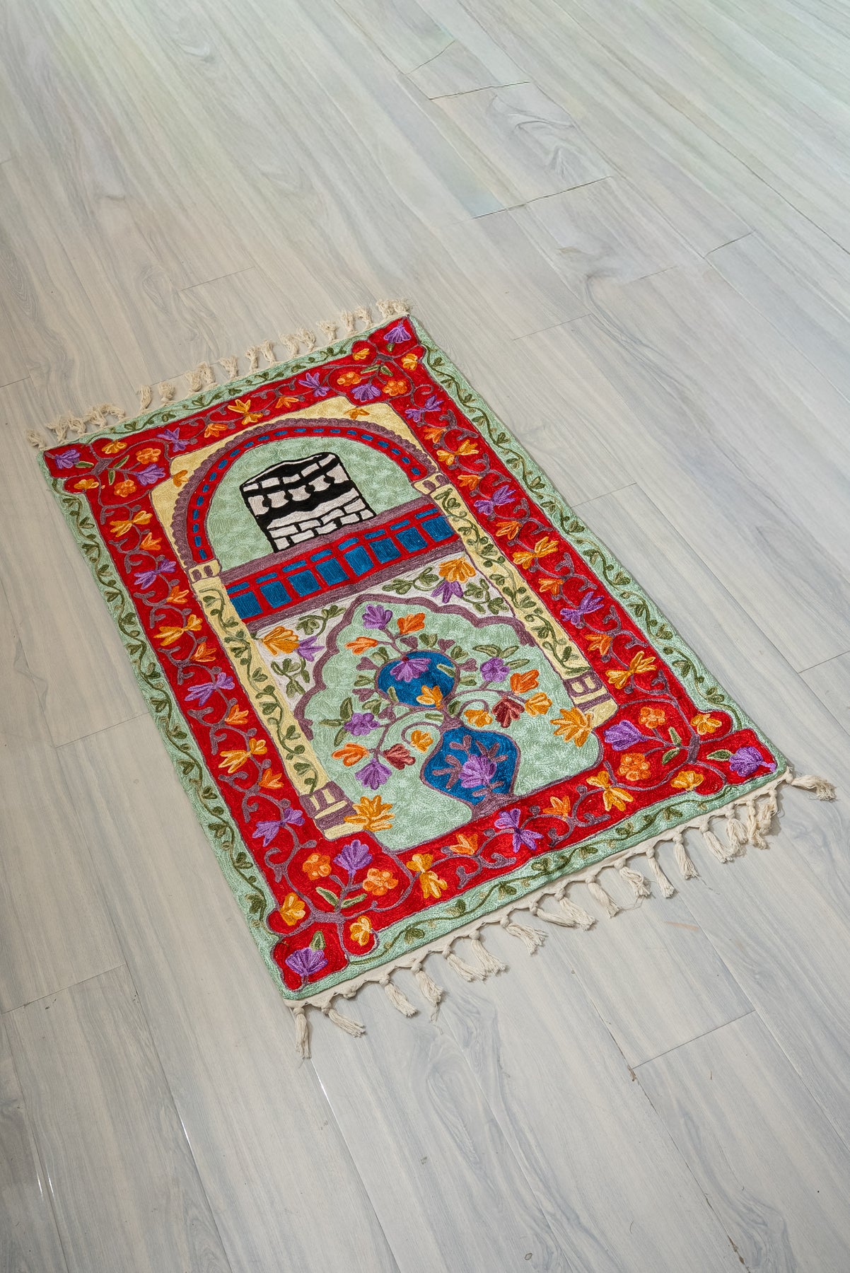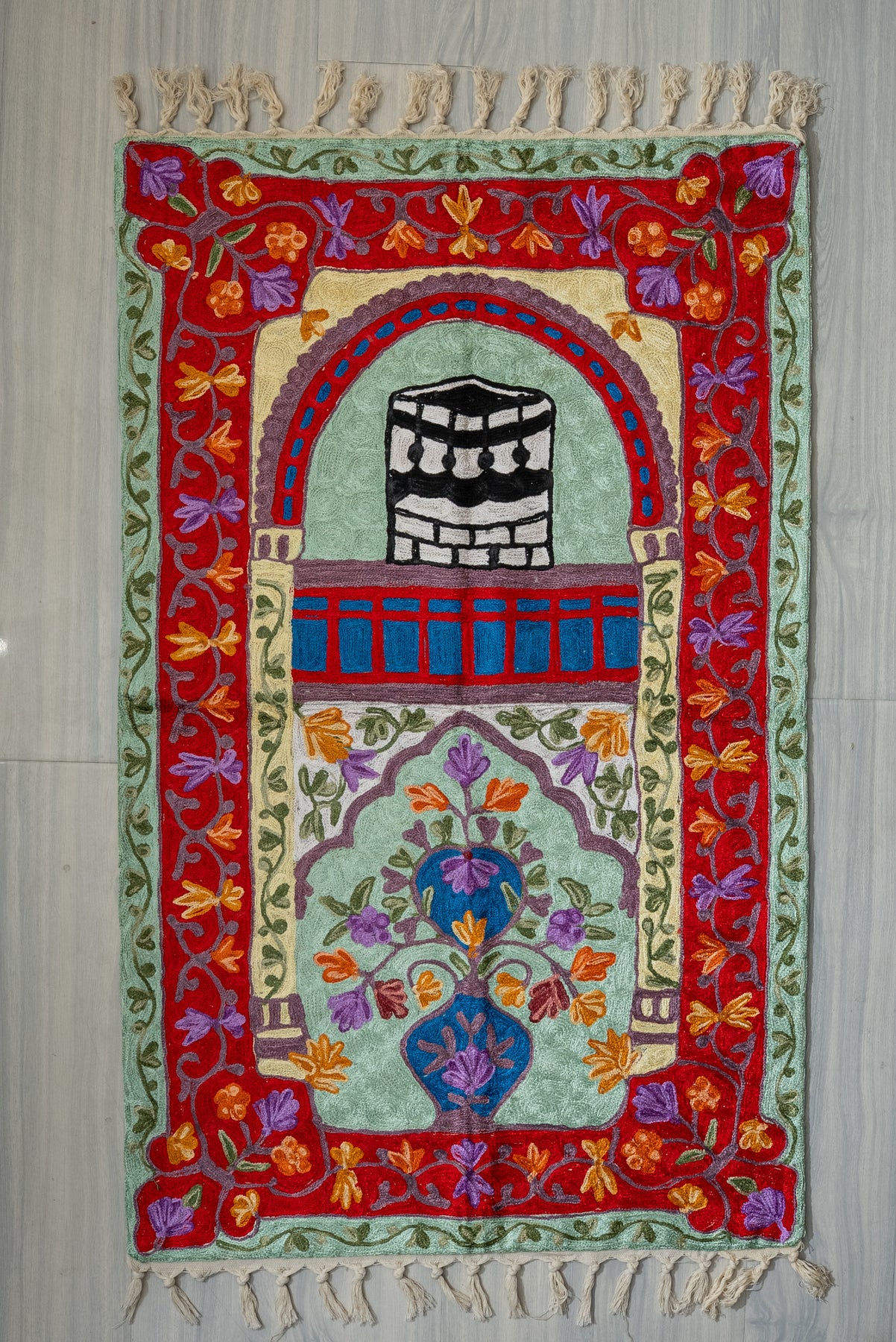 Rich in color and symbolism, this Hand Embroidered Jainimaz (Prayer Mat) features a bold red arch framing the Kaaba, complemented by flowing floral vines in warm and earthy tones. The layered borders add depth, making the design feel both grand and inviting.