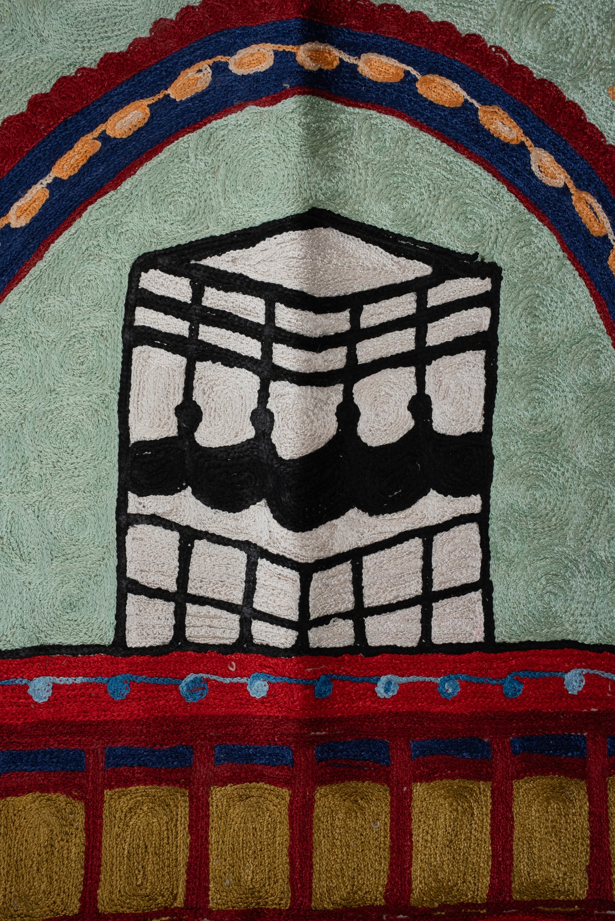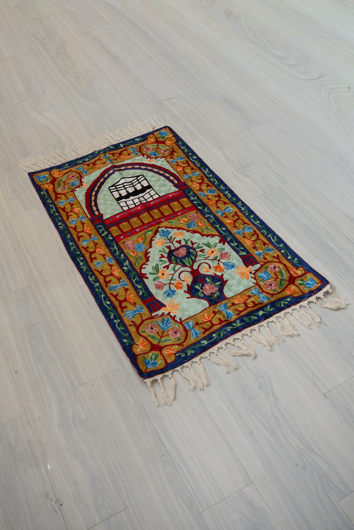 This Hand Embroidered Jainimaz (Prayer Mat) features a lush floral garden encircling a central arch that gently frames the Kaaba. The rich combination of golden hues, deep blues, and soft greens creates a warm and visually captivating design.
