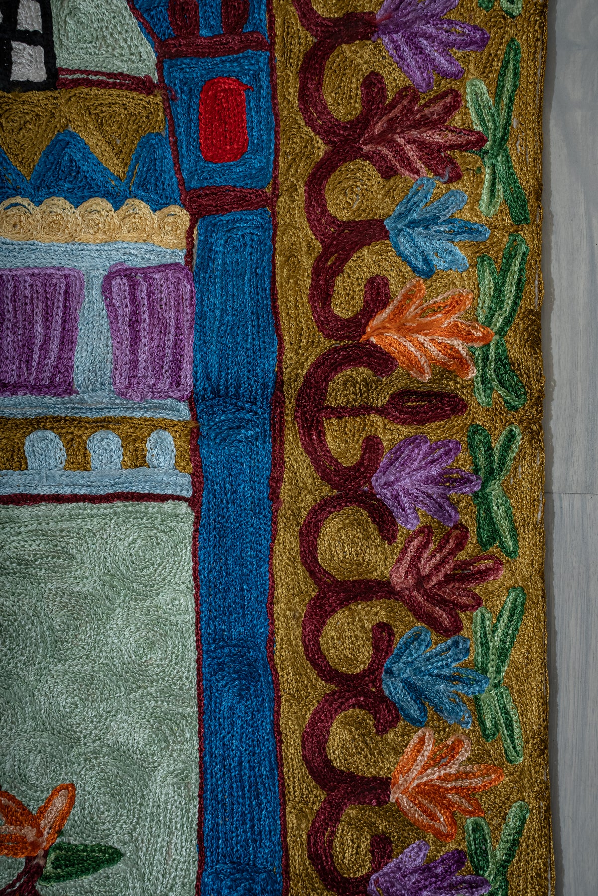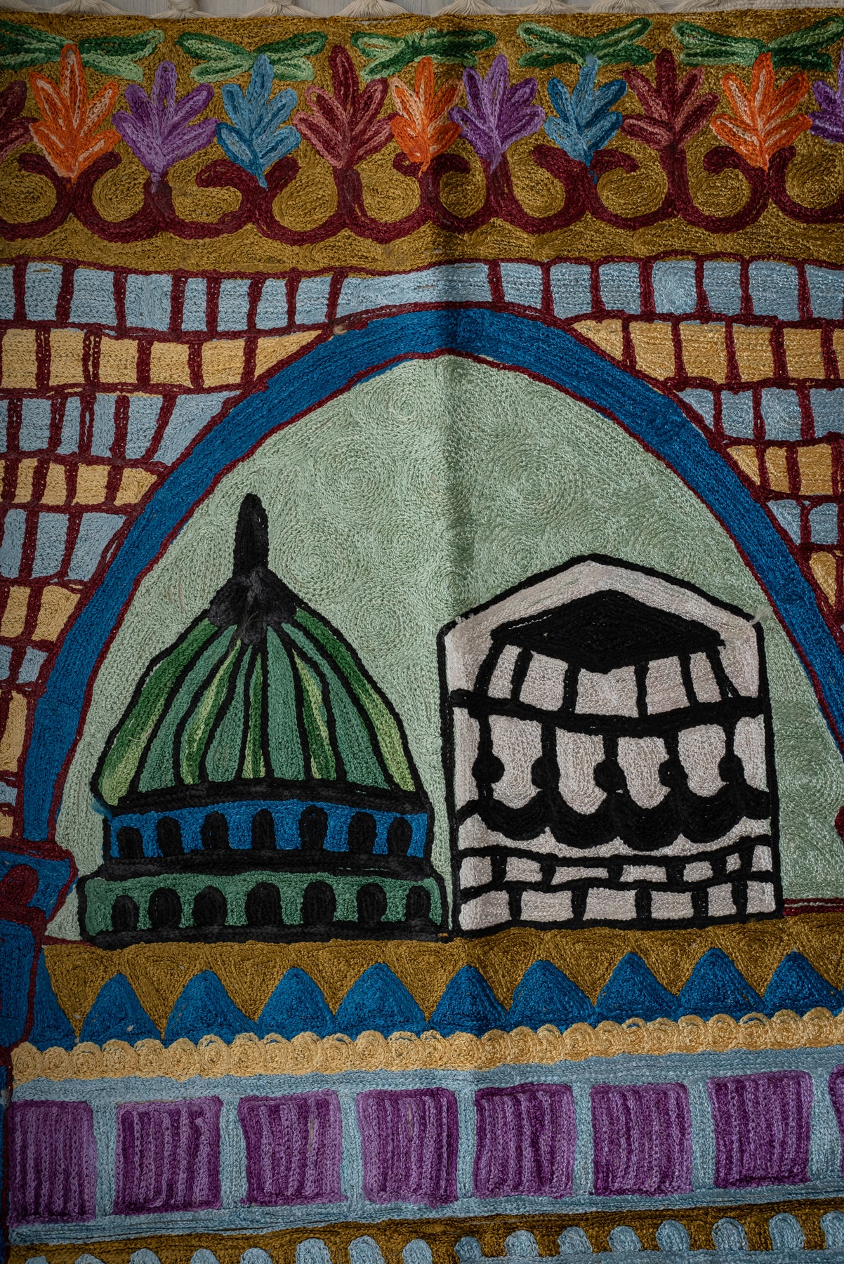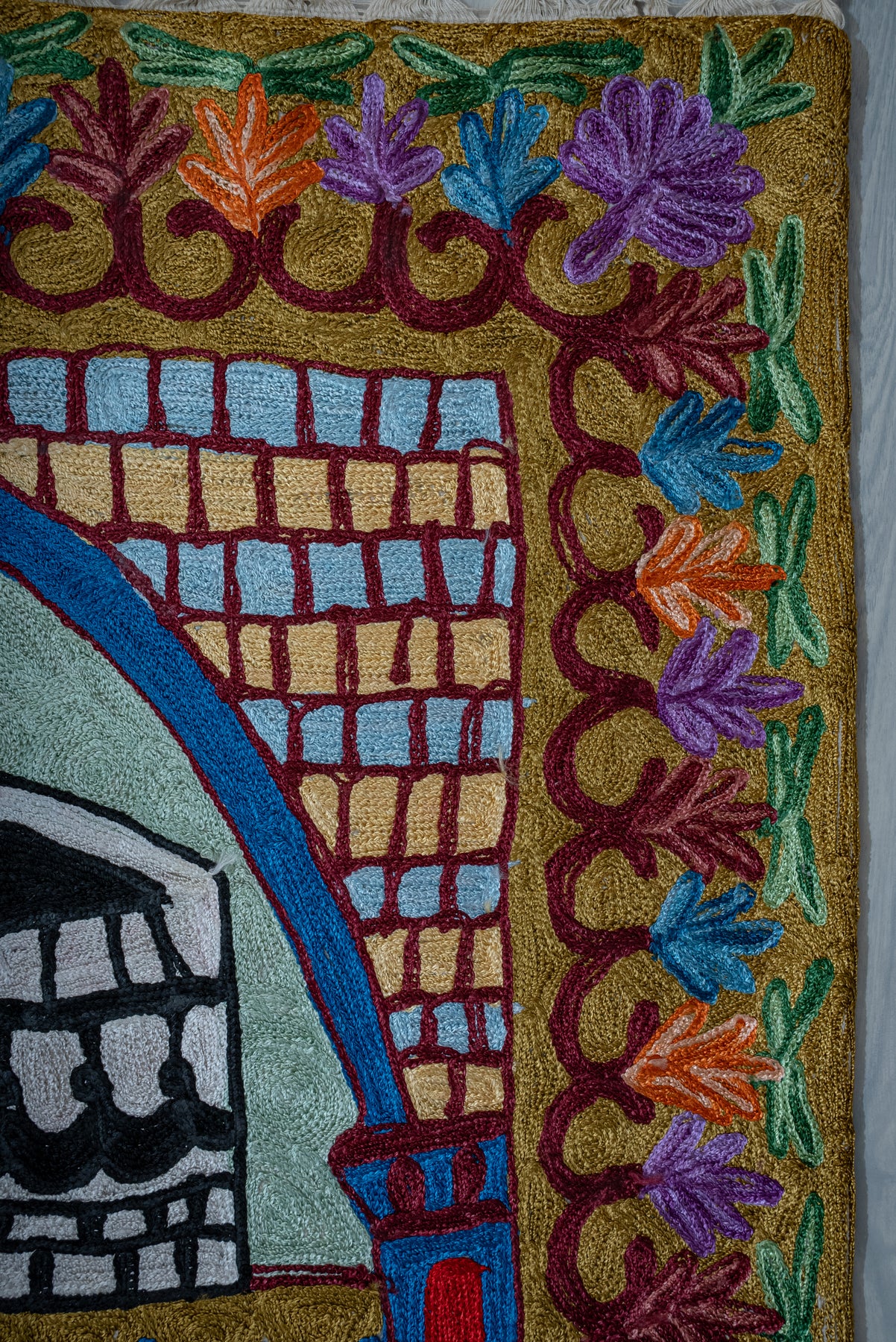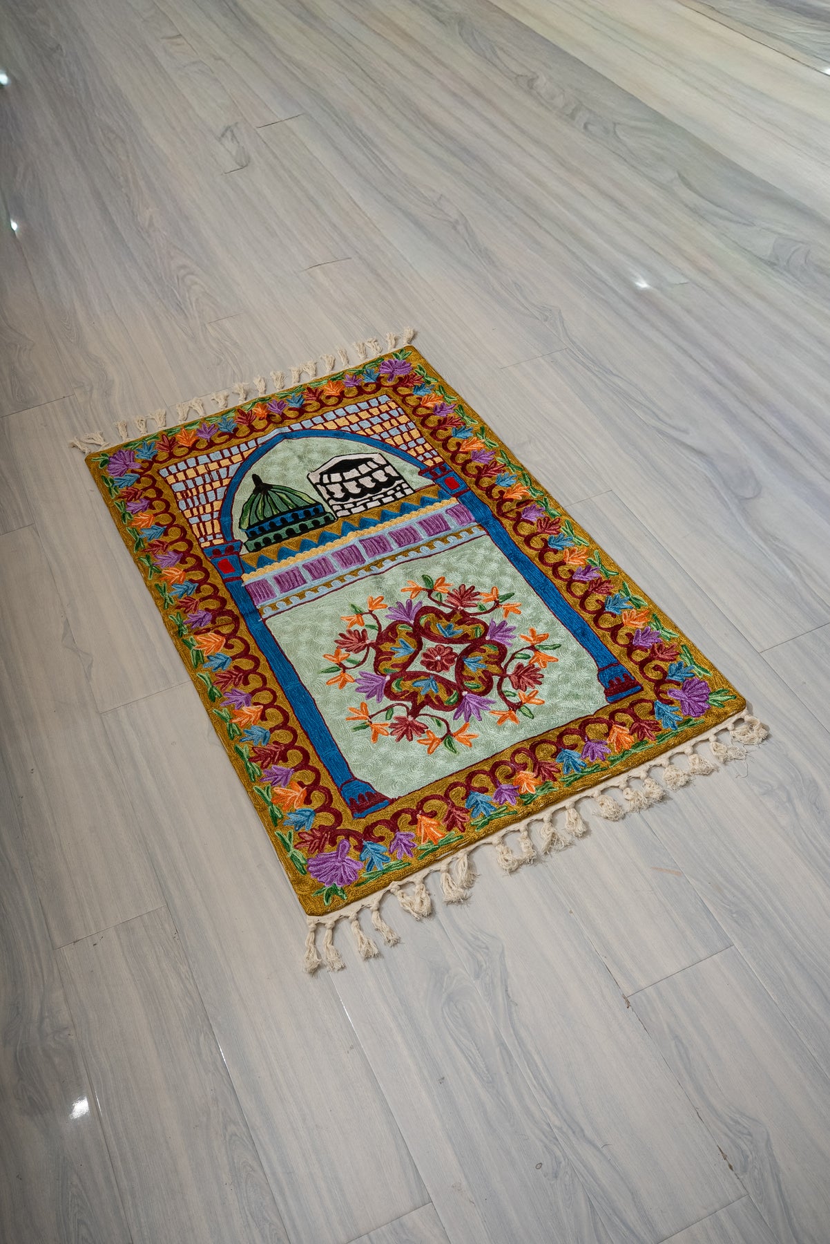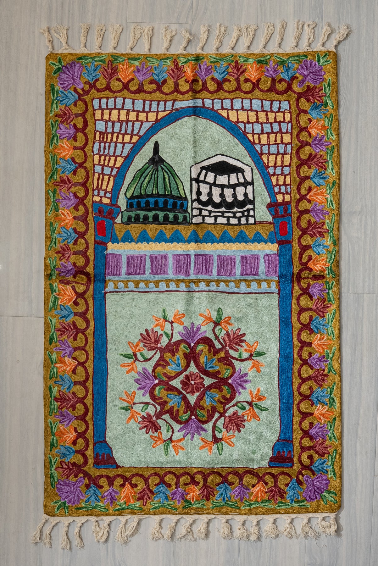 A refined blend of architectural elegance and floral artistry, this Hand Embroidered Jainimaz (Prayer Mat) showcases sacred domes beneath a grand arch, framed by intricate vine patterns in rich, warm tones. The layered design adds depth and visual richness.