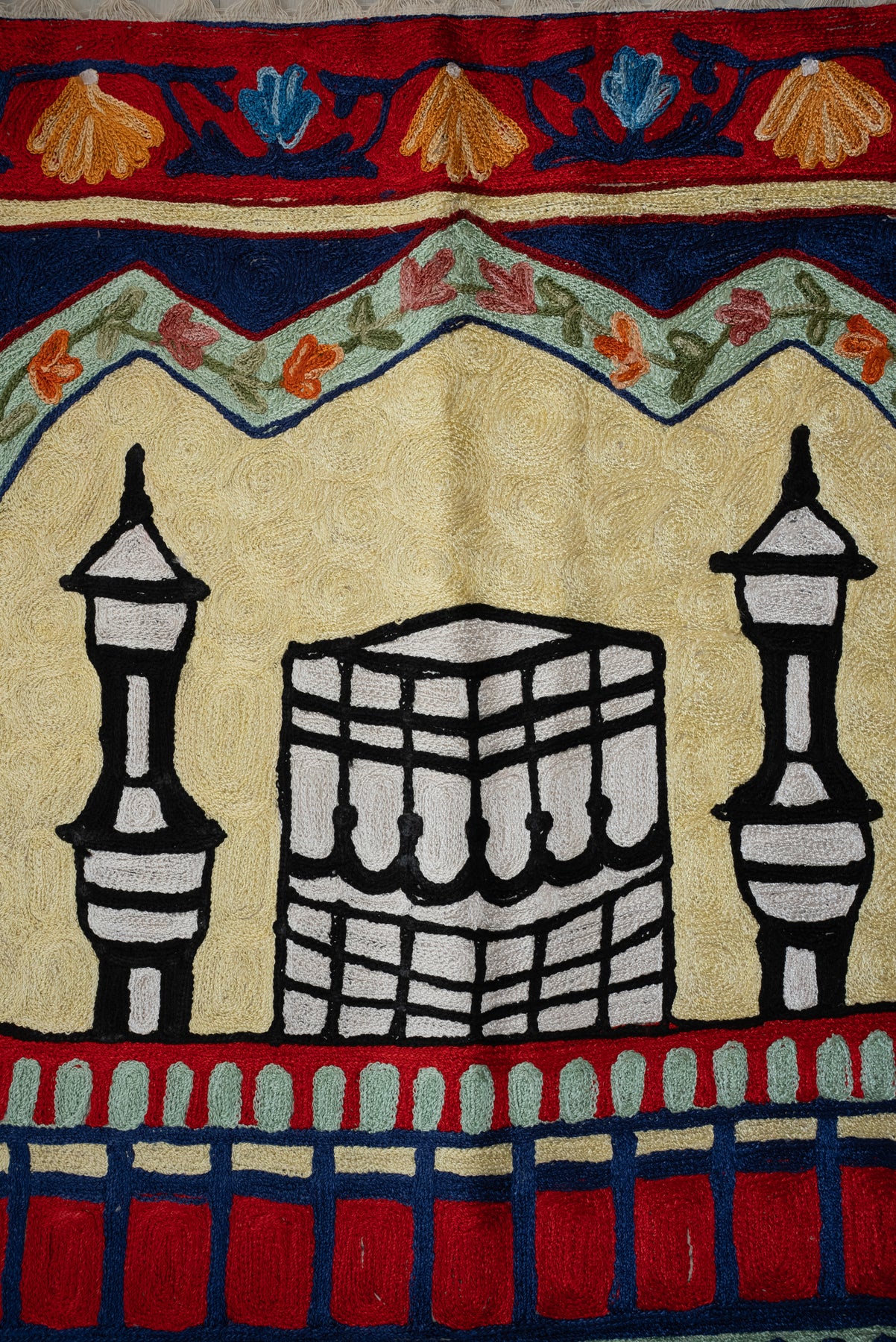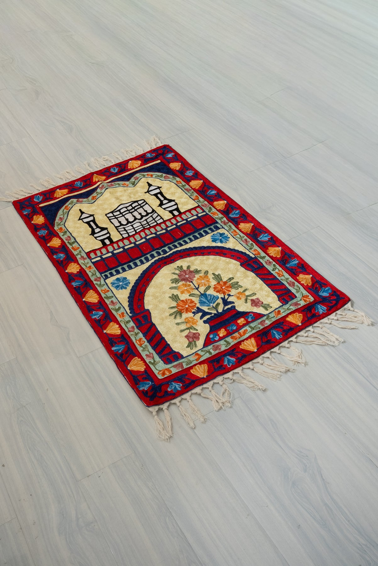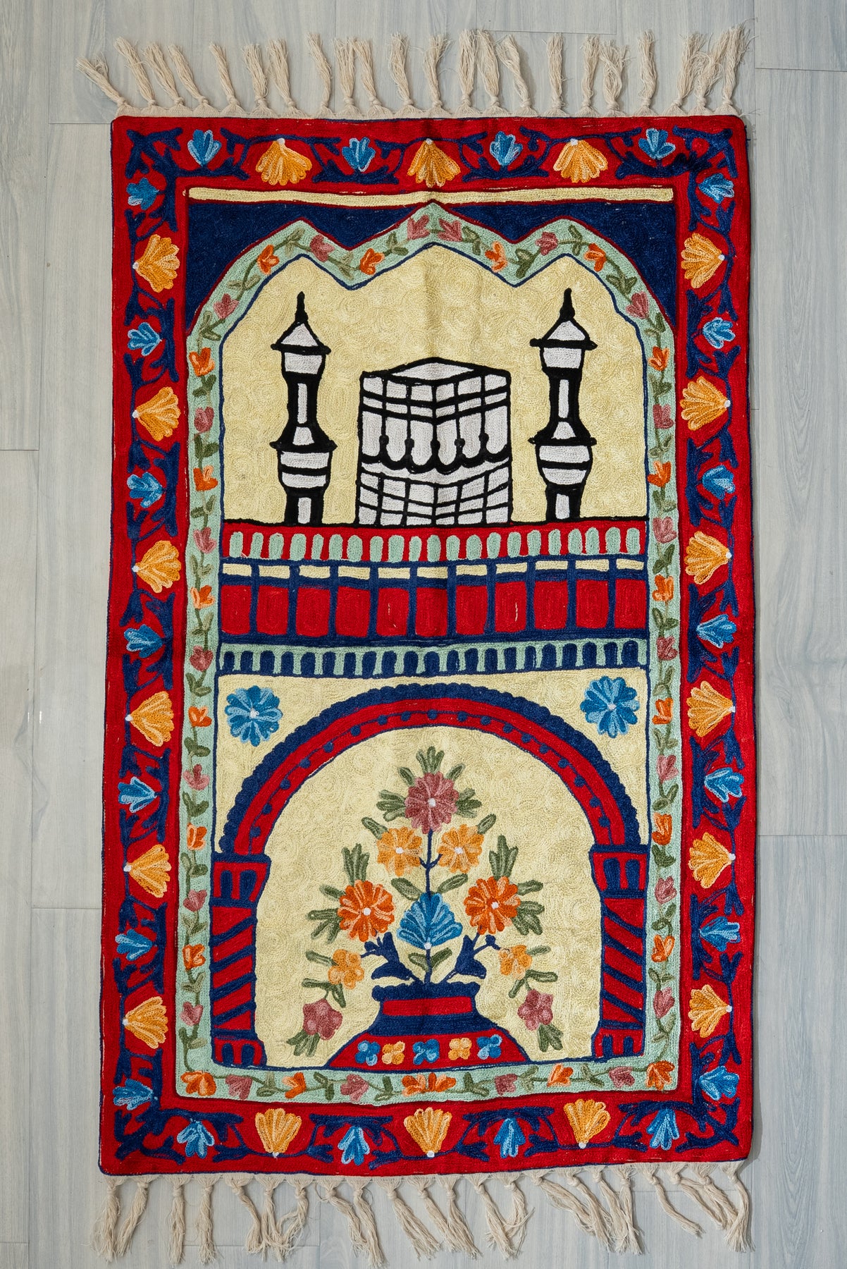 Bold and elegant, this Hand Embroidered Jainimaz (Prayer Mat) presents the Kaaba flanked by stylized minarets beneath a deep-toned arch, surrounded by vivid floral borders in rich reds and blues. The striking contrast creates a visually powerful yet balanced composition.