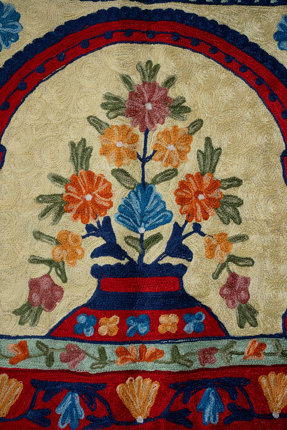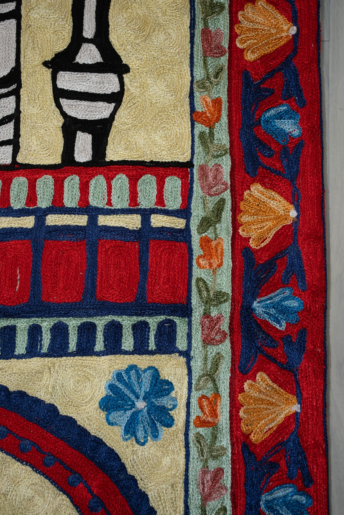 With finely detailed hand embroidery, every element stands out with clarity and texture. This piece blends traditional symbolism with a vibrant aesthetic, offering a distinguished and serene space for prayer.
