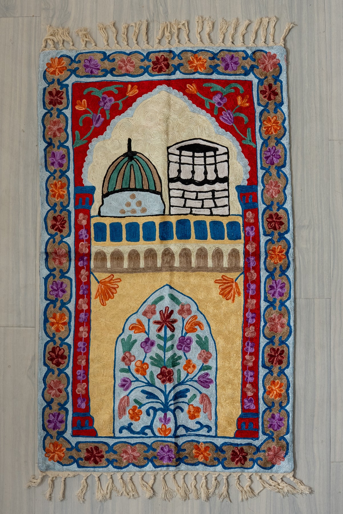 A refined expression of devotion, this Hand Embroidered Jainimaz (Prayer Mat) features a beautifully detailed arch framing sacred domes and Kaaba-inspired elements. The soft beige center is elevated by a vivid red backdrop and bordered with delicate floral vines in rich, harmonious tones.