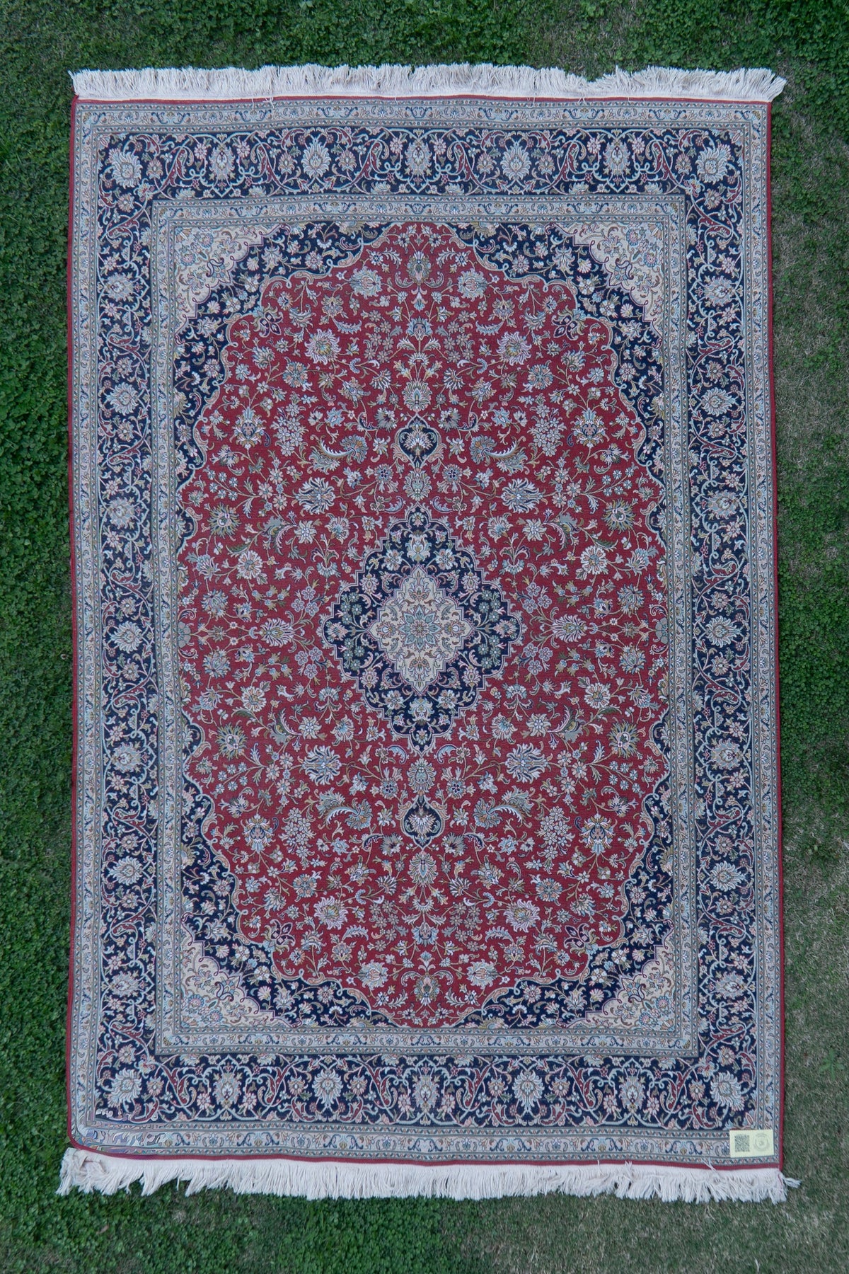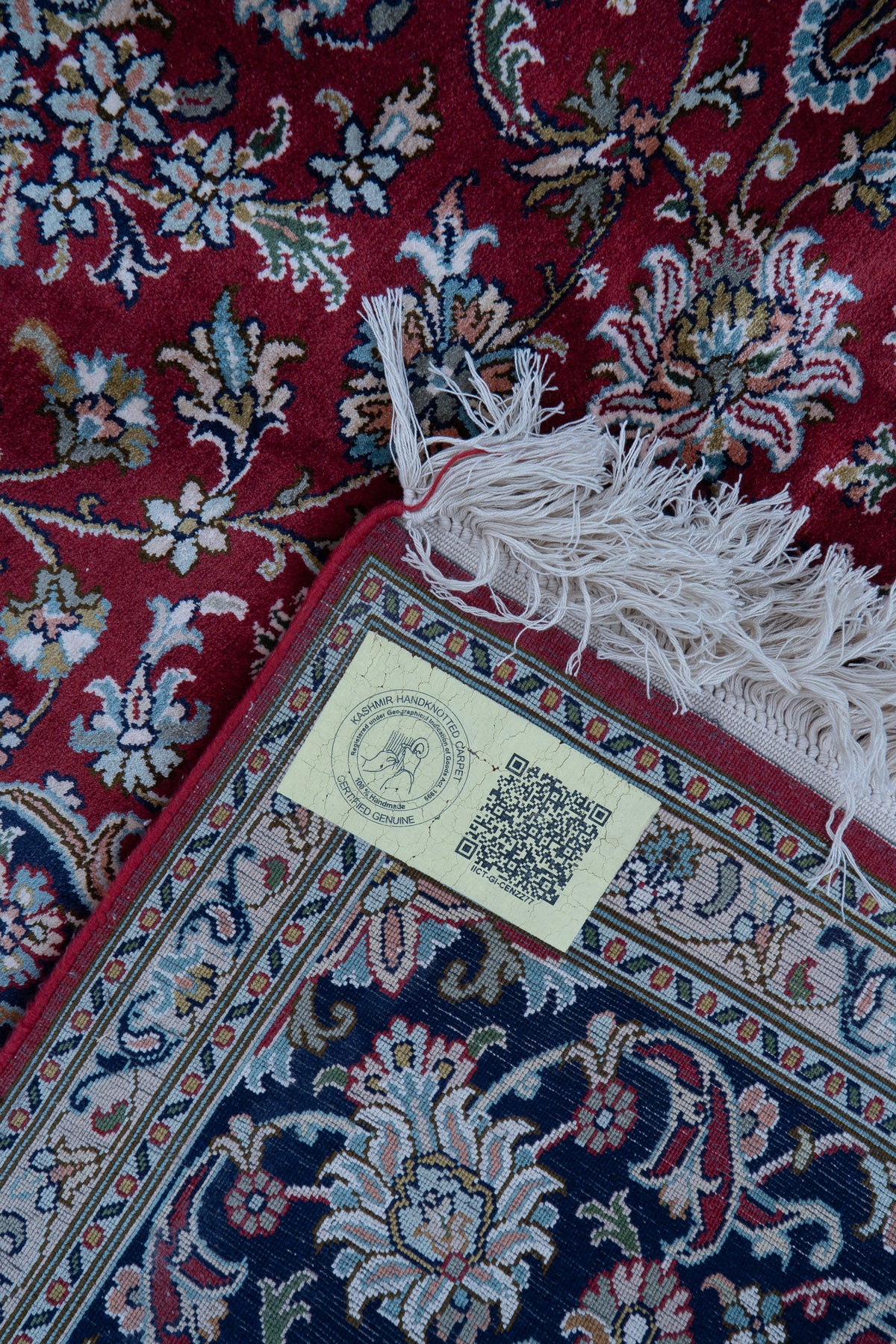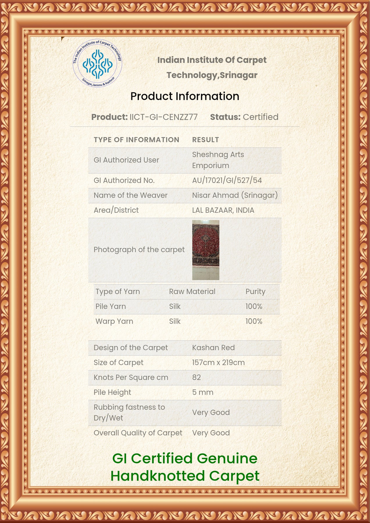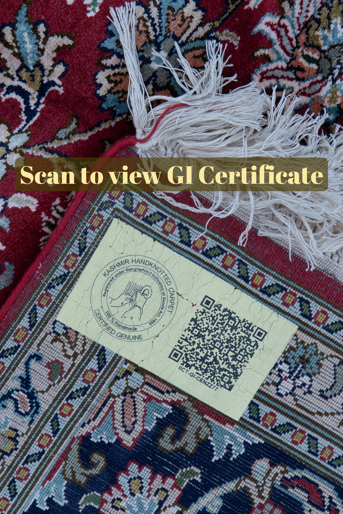 To guarantee authenticity, every Pure silk on silk carpet is accompanied by a Geographical Indication (GI) Certificate, issued by the Government of India. This certificate confirms that this carpet is a 100% Pure silk carpet and is Hand-knotted, and Hand-Crafted by local Artisans in Kashmir valley.