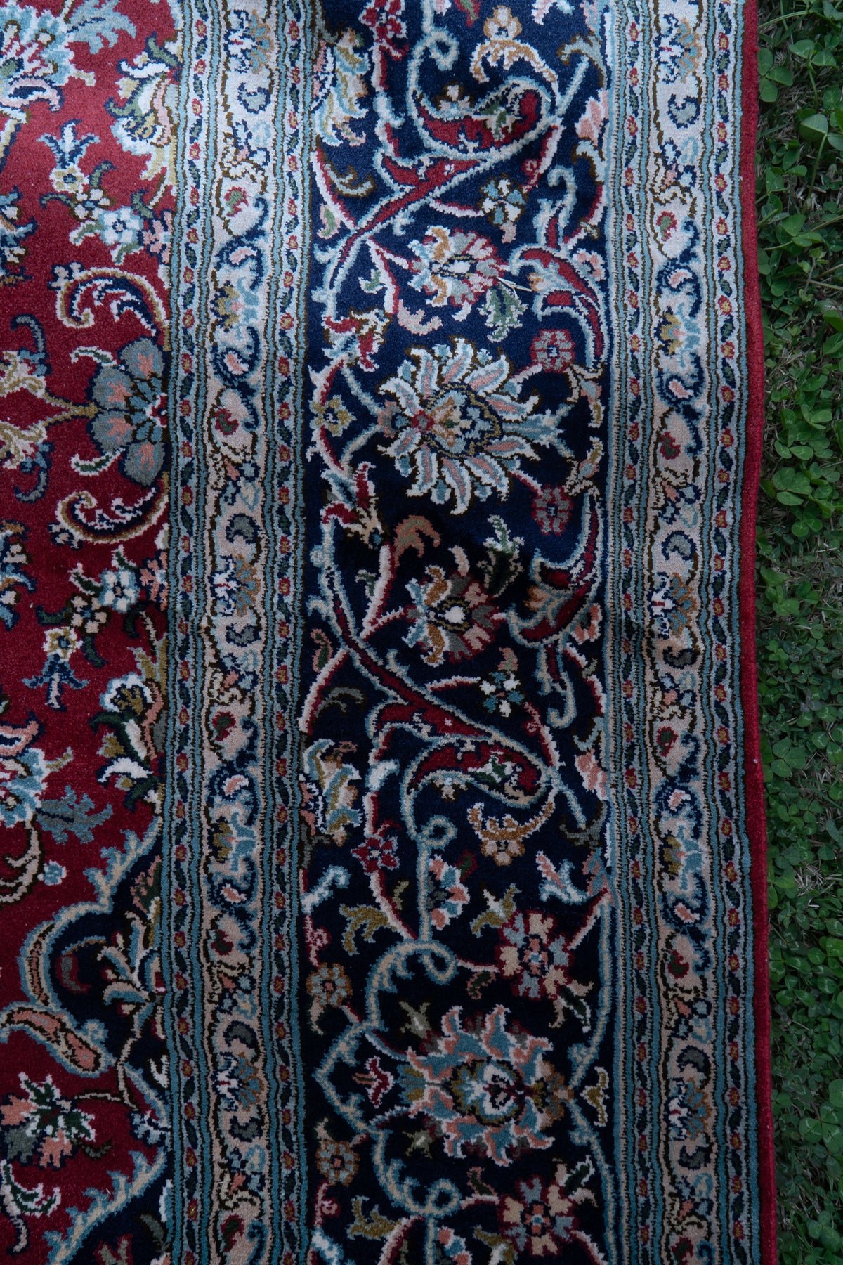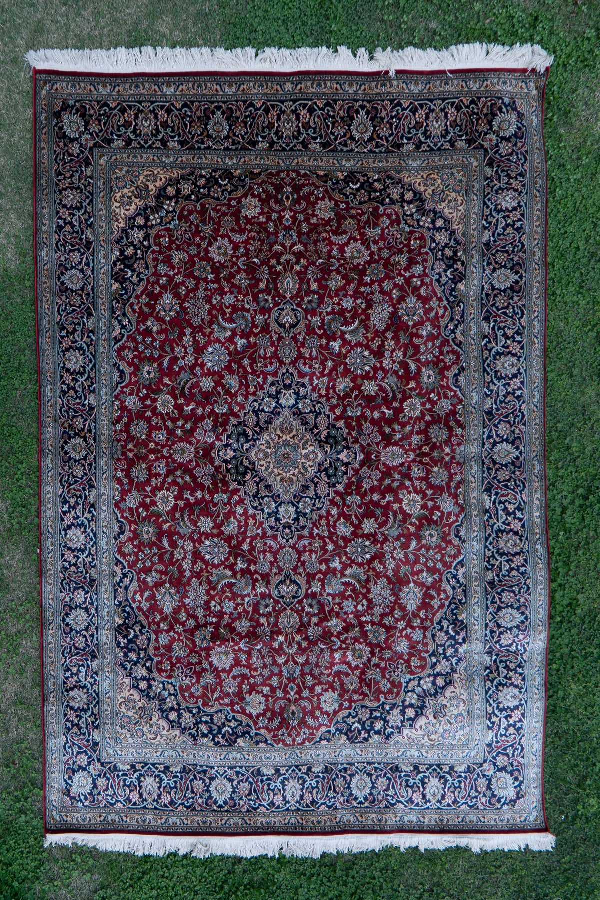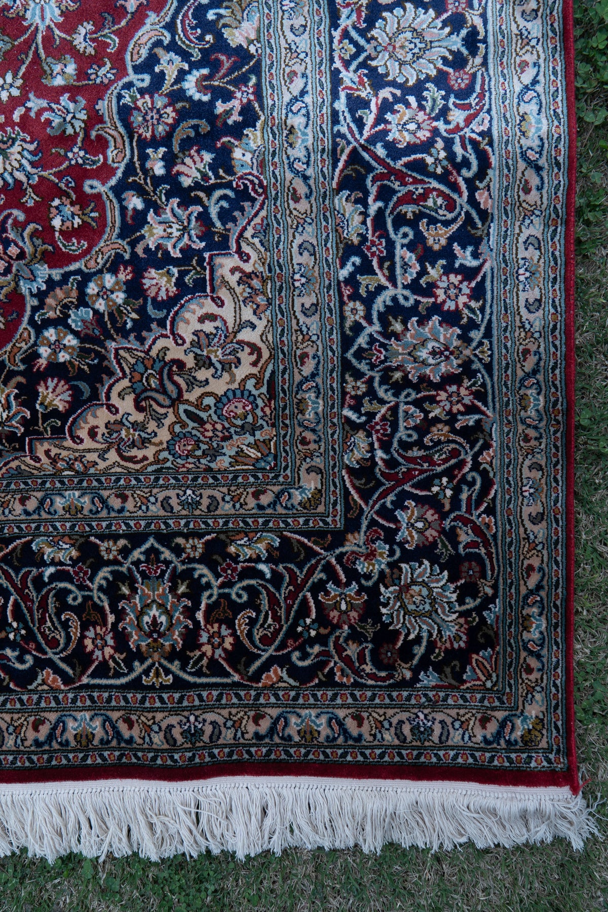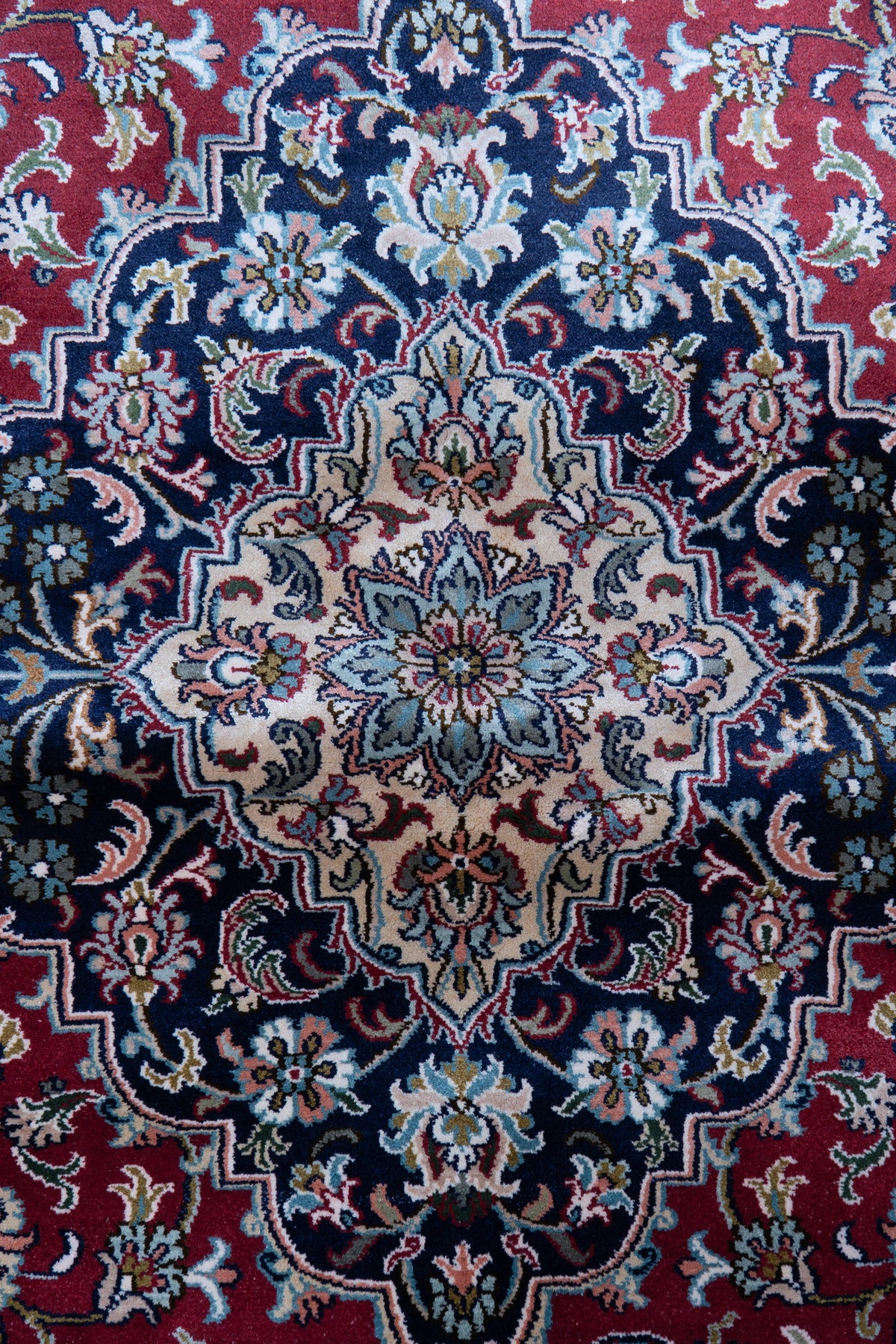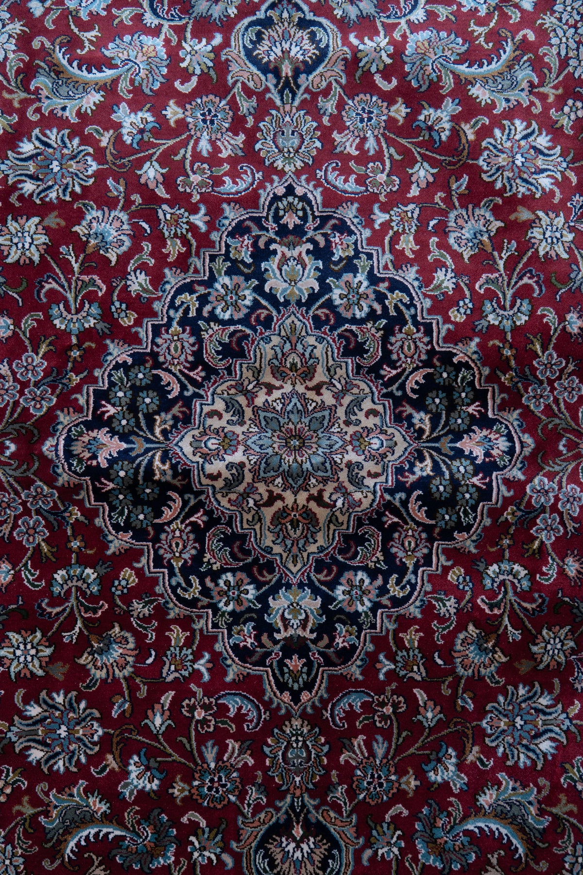 A majestic composition unfolds across a rich ruby field, where intricate floral vines and a finely detailed central medallion create a sense of timeless opulence. The deep navy border frames the design beautifully, adding contrast and depth to its regal character.