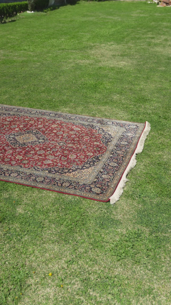 7ft * 5ft: Imperial Ruby Grandeur: Hand Knotted Mulberry silk on silk Kashmiri Carpet