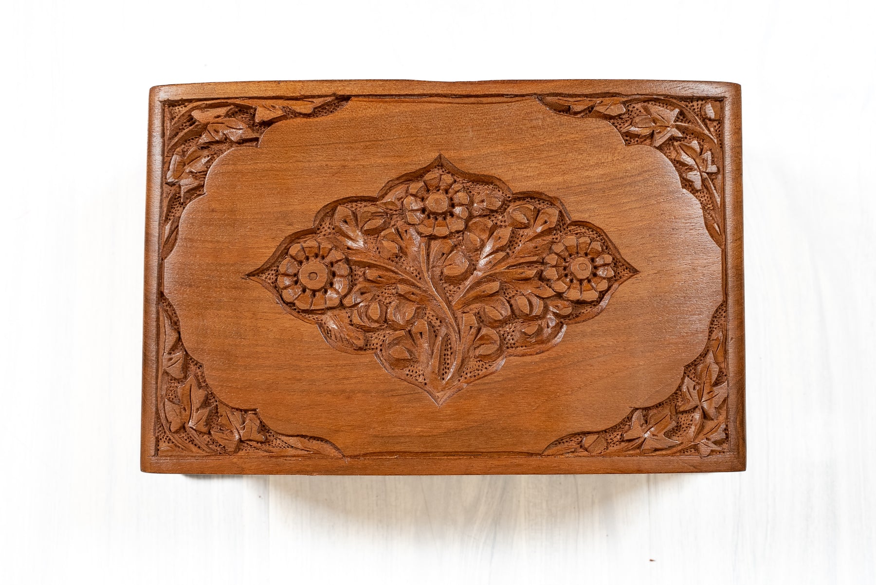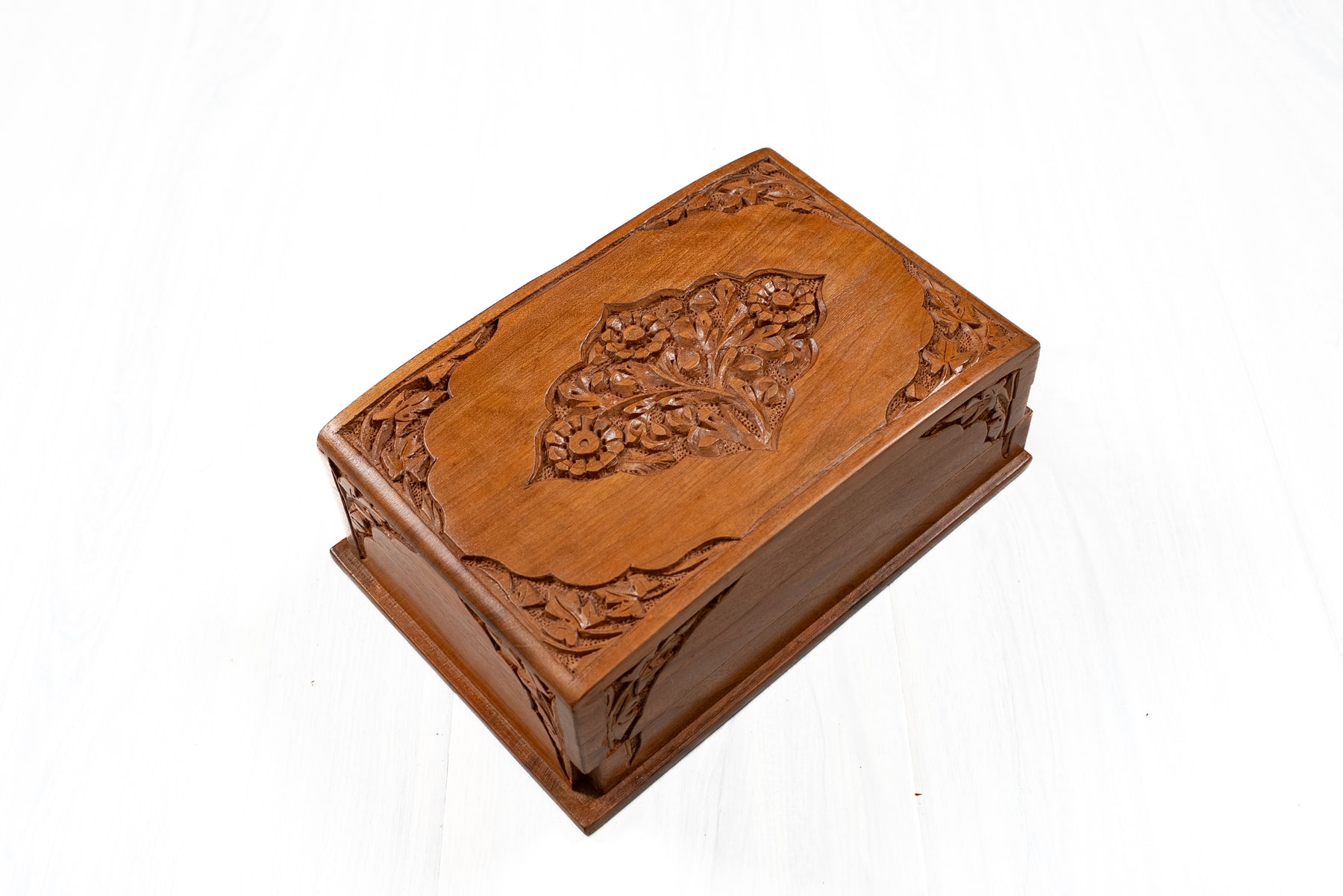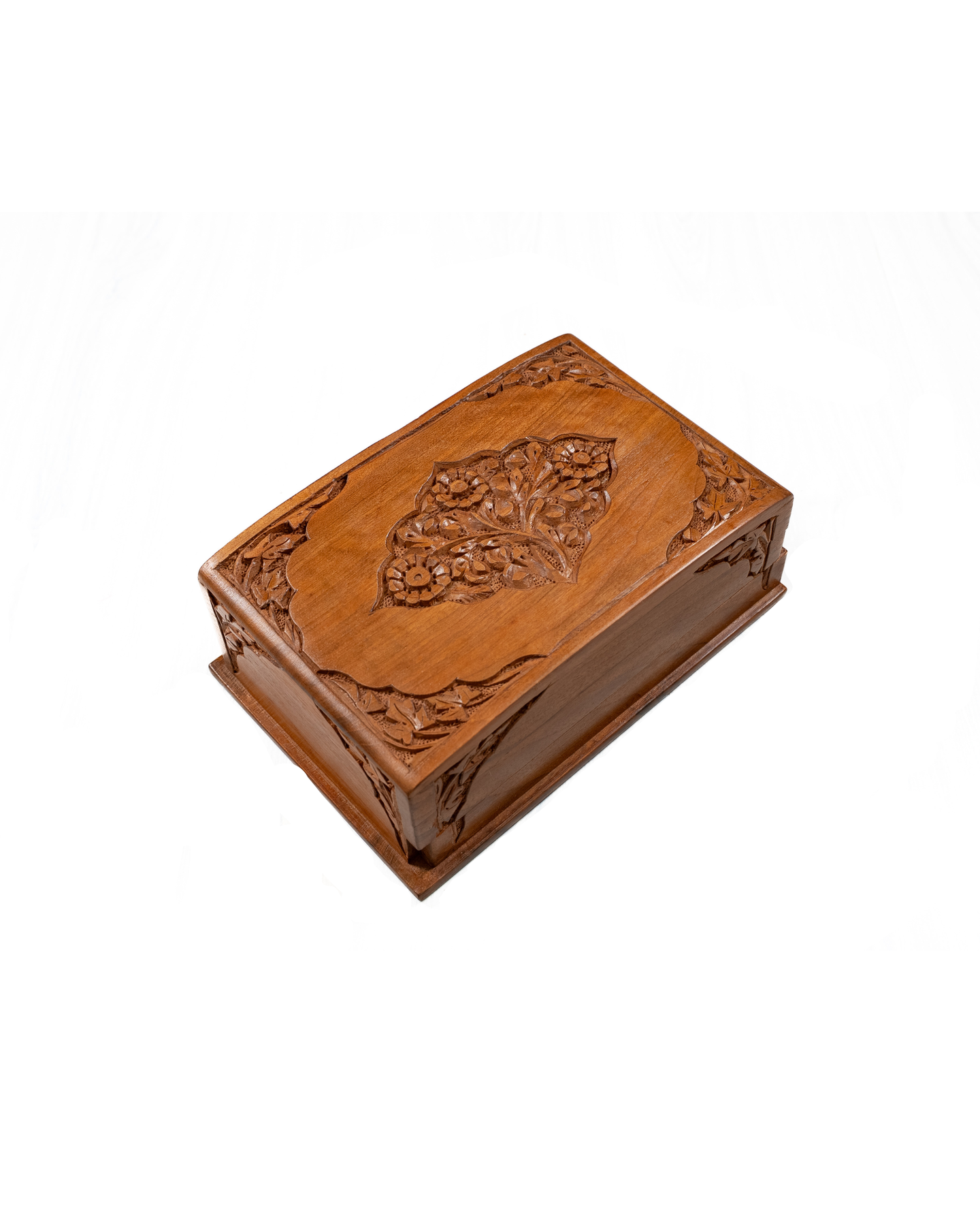 8" x 5" x 3" Petal Crest Elegance: Hand Carved Walnut Wood Wooden Box