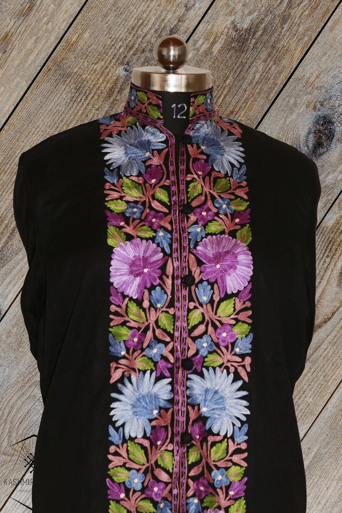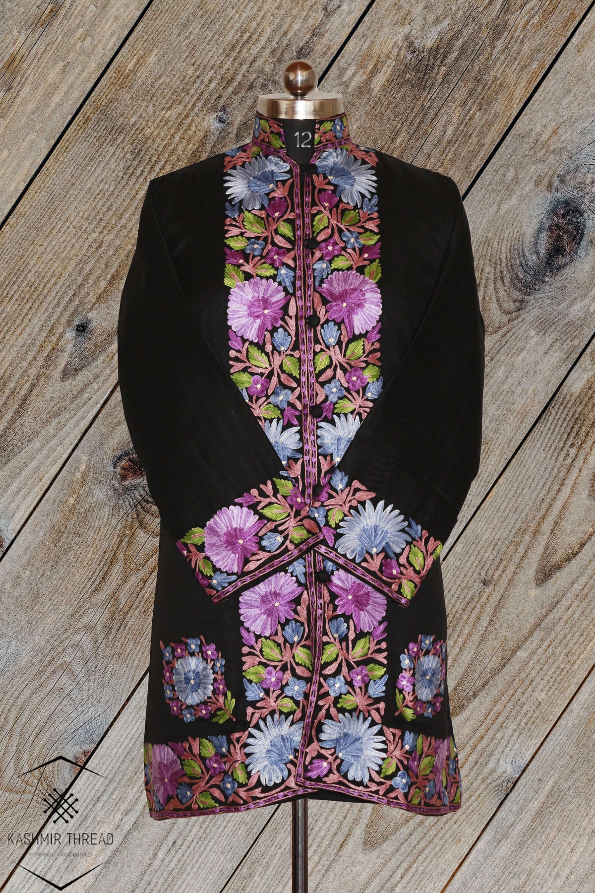 Kashmir Thread Coat XXXL (48) Black Kashmiri Woolen Jacket with Aari Embroidery