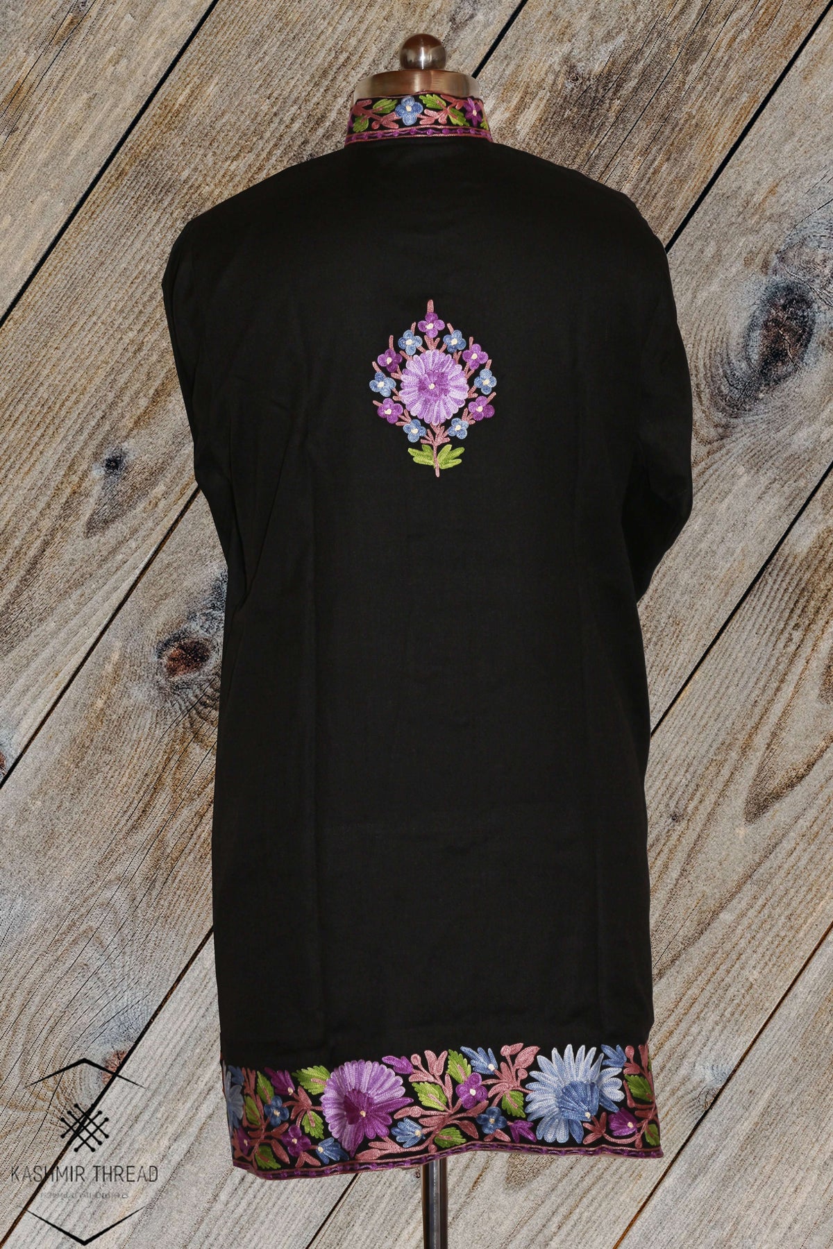Set against a deep black base, the Midnight Bloom Kashmiri Jacket is brought to life with vivid floral motifs in shades of lilac, soft blue, rose, and fresh green. The bold central panel draws the eye, while blooming patterns continue across the cuffs and hem, creating a striking yet balanced composition.
