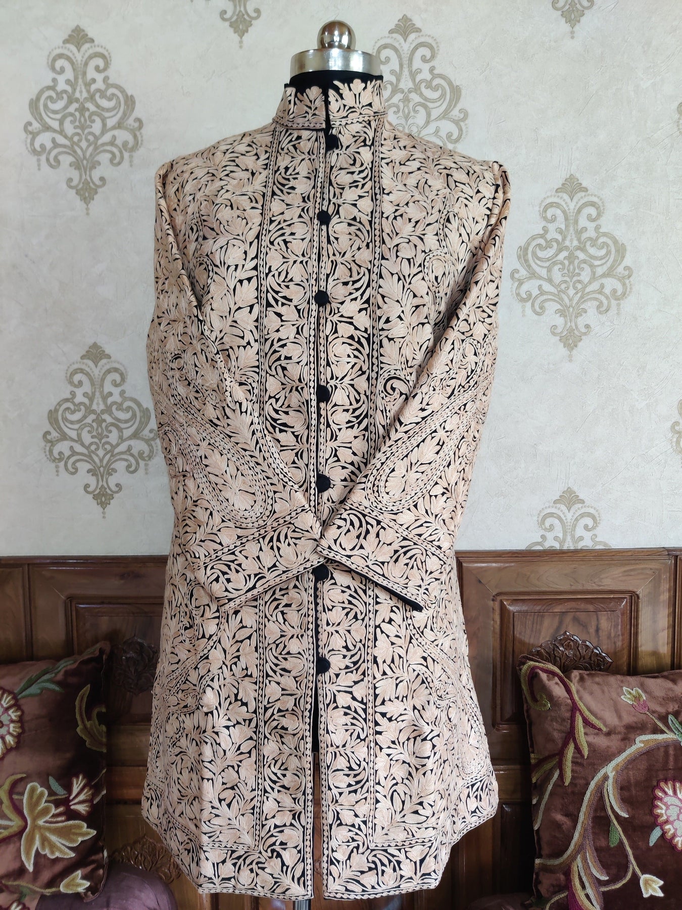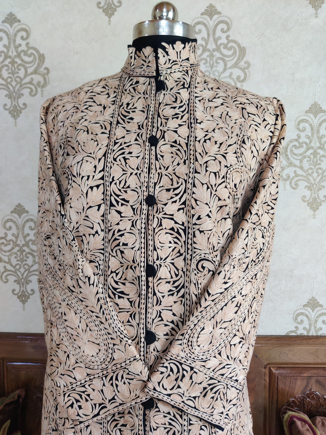 Set against a deep black base, the Almond Noir Kashmiri Jacket features intricate almond-toned patterns that flow seamlessly across the surface, creating depth without overpowering the silhouette. The contrast feels refined and balanced, lending the jacket a quiet, confident presence.