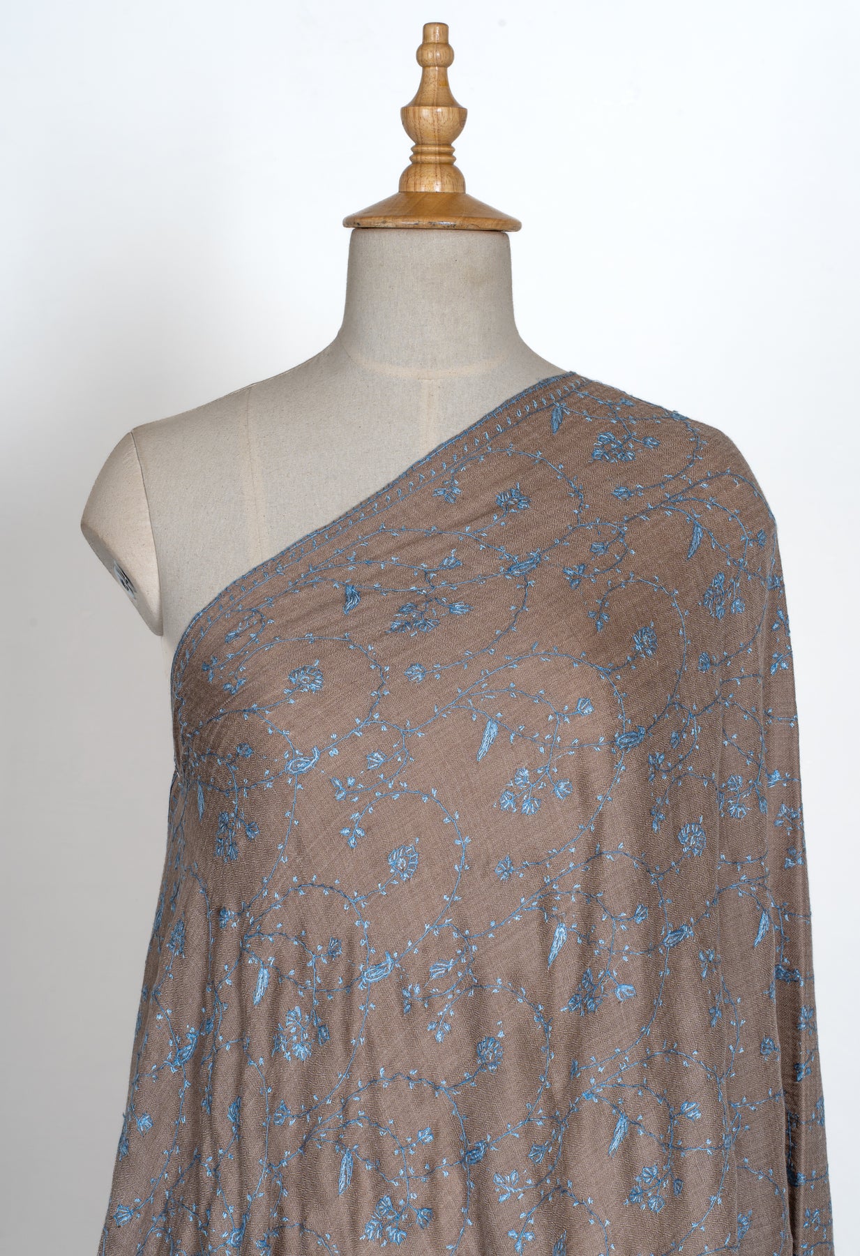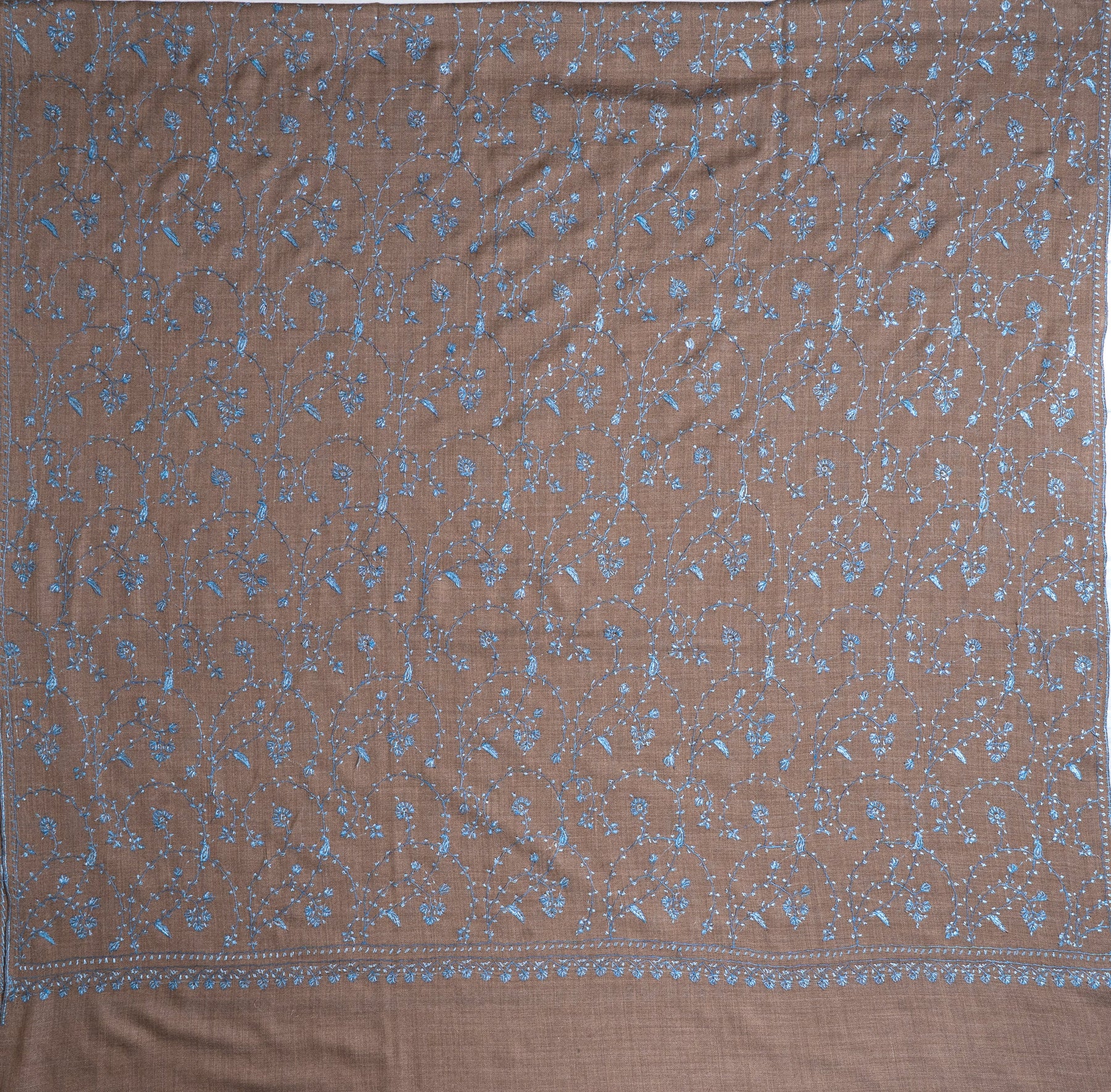 The Ferozi Bagh (turquoise garden) shawl is a masterwork of Kashmiri Sozni craft, where earthy calm meets the freshness of mountain air. Woven in a deep cocoa-brown base, its surface is adorned with a flowing garden of vines and blossoms, each motif delicately embroidered in shades of ferozi blue and ivory white.