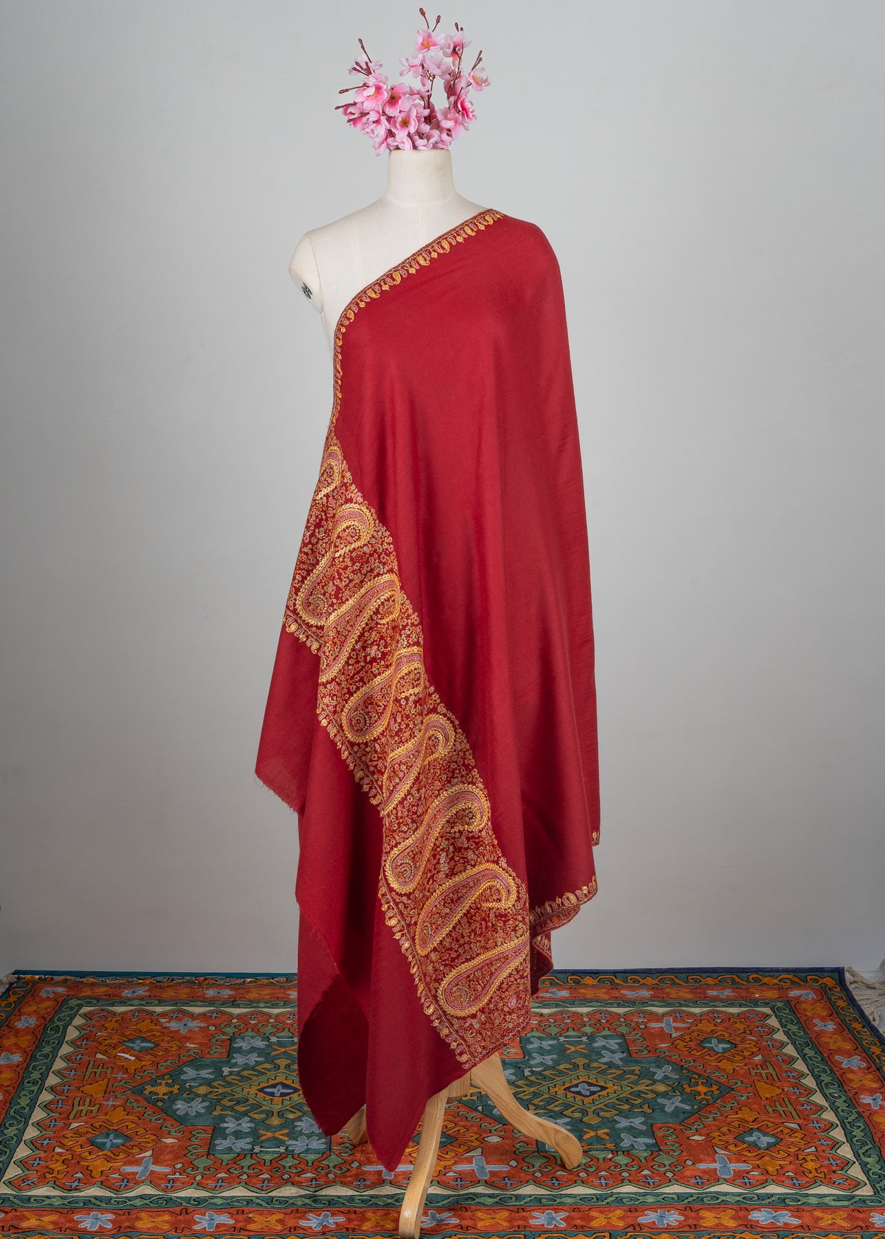 A deep crimson base sets the stage for sweeping paisley borders adorned with golden Sozni hand embroidery. The detailed motifs cascade along one side, creating a graceful movement and a rich visual depth. The craftsmanship radiates tradition and luxury, making this shawl instantly captivating.