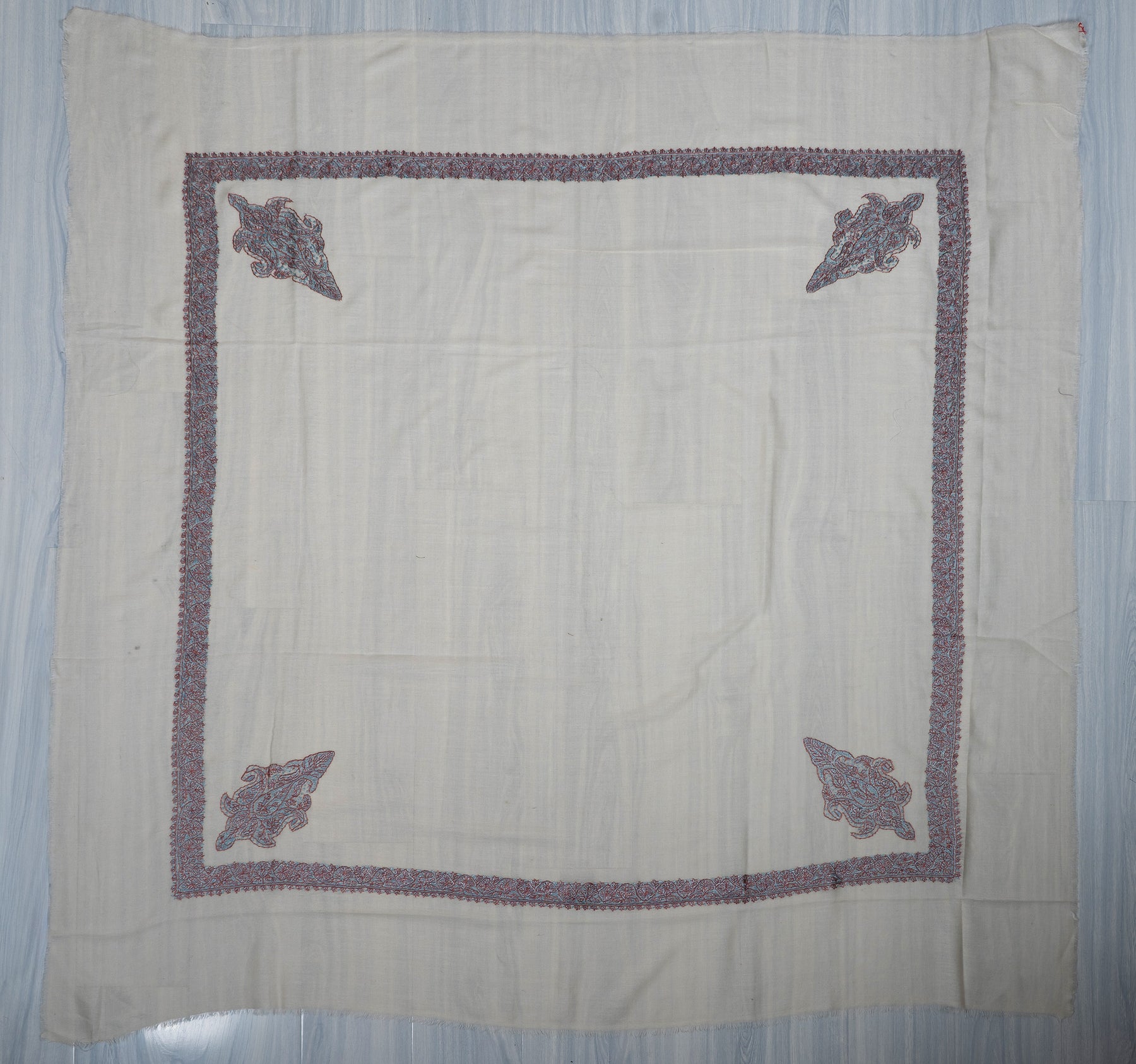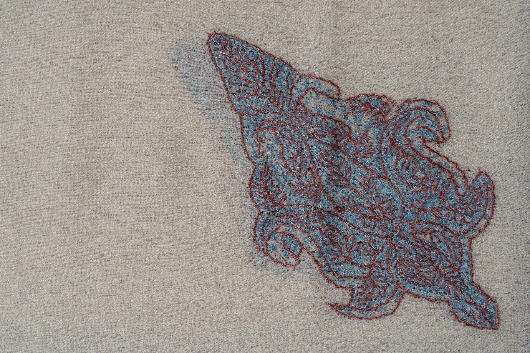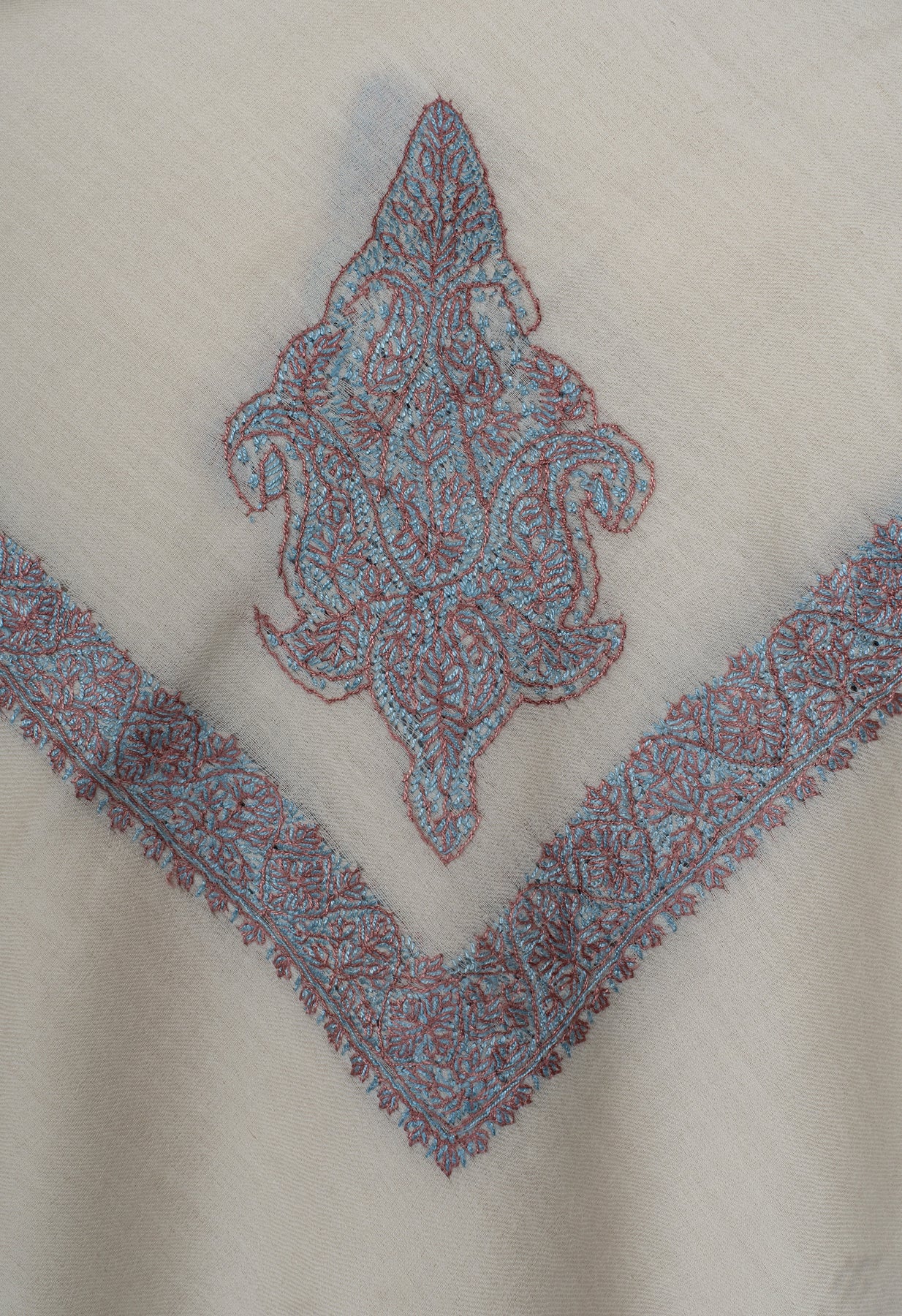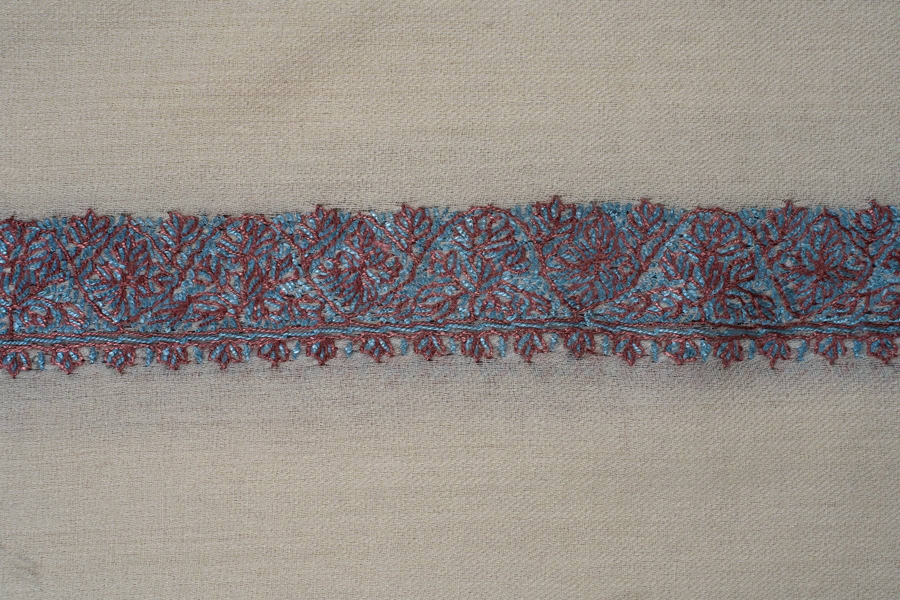 The Sozni embroidery, in delicate shades of coral red and turquoise, decorates the ivory fabric with a rich border and centerpiece motif, radiating quiet elegance. Perfect for elevating both daily wear and ceremonial outfits with Kashmir’s signature artistry.