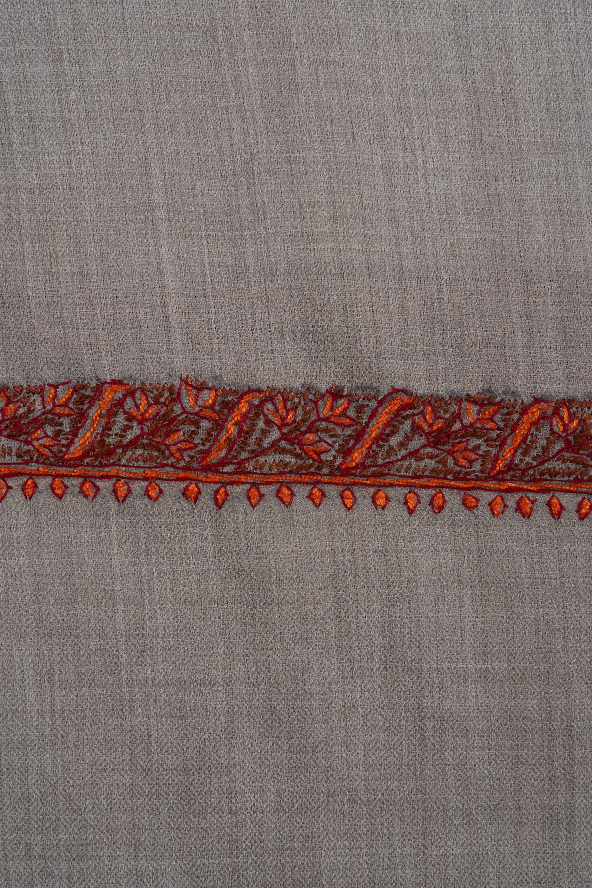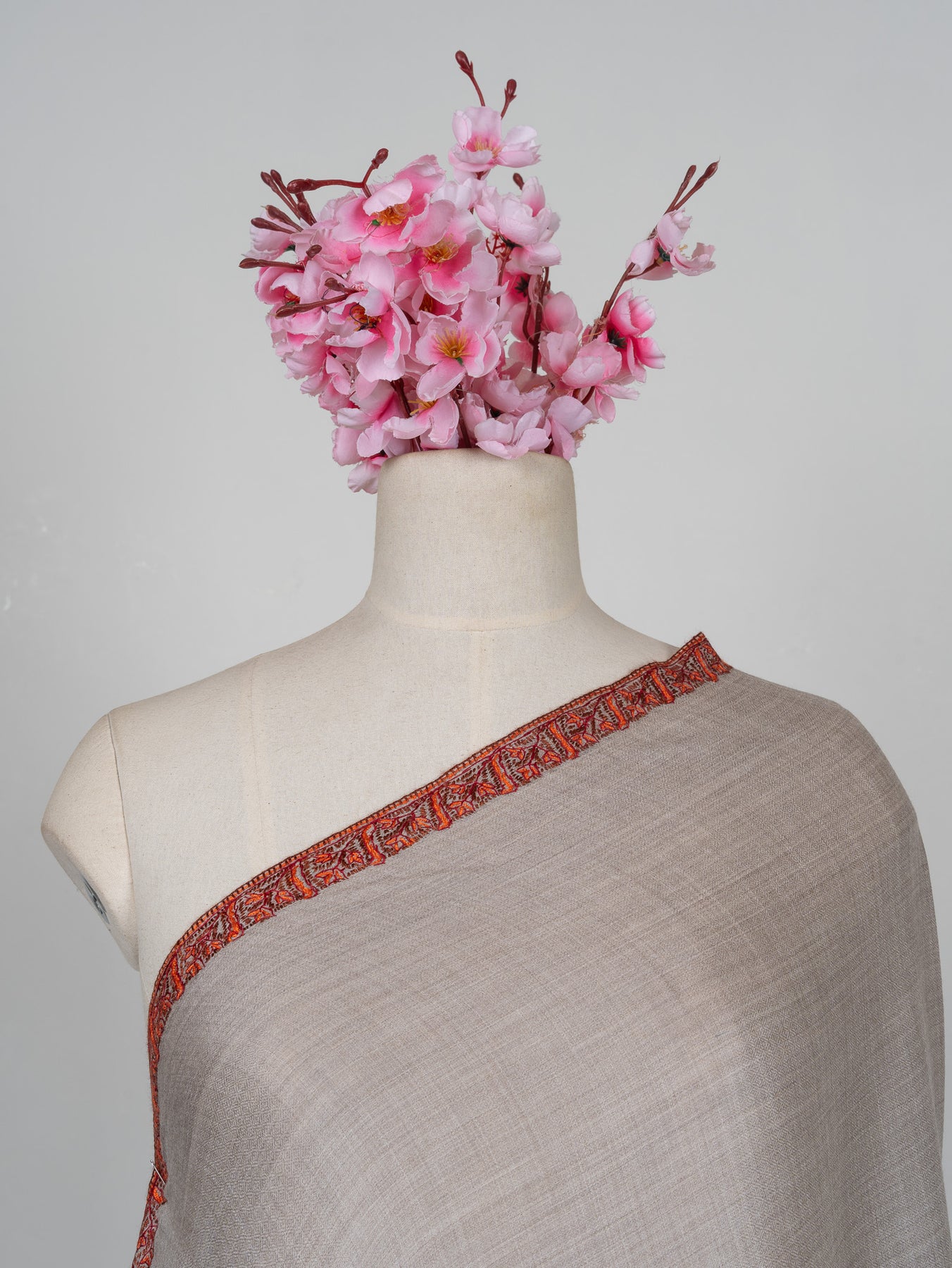 This 2.5 yards Sozni Hand Embroidered Shawl comes in a soothing ash grey tone highlighted with delicate blush-toned border embroidery. The combination of muted elegance and fine detailing creates a graceful look that feels both modern and rooted in tradition.