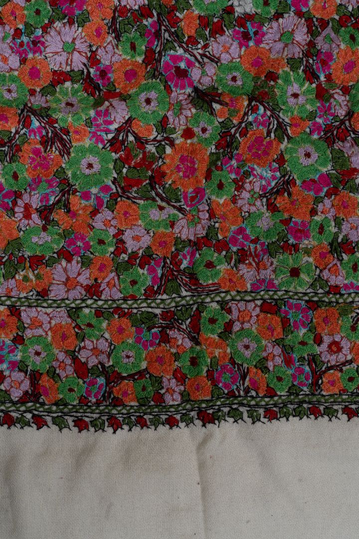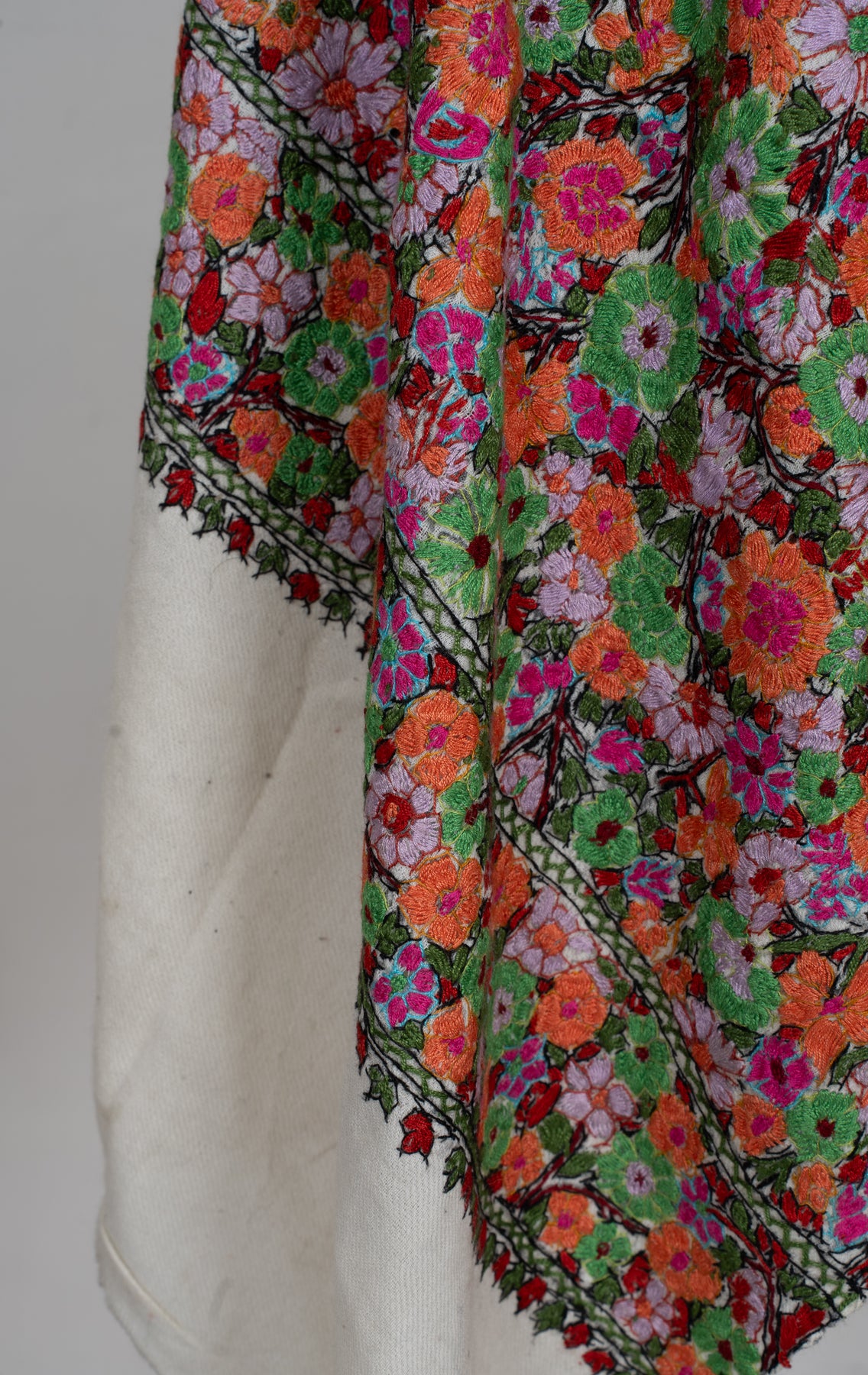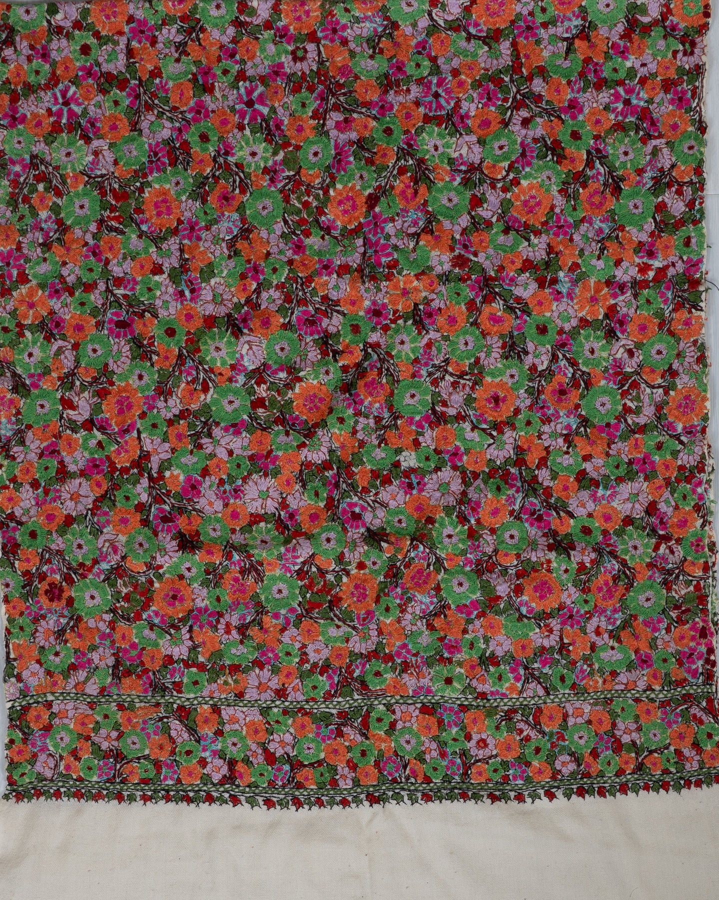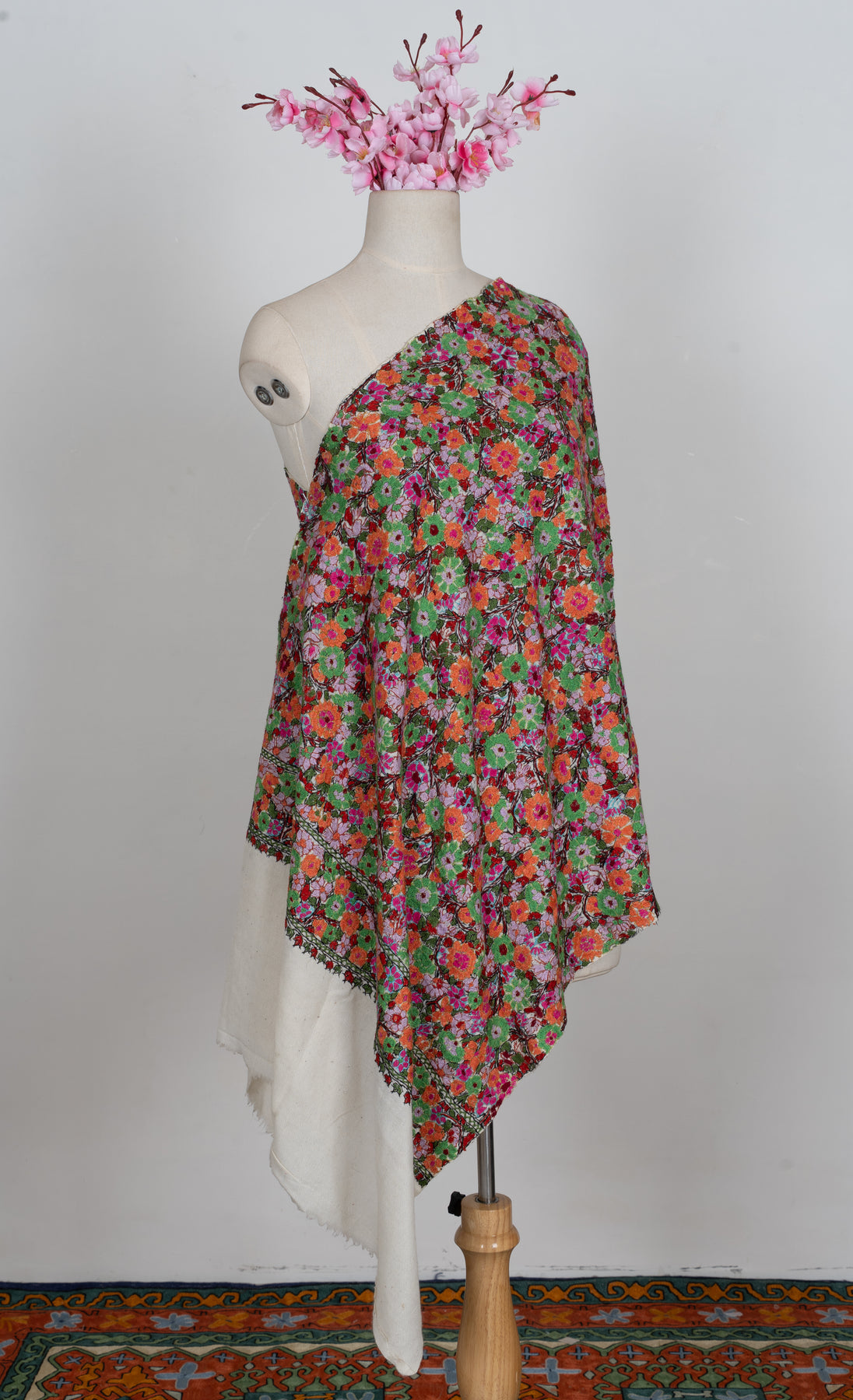 Set on a soft, light-toned merino wool base, this scarf is covered with an all-over floral jaal inspired by traditional Kashmiri papier-mâché patterns. Bright greens, coral oranges, blush pinks, lilacs, and hints of crimson are embroidered in close harmony, creating a surface that feels almost garden-like in its abundance. Dark vine outlines weave through the florals, lending structure and definition to the otherwise free-flowing composition.
