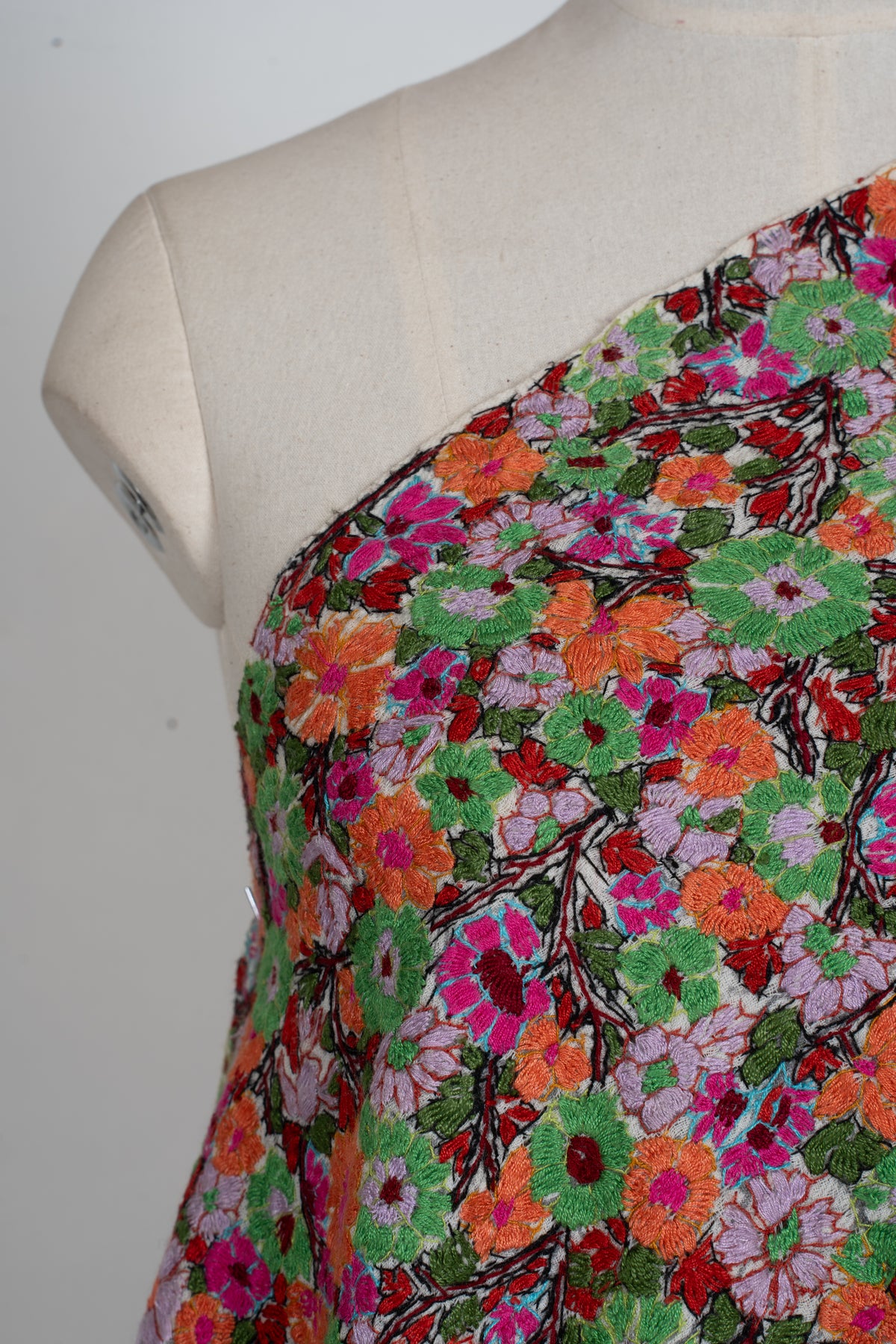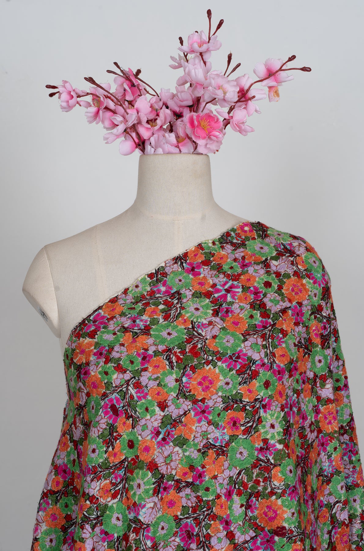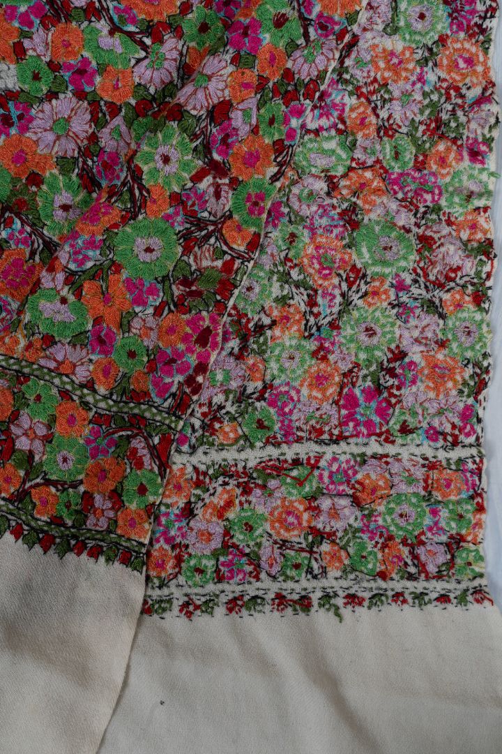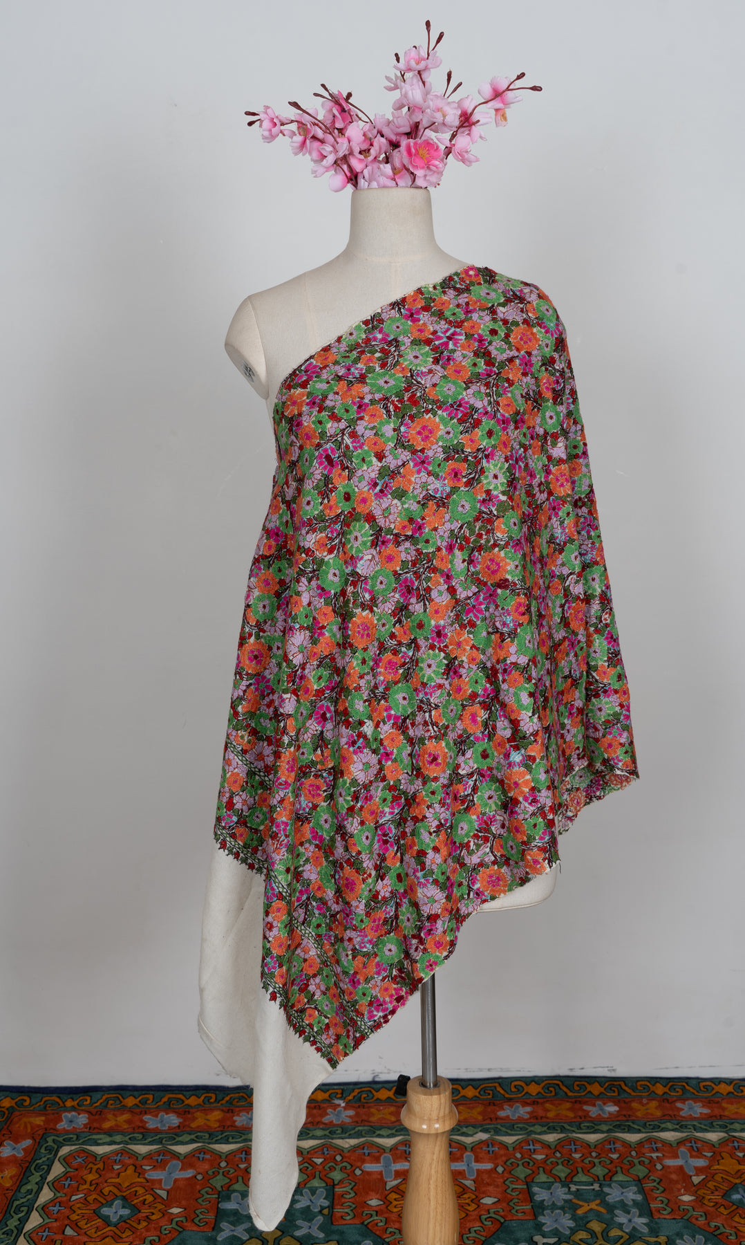 Set on a soft, light-toned merino wool base, this scarf is covered with an all-over floral jaal inspired by traditional Kashmiri papier-mâché patterns. Bright greens, coral oranges, blush pinks, lilacs, and hints of crimson are embroidered in close harmony, creating a surface that feels almost garden-like in its abundance. Dark vine outlines weave through the florals, lending structure and definition to the otherwise free-flowing composition.