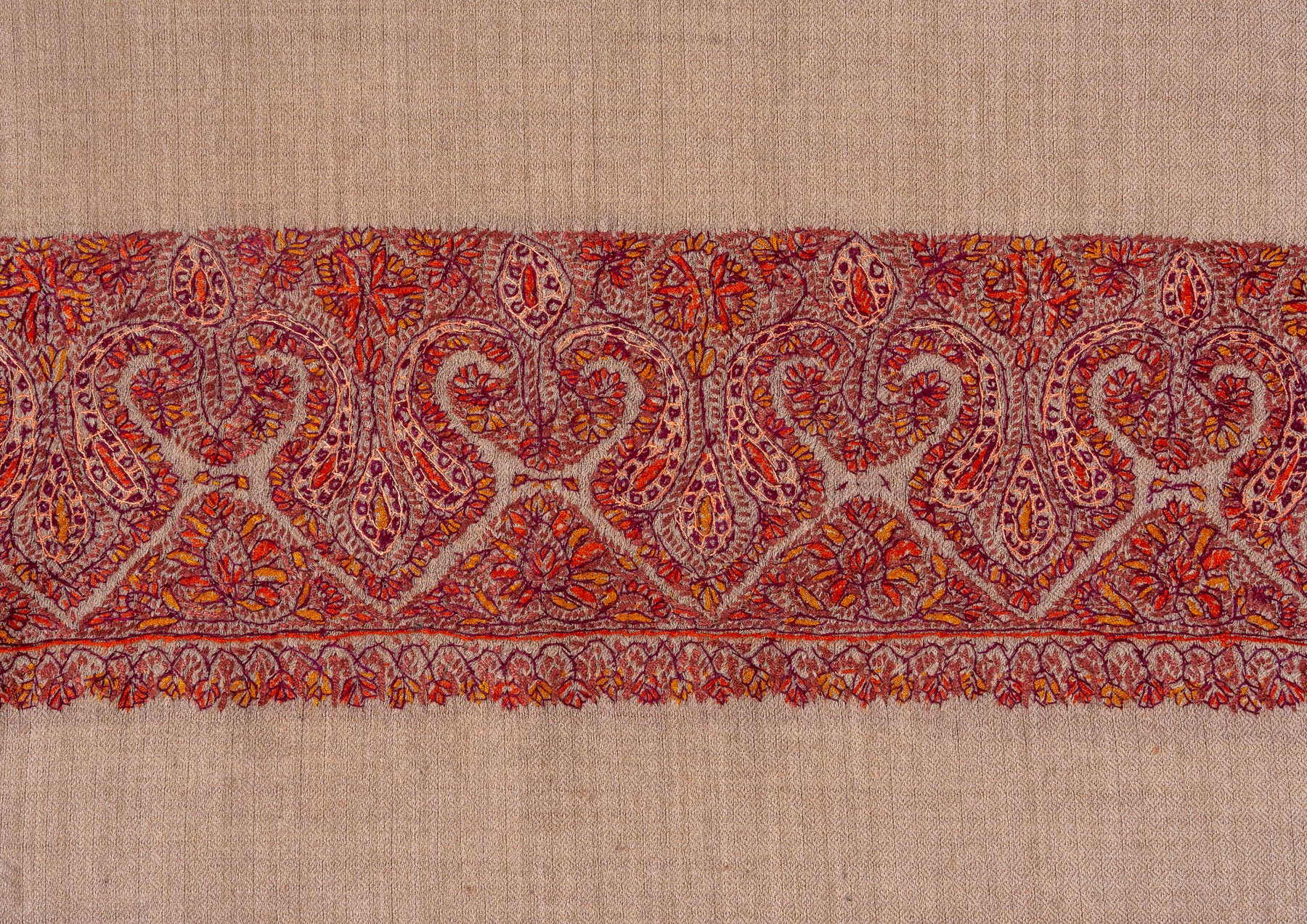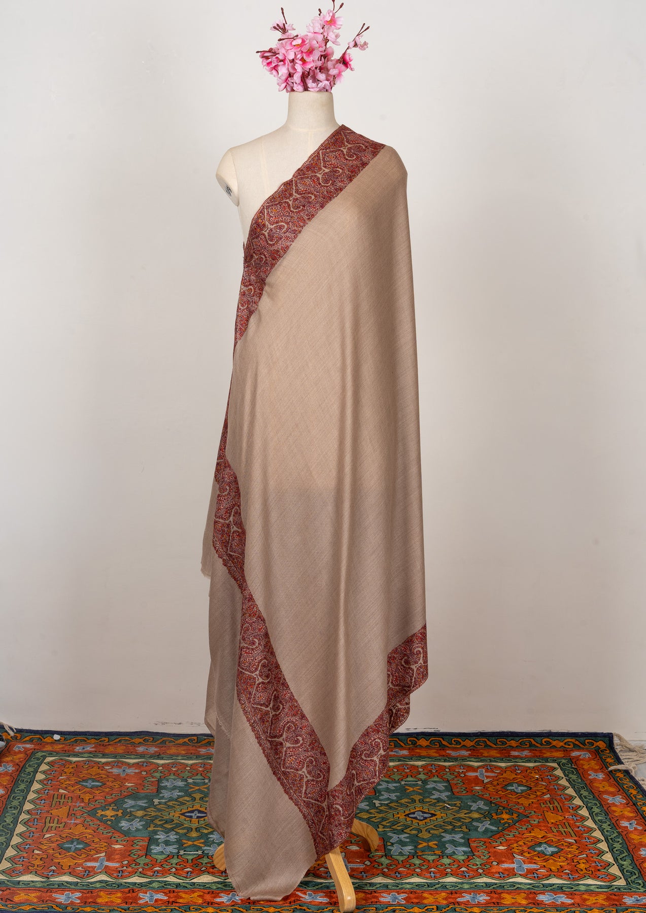 Tawny Grace carries the warmth of sunlit sands, delicately bordered with intricate Sozni embroidery in shades of crimson and gold. The classic paisley motifs give it a timeless Kashmiri touch, exuding effortless refinement.