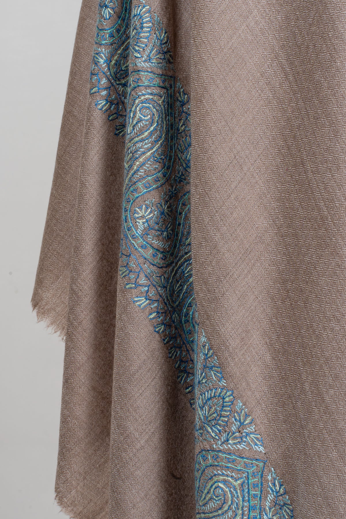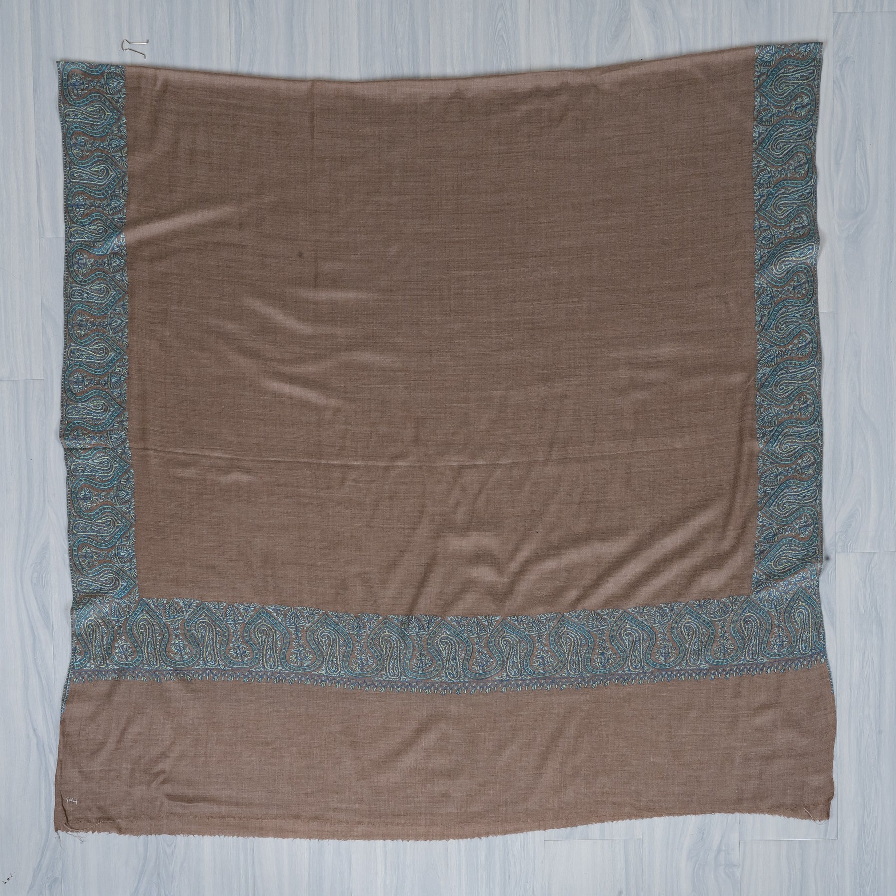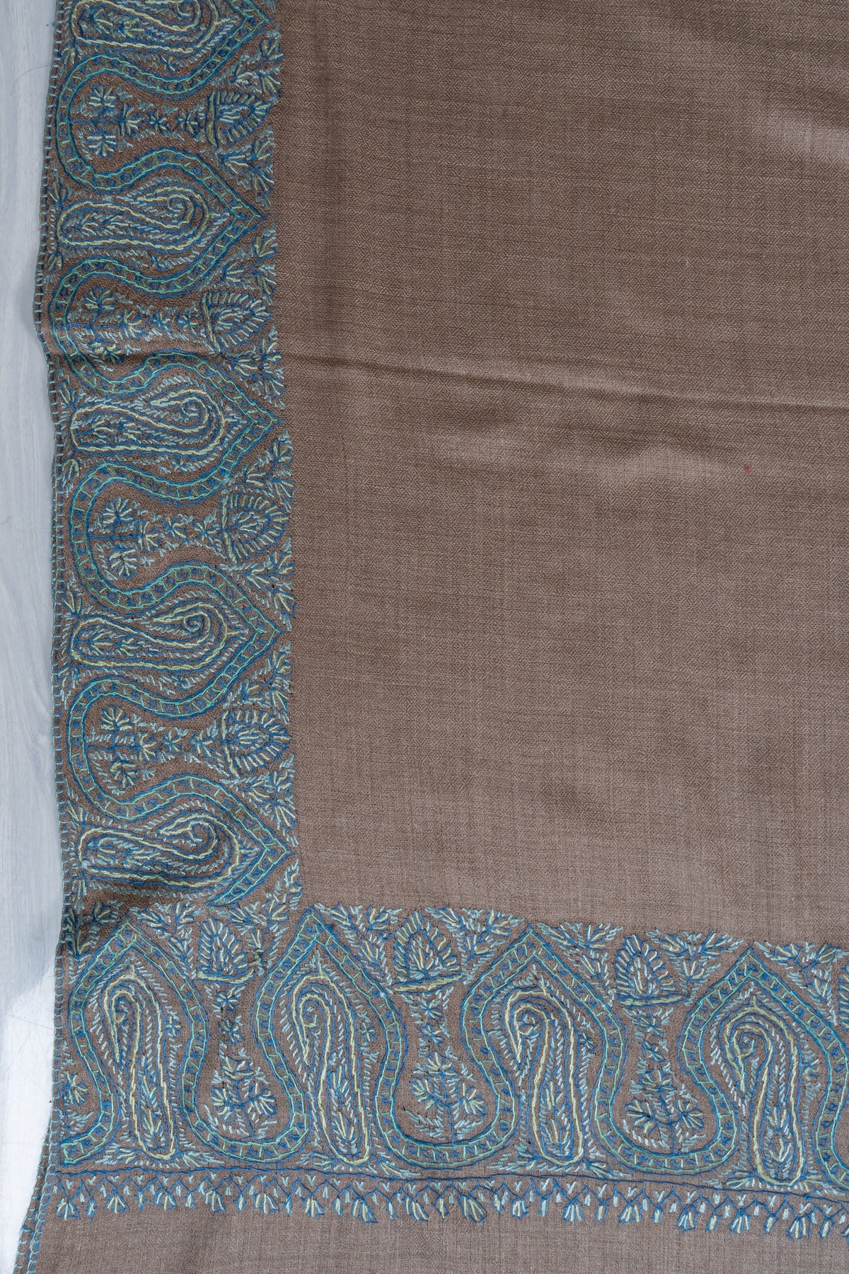 Teal Edge Taupe: Merino Wool Hand Embroidered 2.5 Yards Shawl