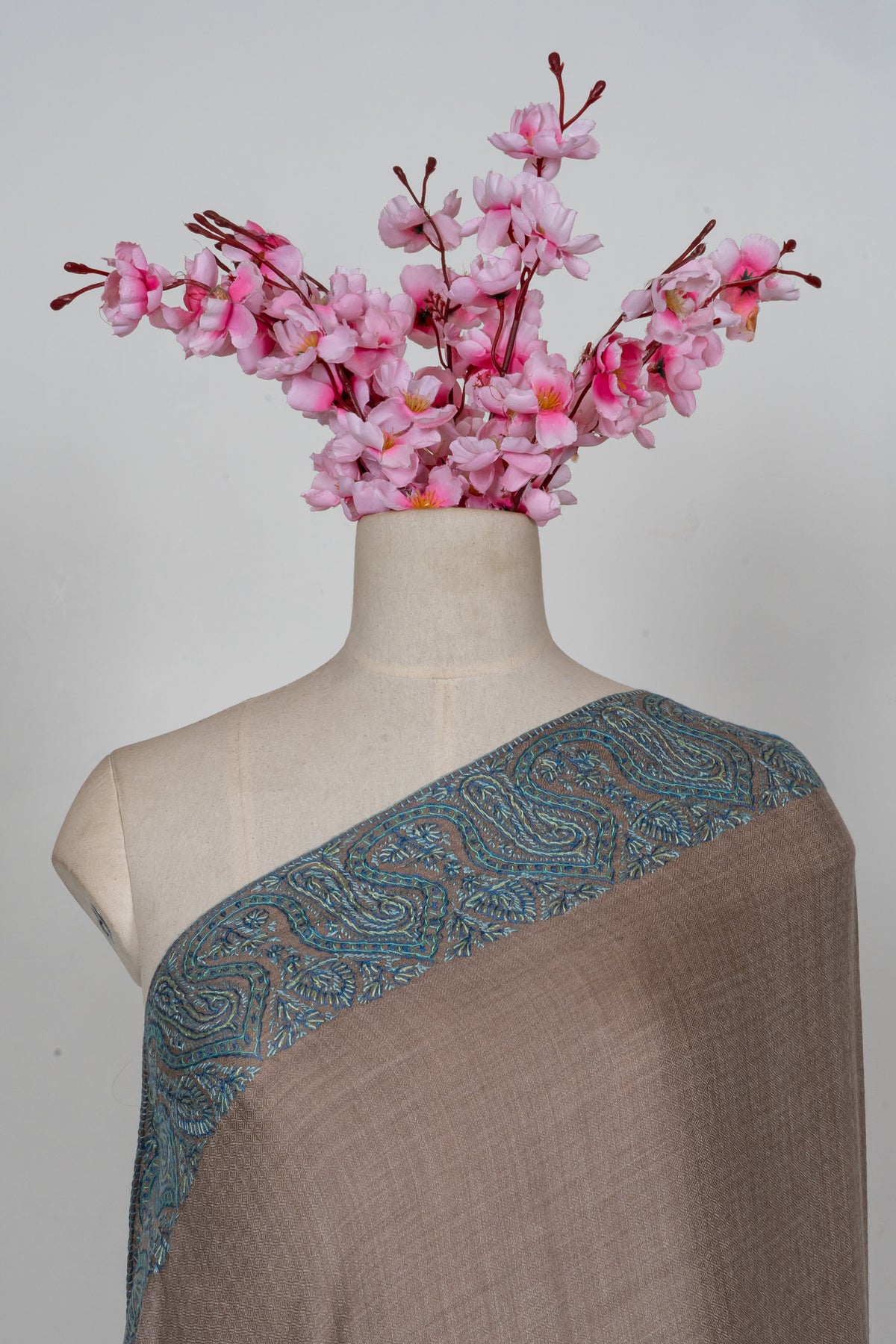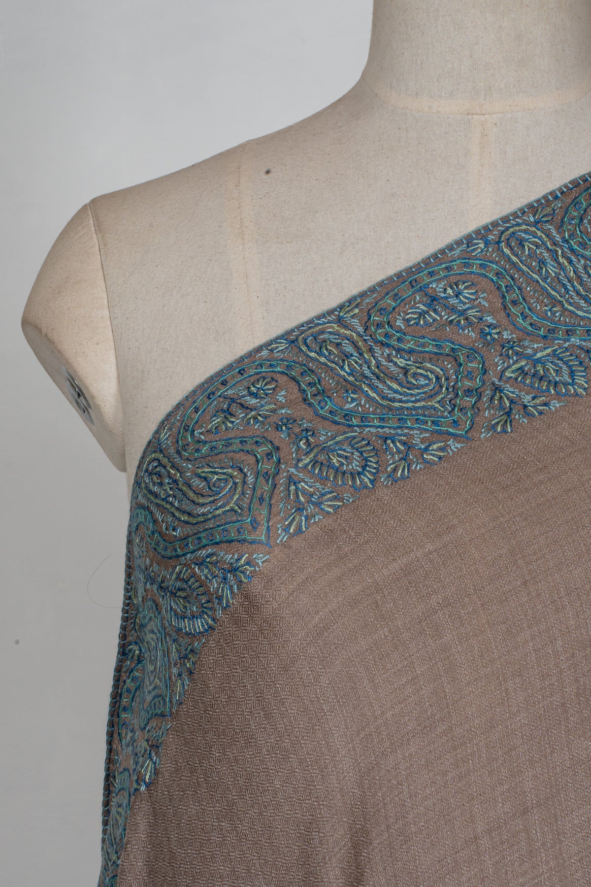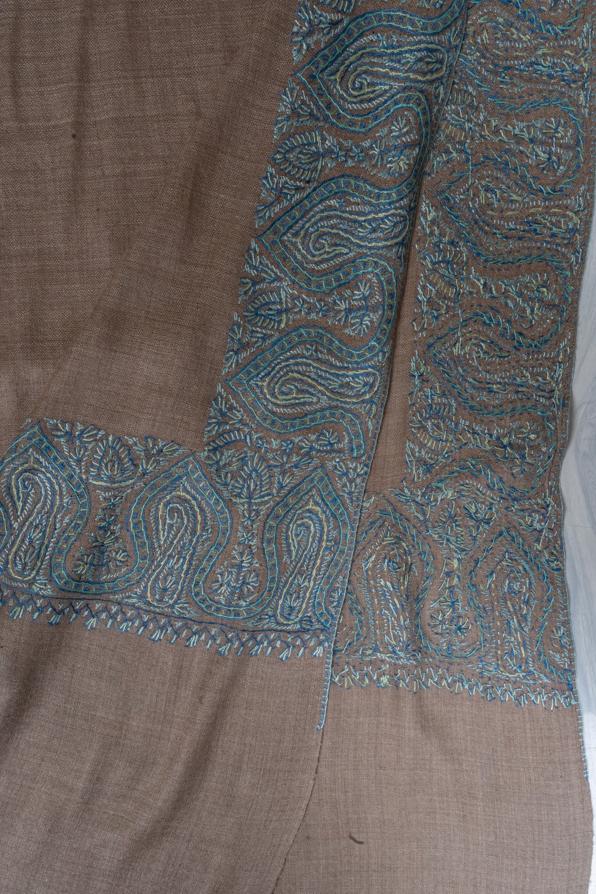 Teal Edge Taupe: Merino Wool Hand Embroidered 2.5 Yards Shawl