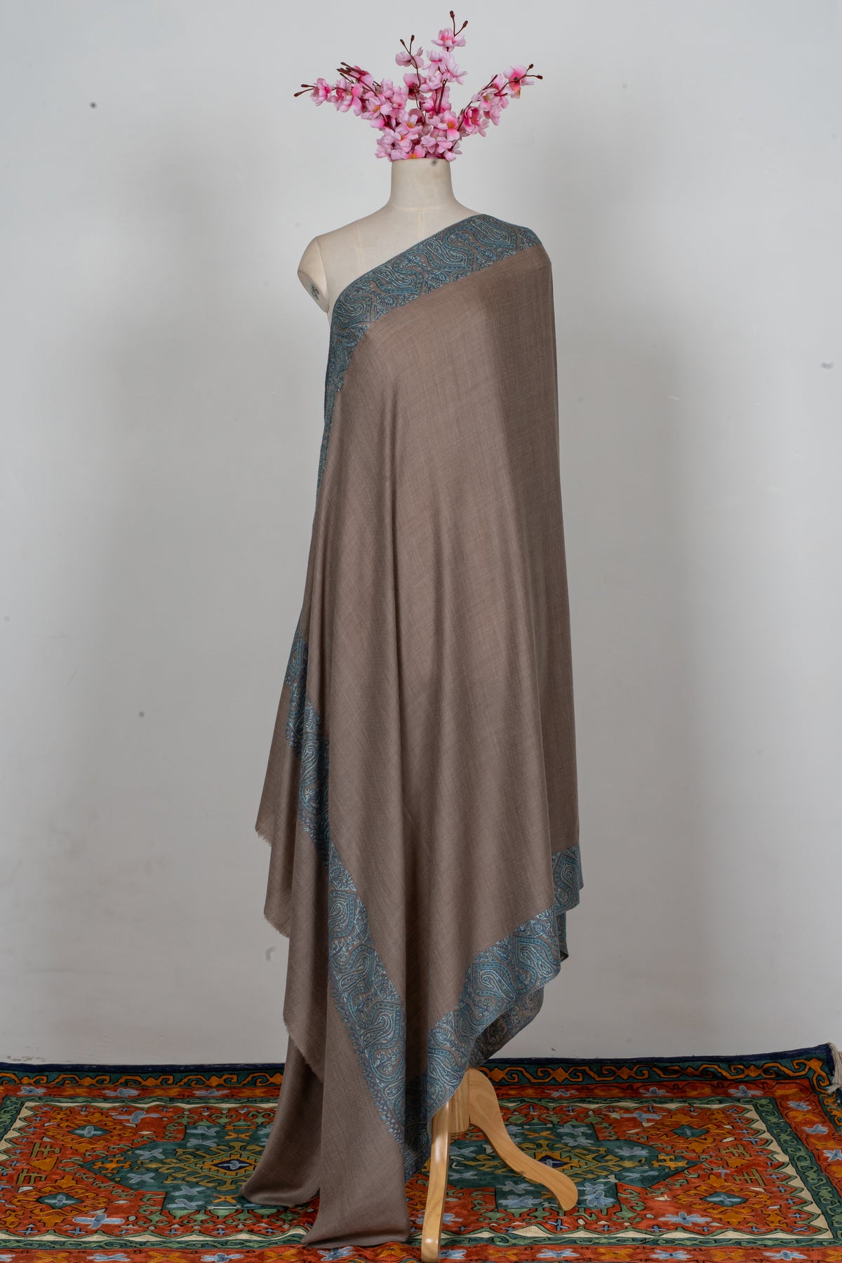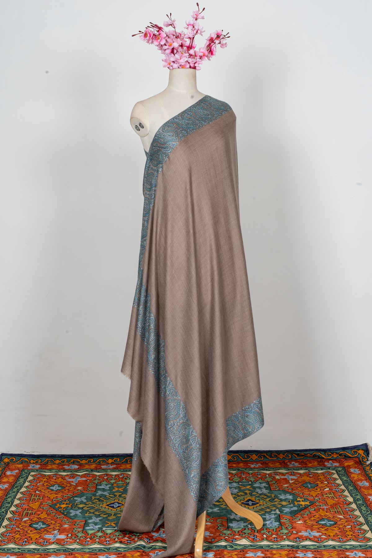 This Merino Wool Hand Embroidered 2.5 Yards shawl features a refined taupe base beautifully complemented by intricate Sozni embroidery in rich teal along the borders. The interplay between the earthy base and vibrant detailing creates a balanced aesthetic, blending subtlety with a touch of bold elegance.