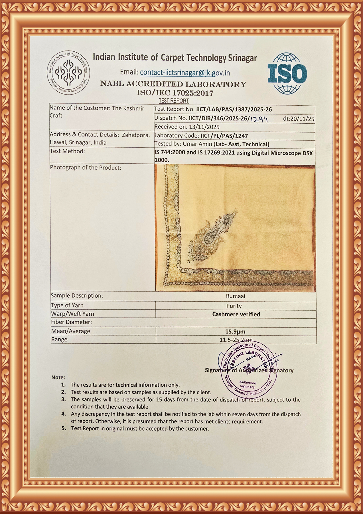 With every Cashmere shawl, you receive an ISO-certified Authentication Report from the Government of India. This official document scientifically verifies the purity of the Cashmere used in your piece.A guarantee of authenticity—crafted in Kashmir, certified by the highest authority.
