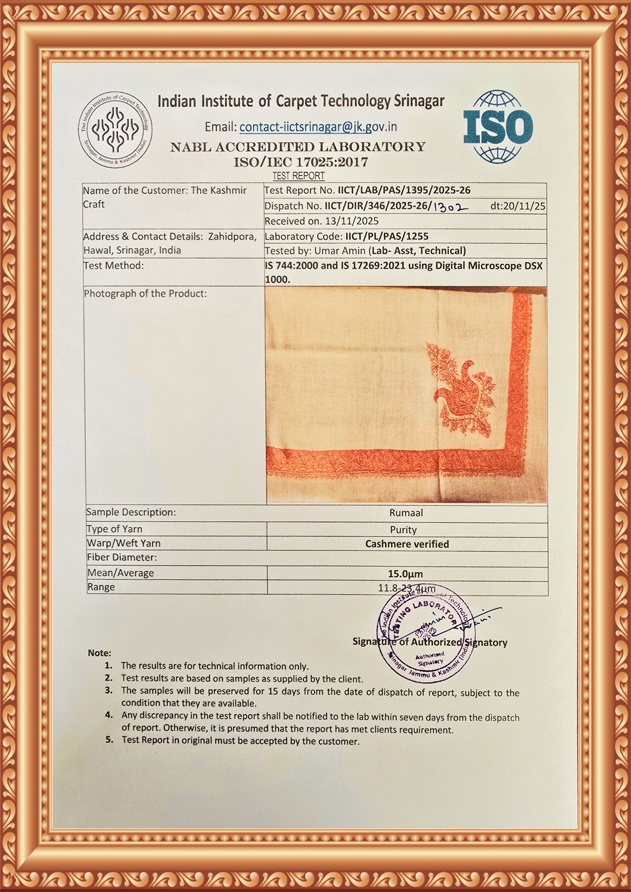 With every Cashmere shawl, you receive an ISO-certified Authentication Report from the Government of India. This official document scientifically verifies the purity of the Cashmere used in your piece.A guarantee of authenticity—crafted in Kashmir, certified by the highest authority.
