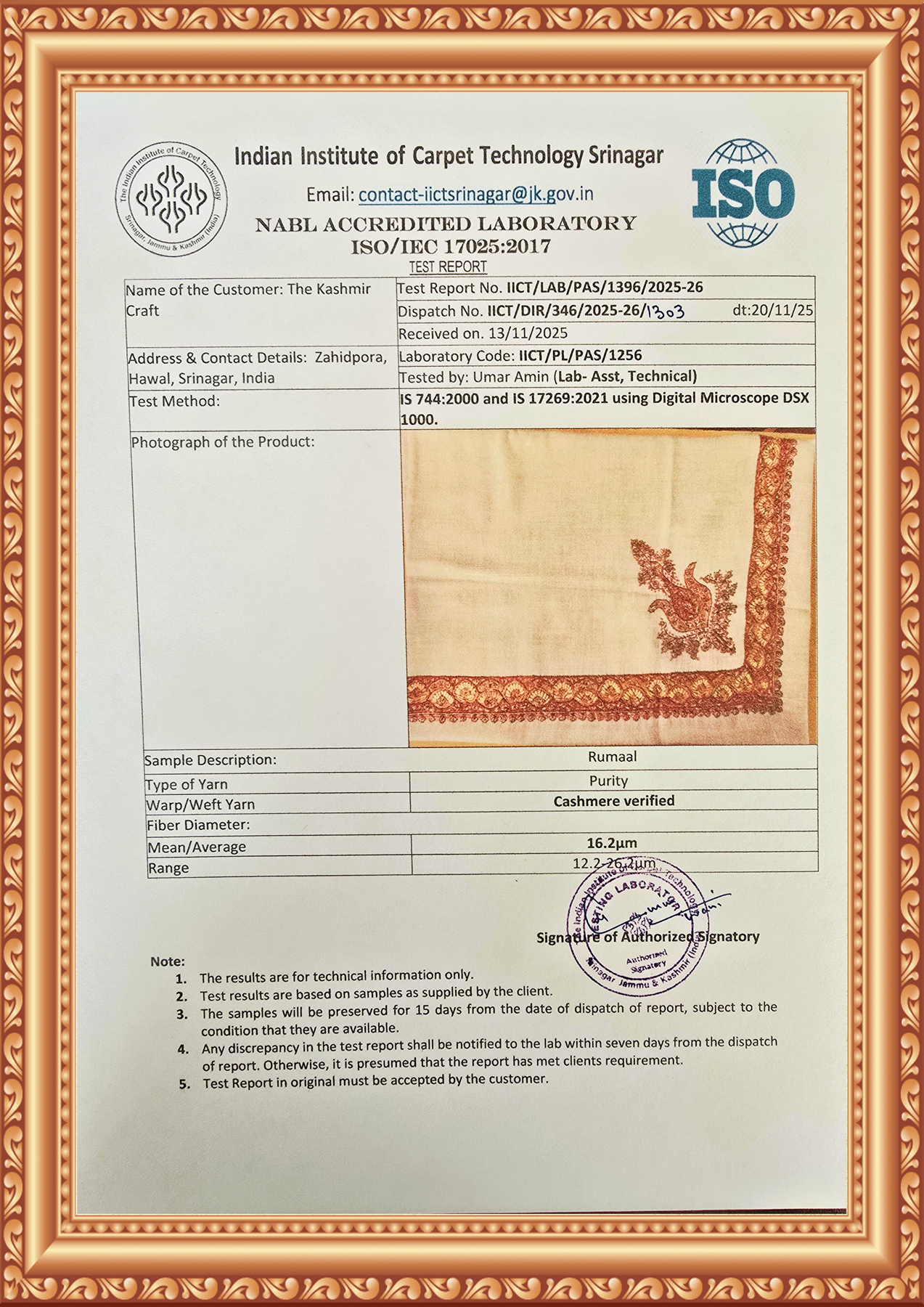 With every Cashmere shawl, you receive an ISO-certified Authentication Report from the Government of India. This official document scientifically verifies the purity of the Cashmere used in your piece.A guarantee of authenticity—crafted in Kashmir, certified by the highest authority.