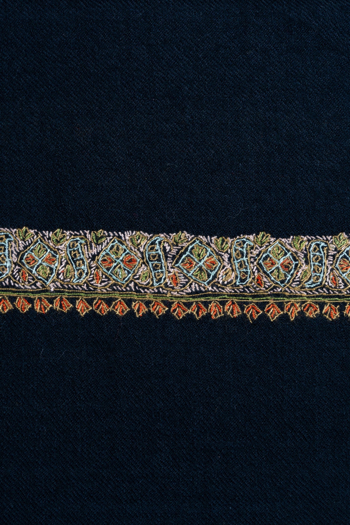 This Sozni Hand Embroidered Pashmina presents a striking midnight black base finished with a rich gold-toned embroidered edge that frames the shawl with quiet luxury. The deep solid body paired with the luminous border creates a bold, elegant statement.