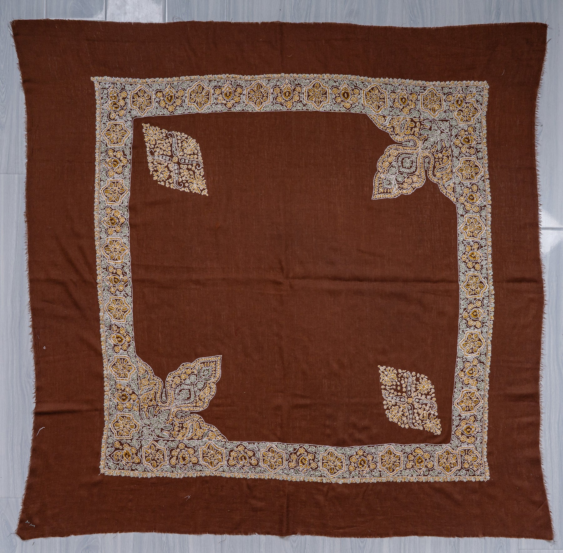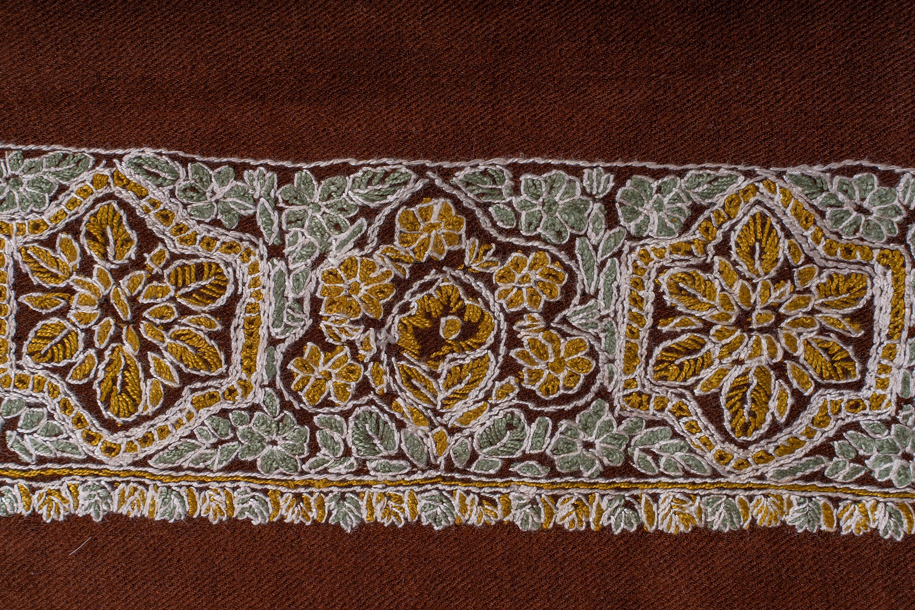 The embroidery is Sozni, worked in tones of golden amber, ivory, and olive, creating a bold lattice border and an ornate diamond-shaped central motif over a warm chestnut-brown base. Striking and elegant, it blends heritage with modern poise.