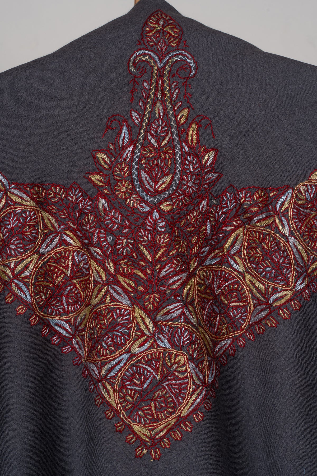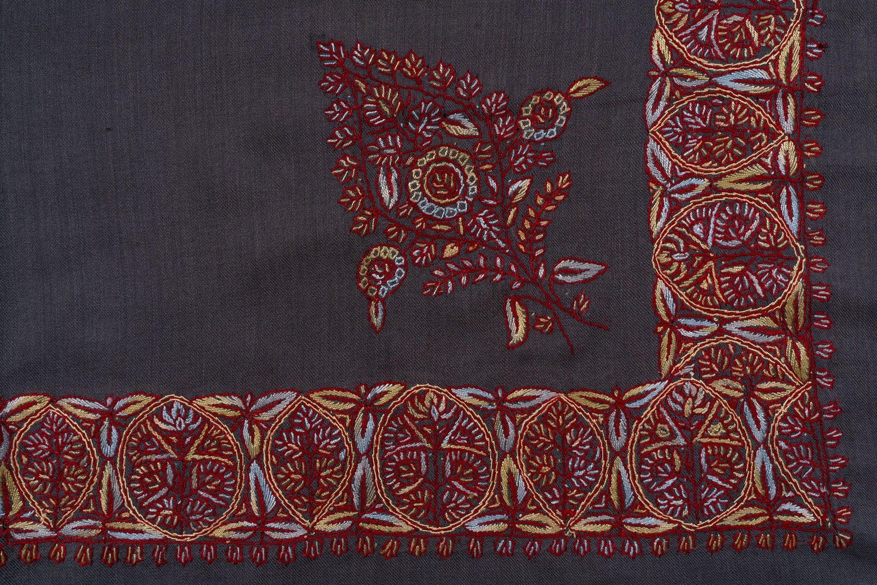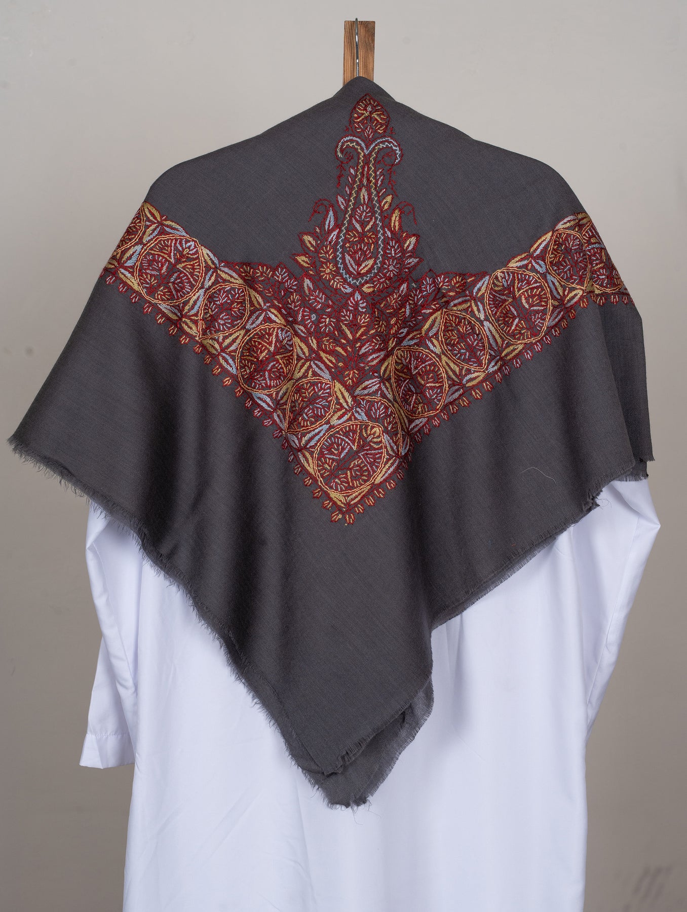 Celebrate refined artistry with the Charcoal Crimson Rumal — Sozni Hand Embroidered, a testament to Kashmir’s intricate craftsmanship. Made from 120-count merino wool, it is luxuriously soft, breathable, and feather-light. The Rumal spans 54 inches, perfect for styling as a tarha/hijab or draping elegantly over the shoulders.