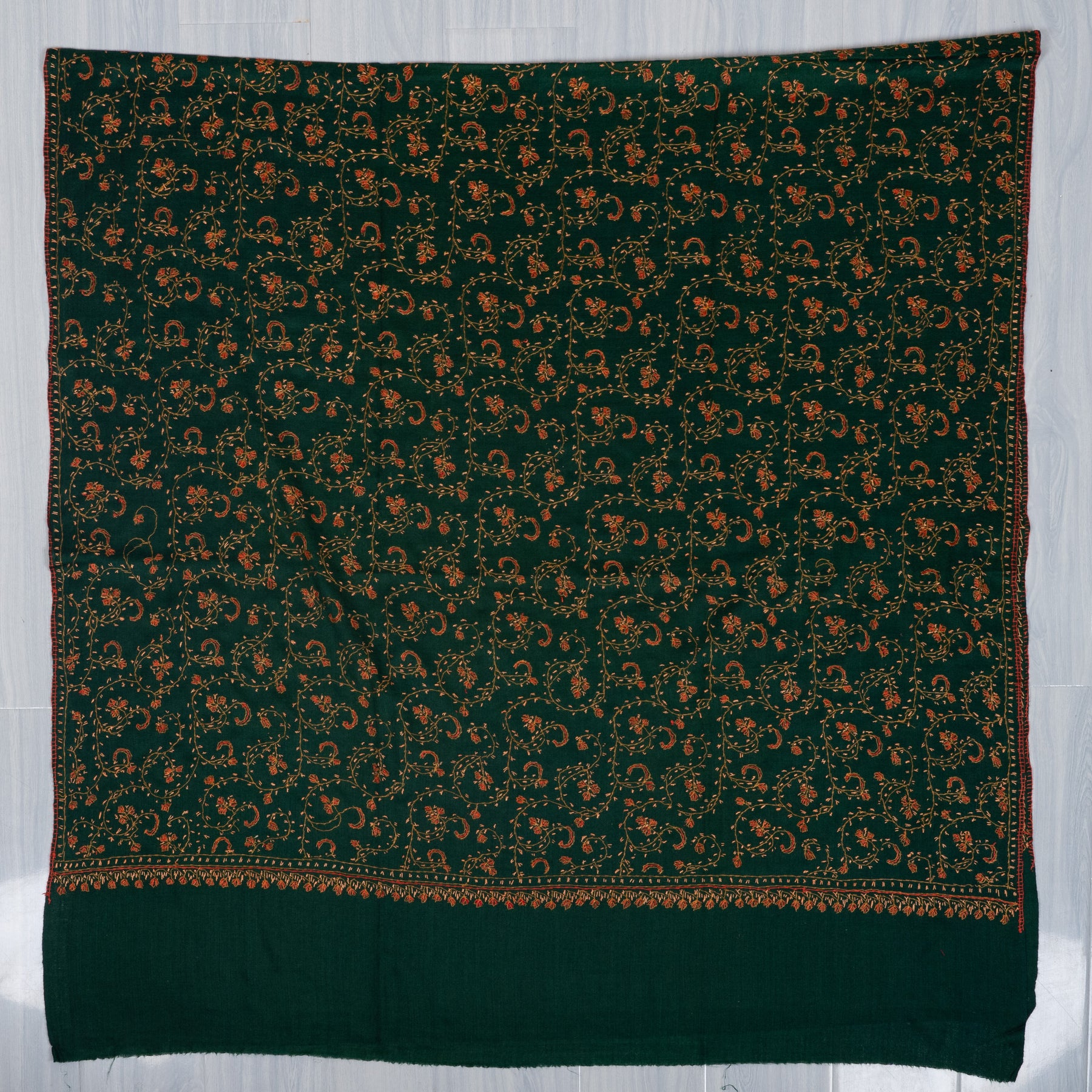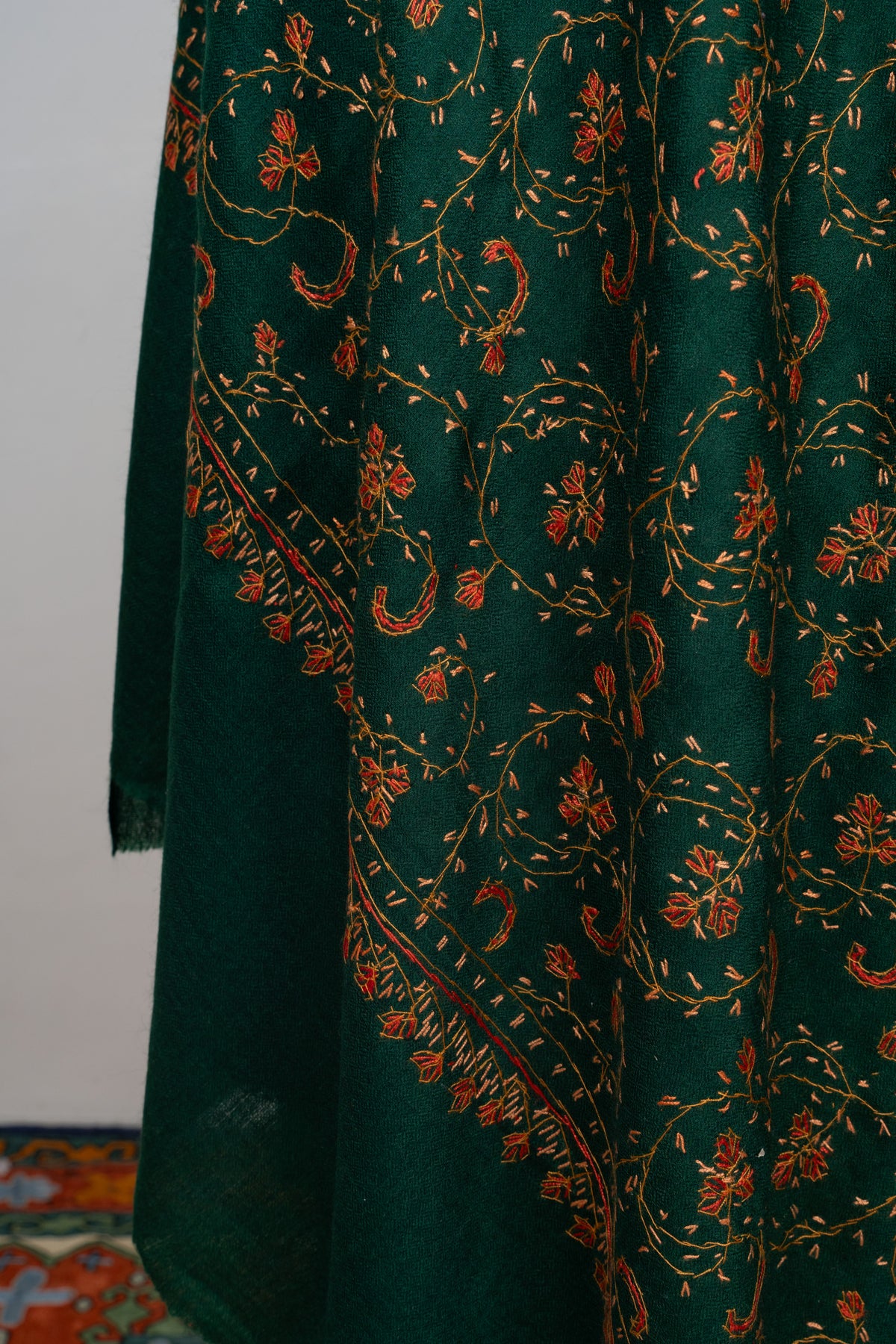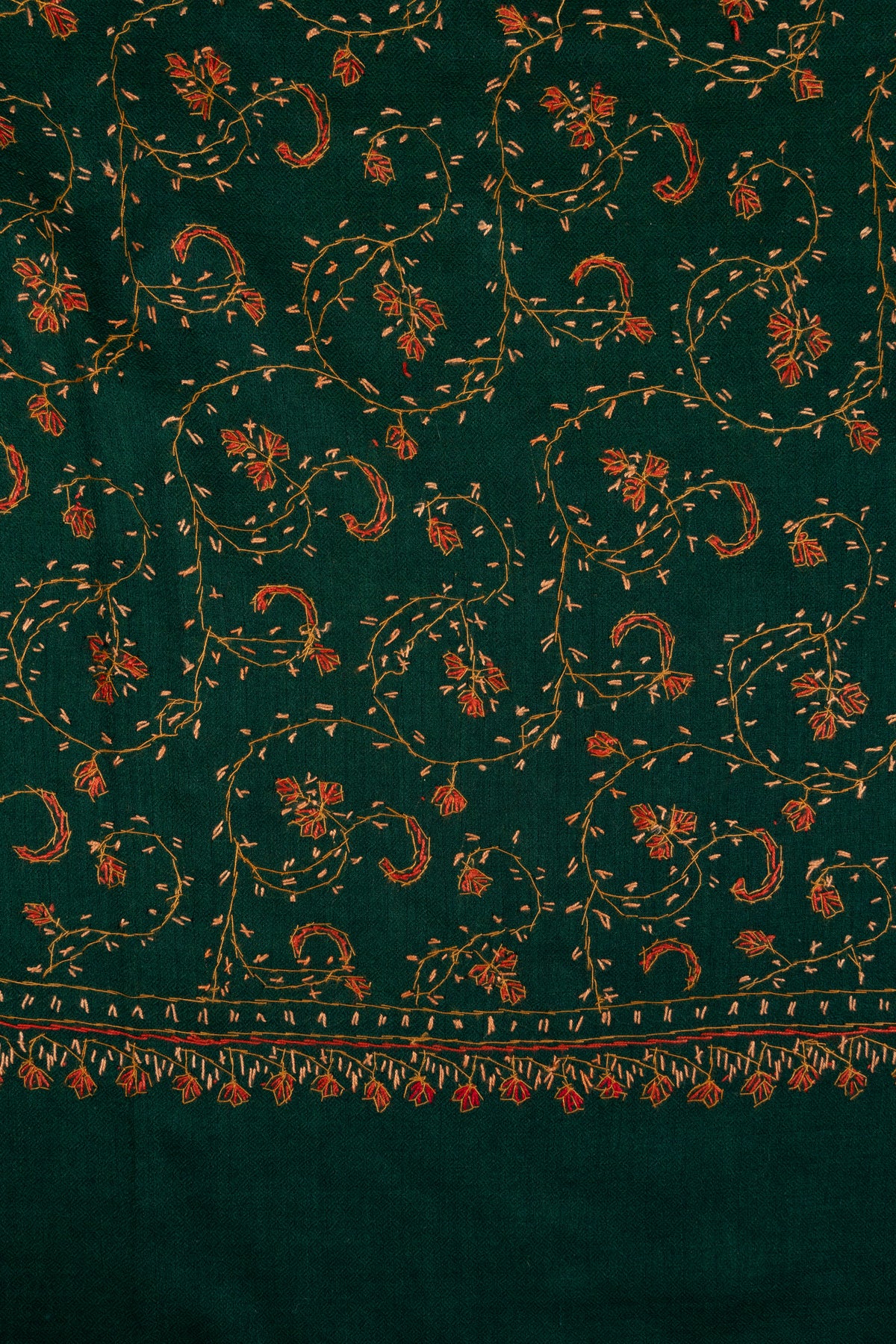 Emerald Heritage Bloom: Merino wool 2.5 Yards Sozni Hand Embroidered Shawl