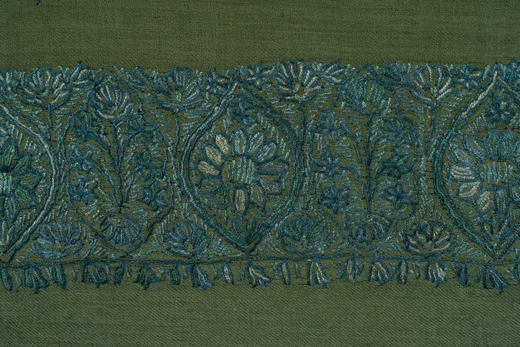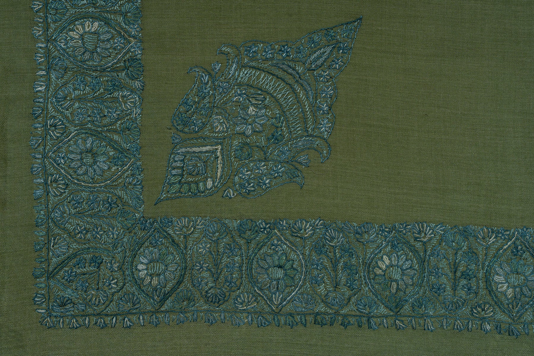 The deep green base is accentuated by detailed Sozni embroidery in cool teal tones, creating a leafy lattice pattern that celebrates the harmony of nature and craftsmanship.