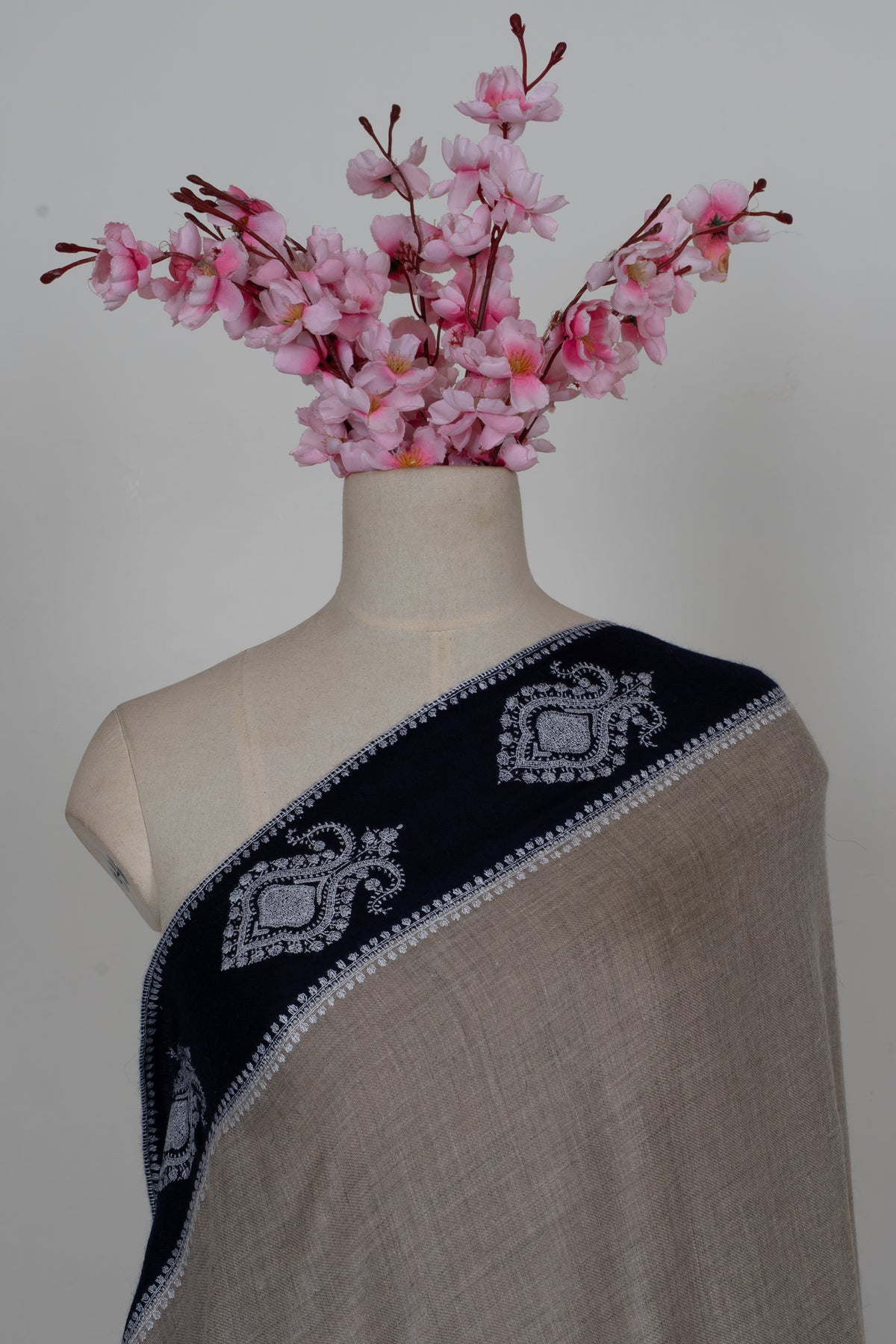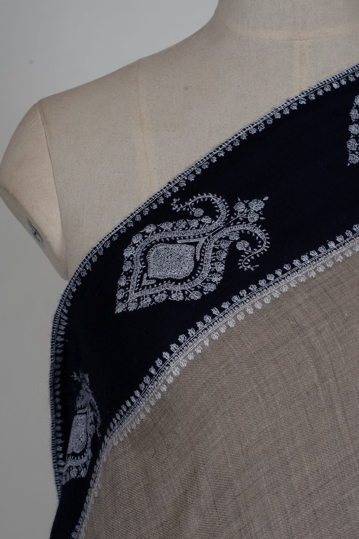 Its bold yet graceful contrast makes it perfect for statement styling, whether layered over evening attire or worn as a refined accent during cooler days. This piece embodies modern sophistication while staying rooted in timeless Kashmiri artistry.