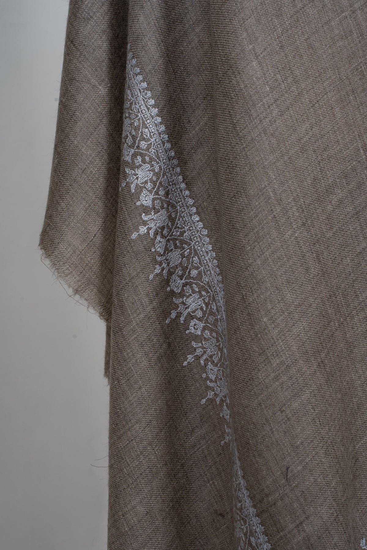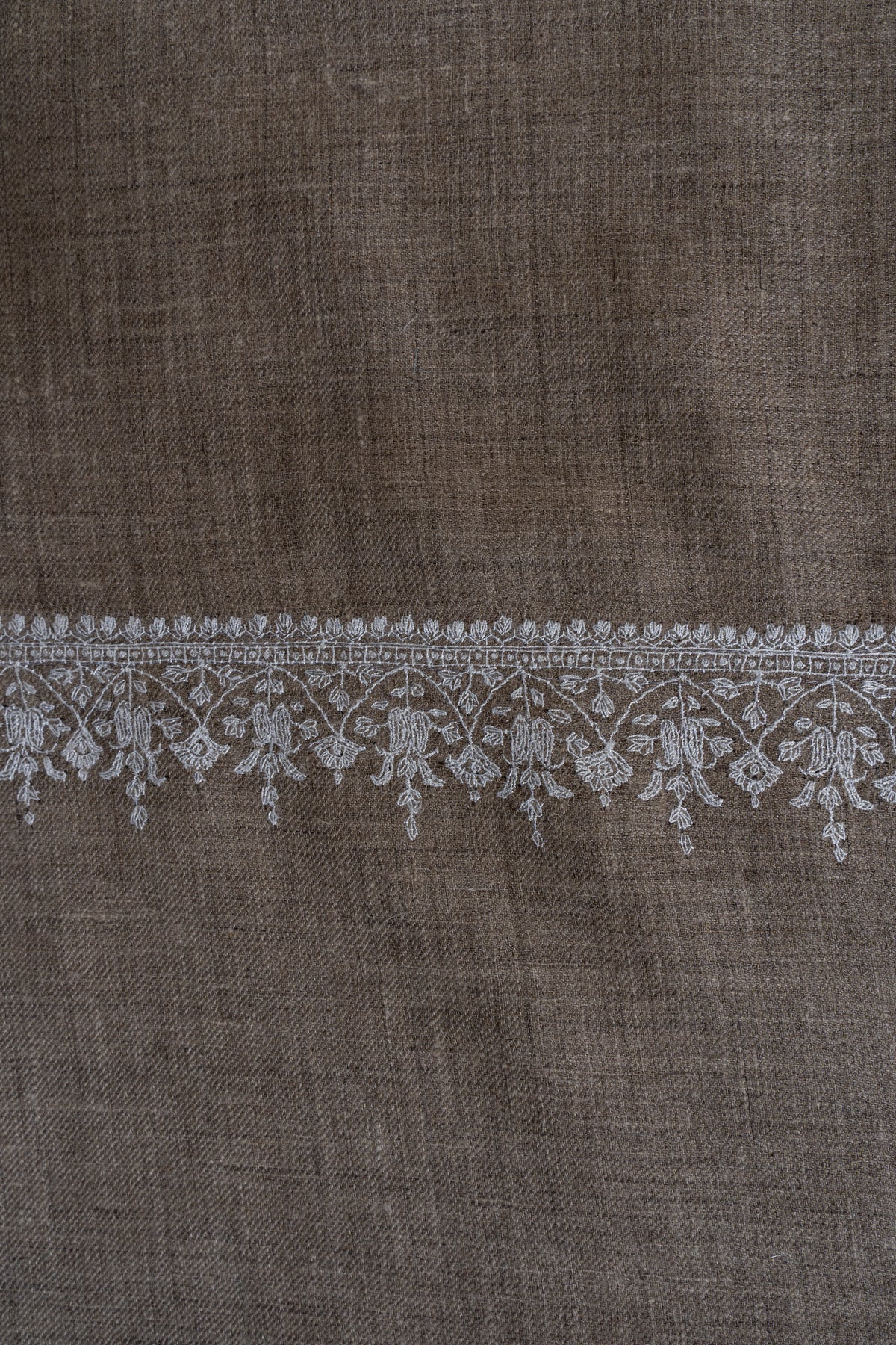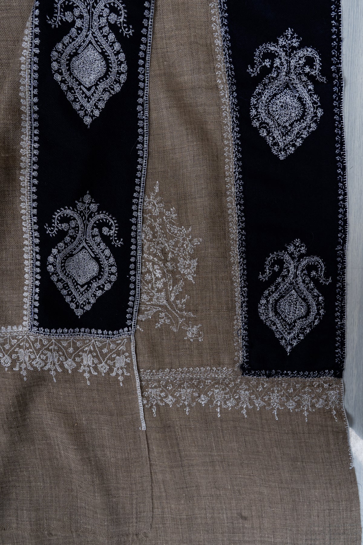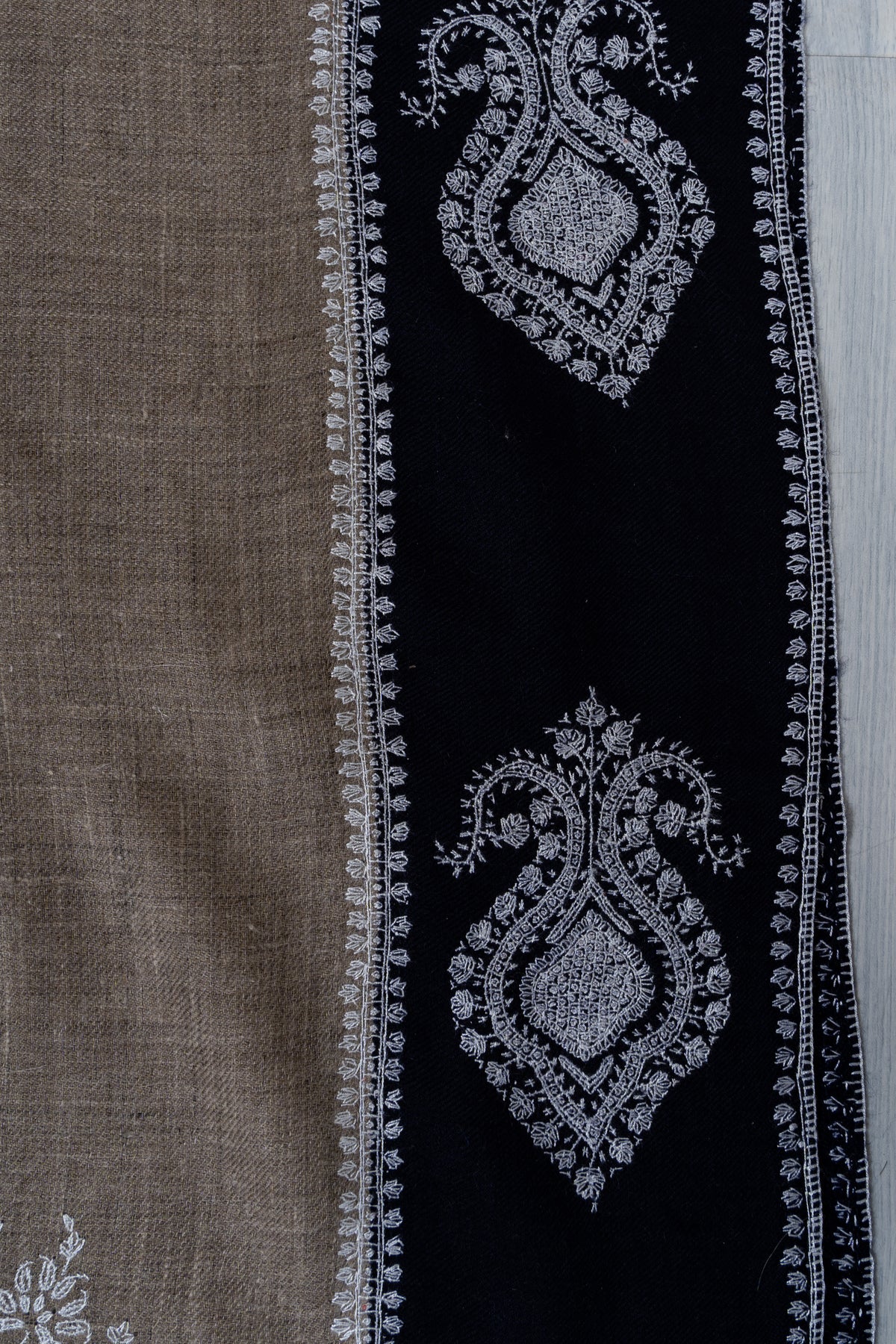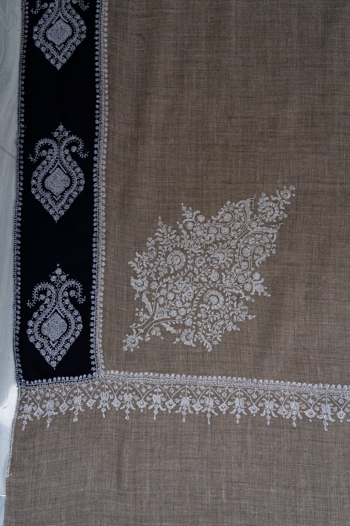 A harmonious interplay of tones defines this Pure Pashmina shawl, where a rich dark border meets a soft neutral base. The Sozni hand embroidery is thoughtfully placed, creating elegant motifs that highlight the shawl’s edges and corners with refined precision.