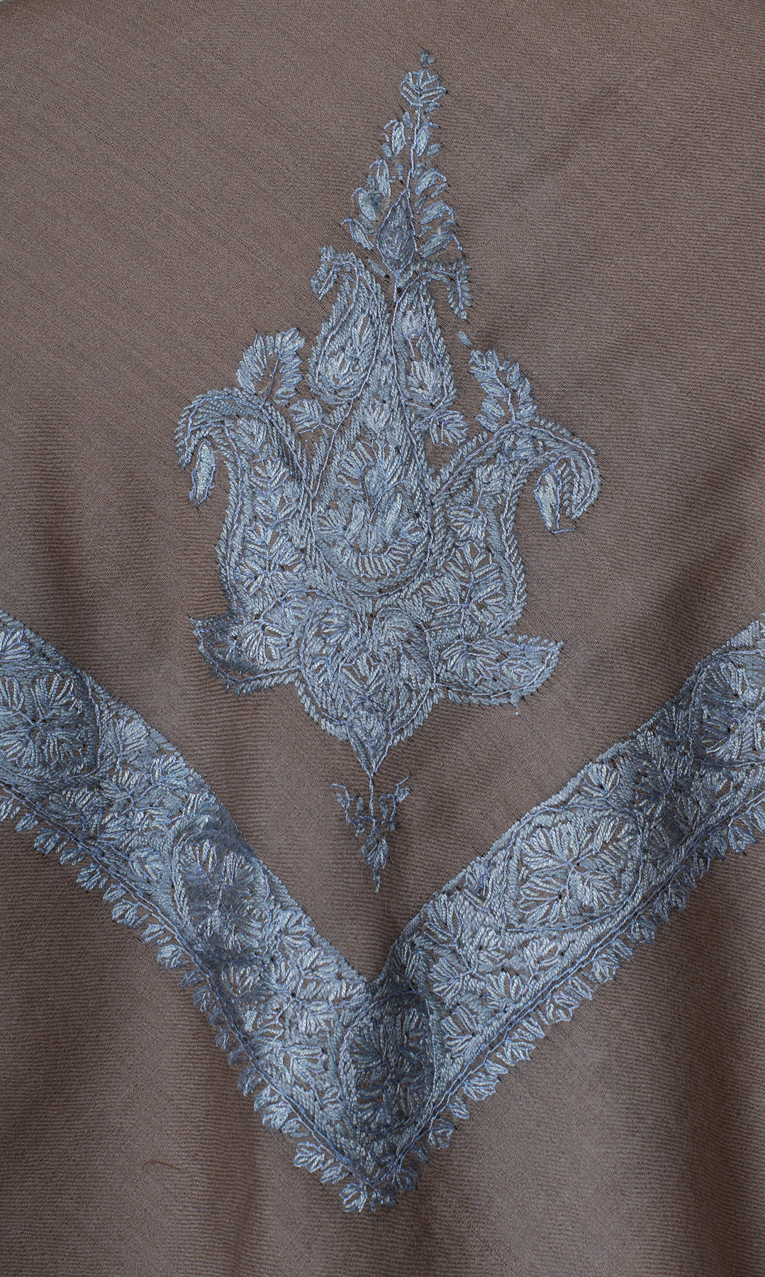 The embroidery is Sozni, worked in icy silver-blue threads forming a detailed border and grand central crest against a mocha-brown base. A graceful blend of warmth and cool tones, this Rumal exudes subtle sophistication and timeless artistry.