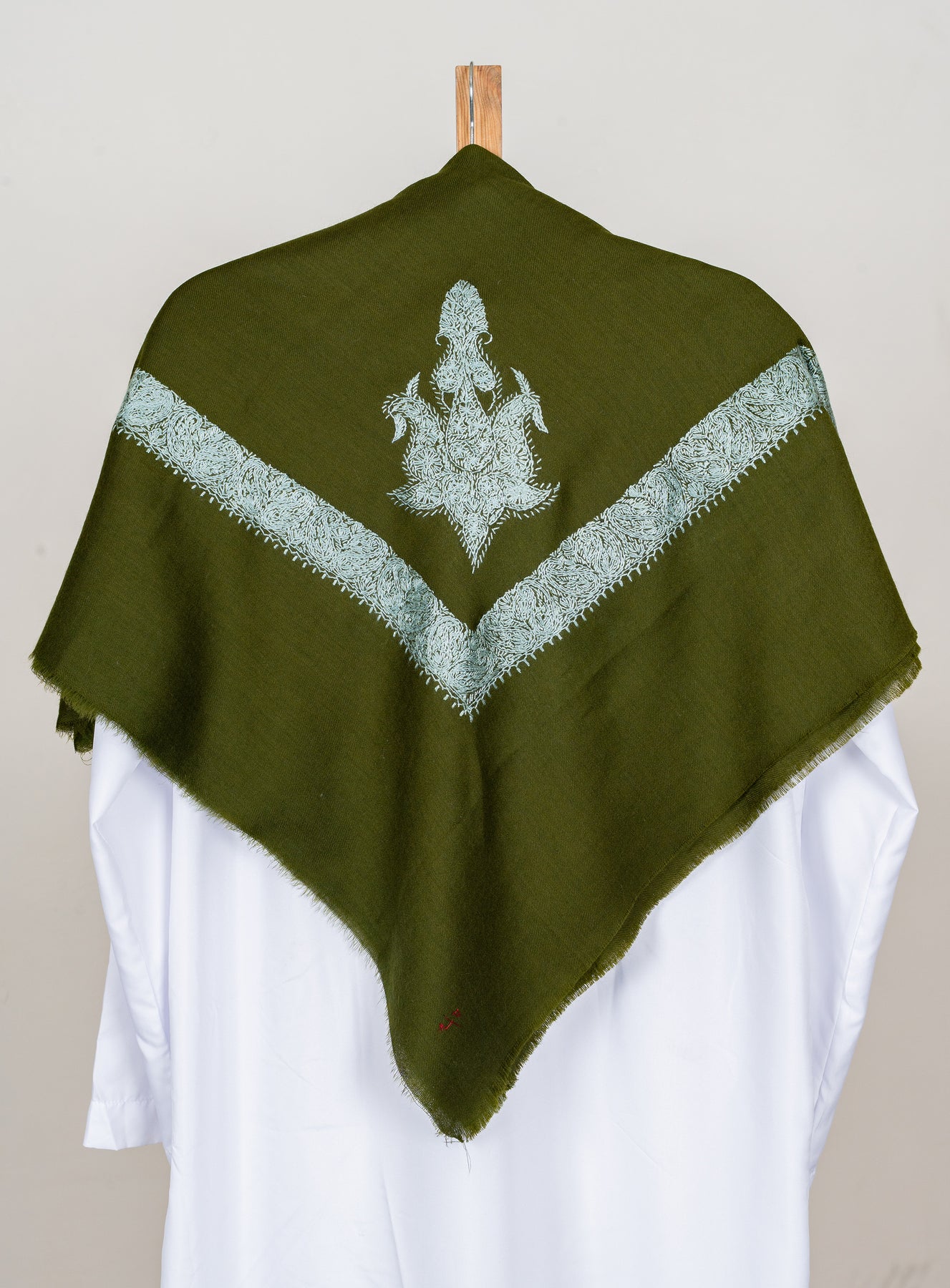 Step into graceful sophistication with the Olive Mist Rumal — Sozni Hand Embroidered, a piece inspired by earthy elegance. Woven from fine 120-count merino wool, this Rumal is light, airy, and luxuriously soft.