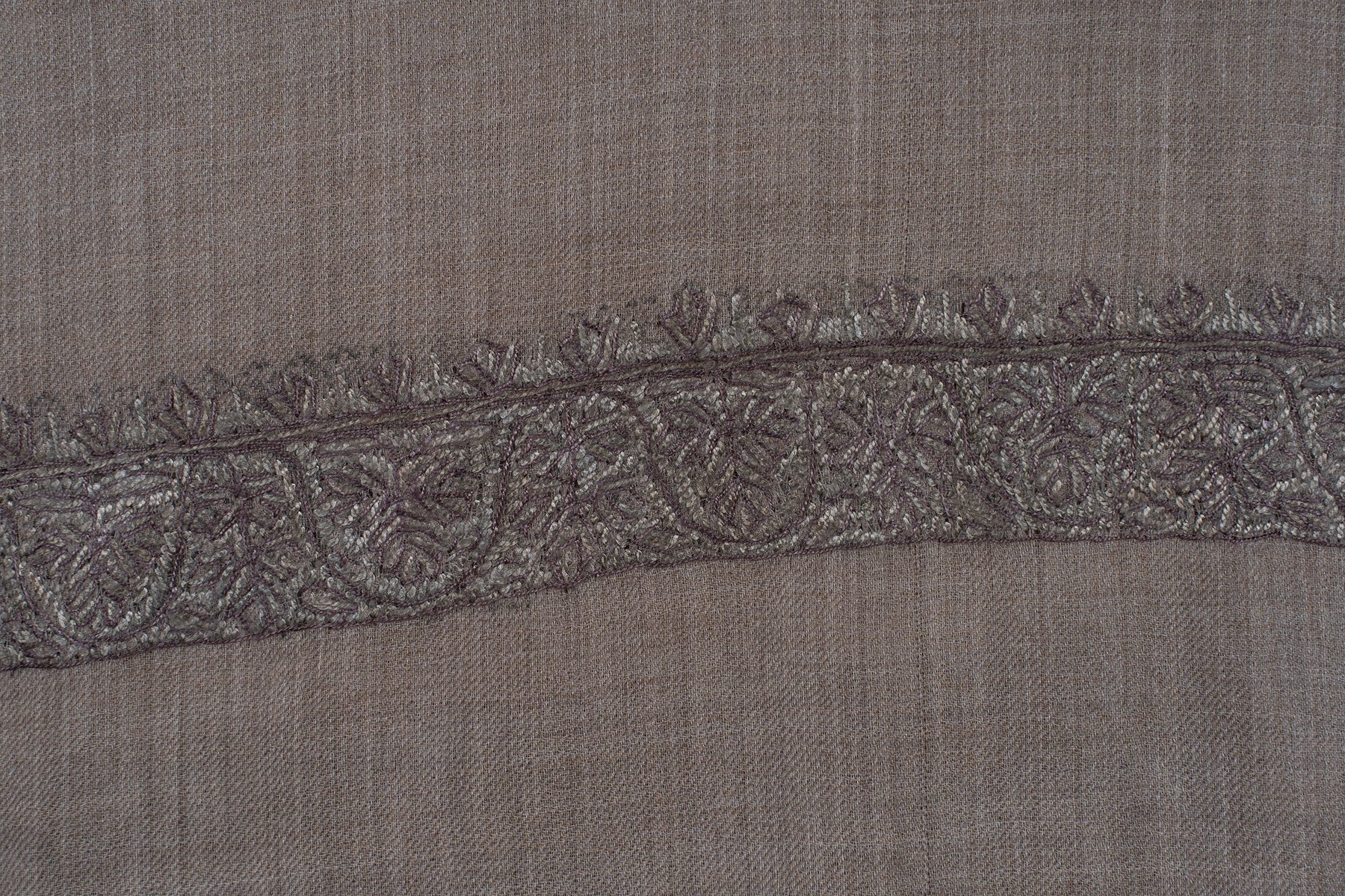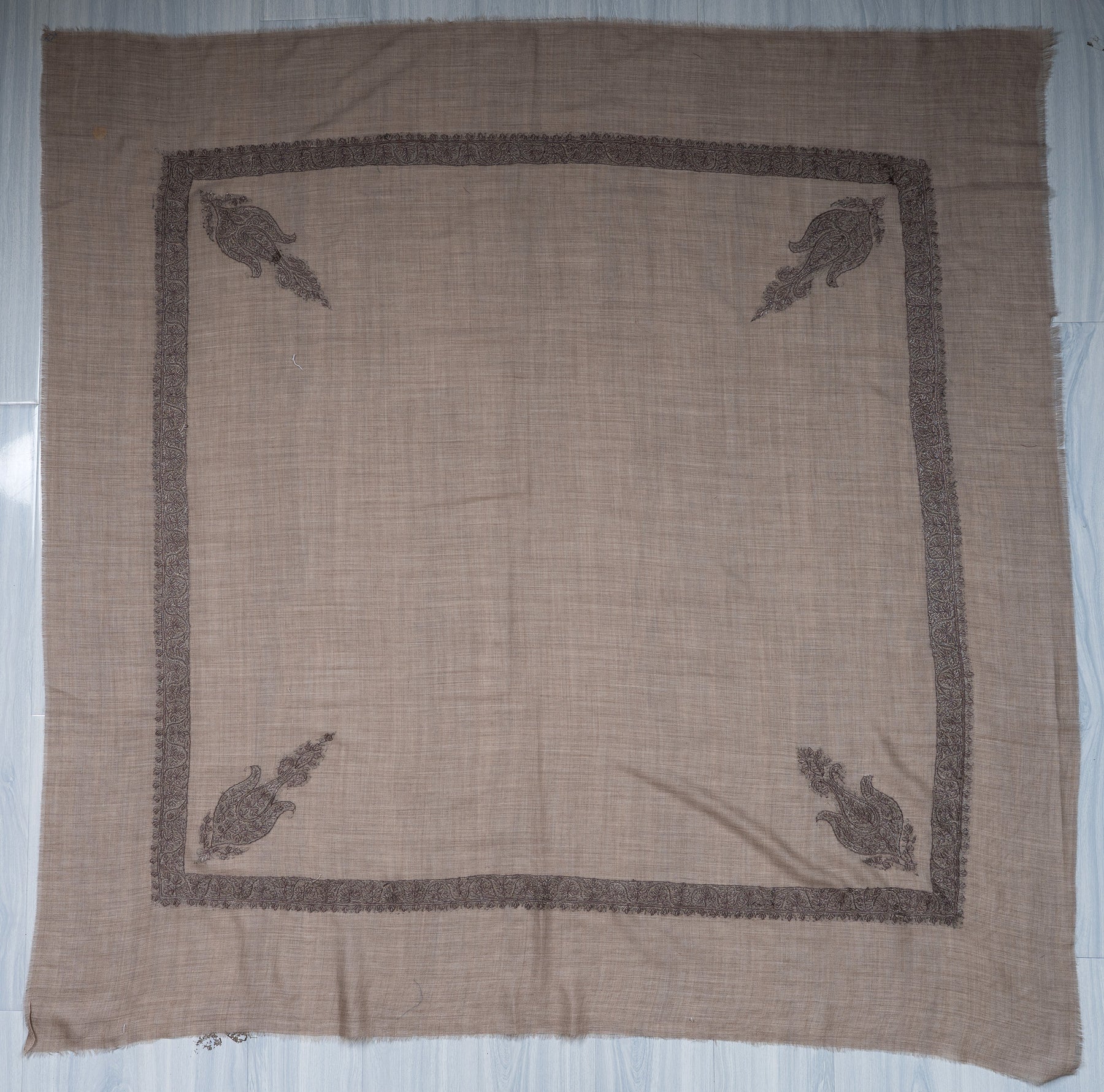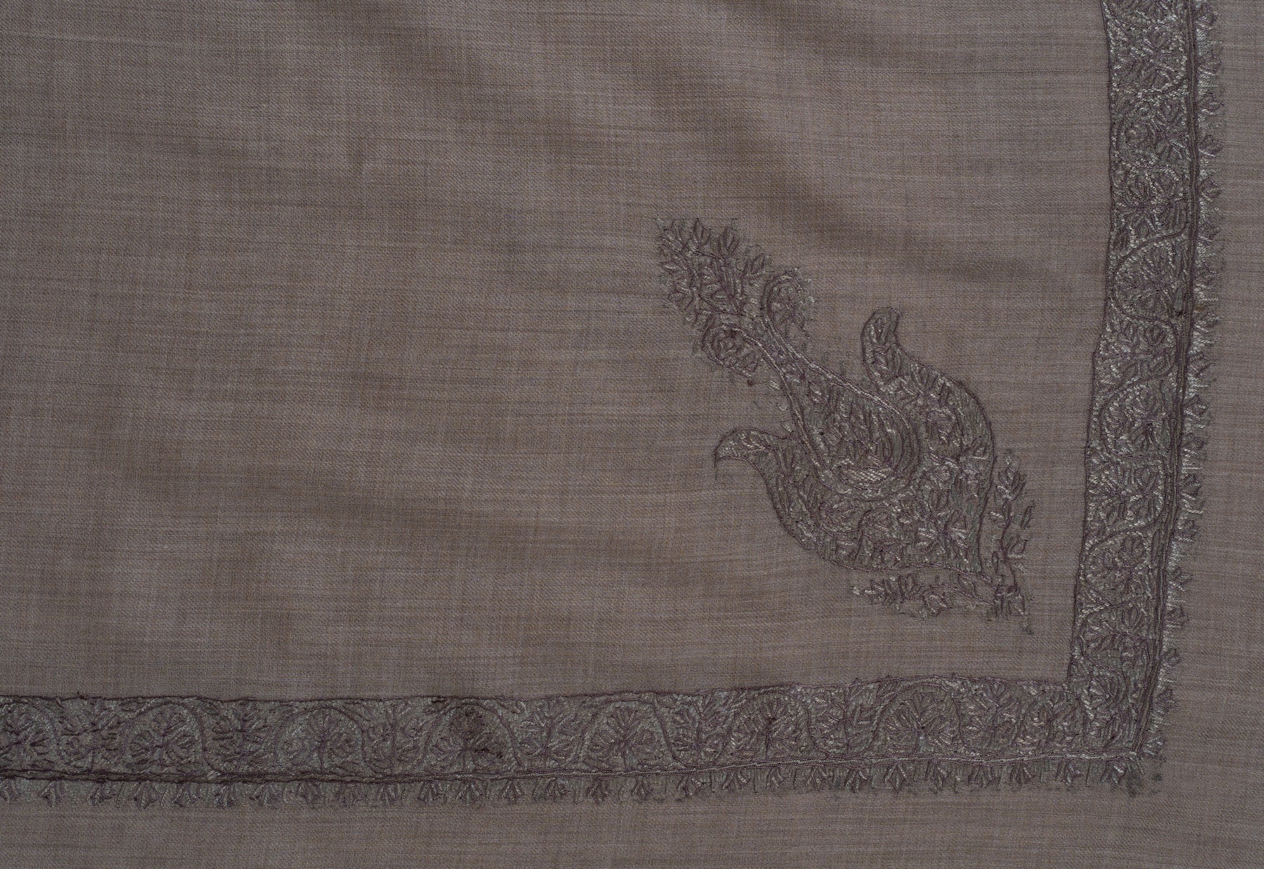 Step into quiet sophistication with the Stone Umber Rumal — Sozni Hand Embroidered, a Kashmiri creation of rare refinement. Spun from ultra-fine 120-count merino wool, this Rumal is soft, airy, and exceptionally comfortable. With dimensions of 54 inches, it is the perfect size for a tarha/hijab, shawl, or layering wrap.