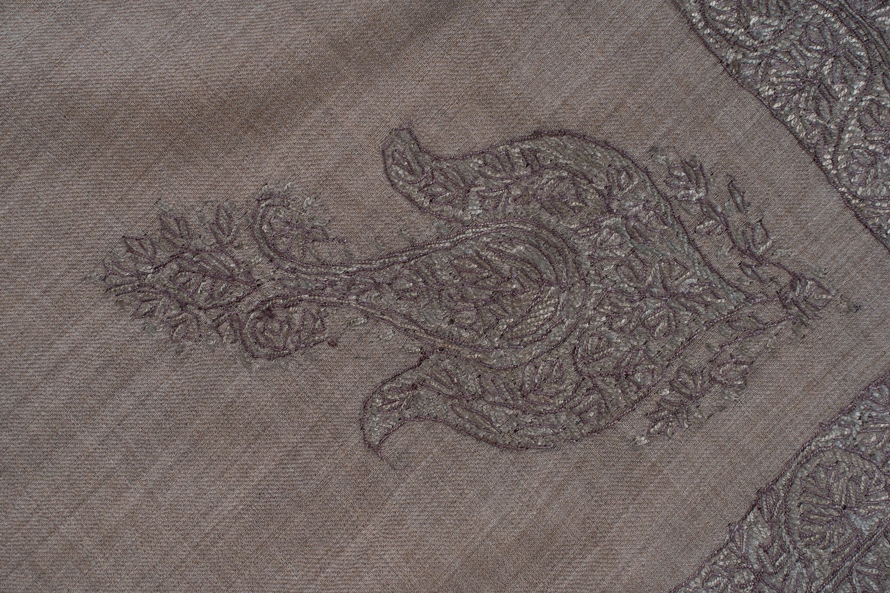 Its Sozni embroidery in deep umber tones creates a richly detailed border and motif, blending seamlessly into the earthy taupe fabric. A piece that resonates with natural charm and artisanal mastery.