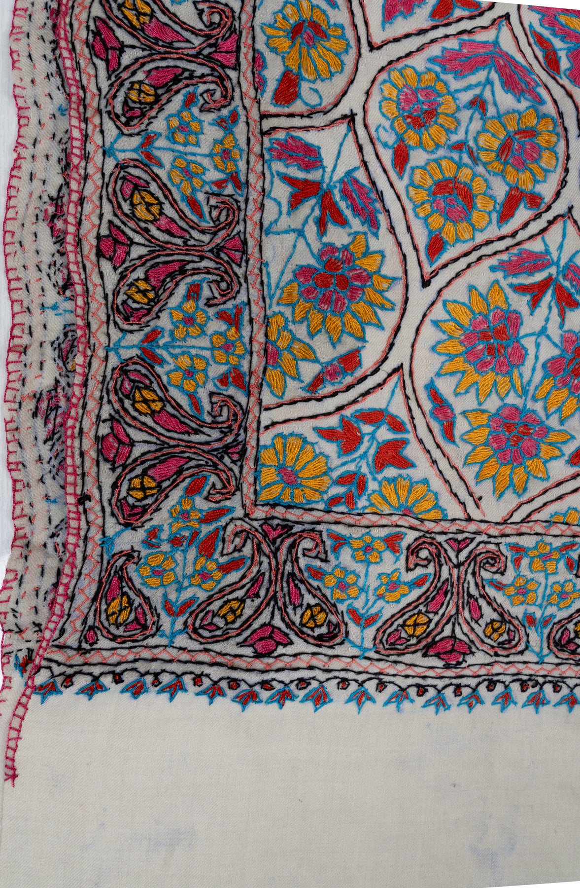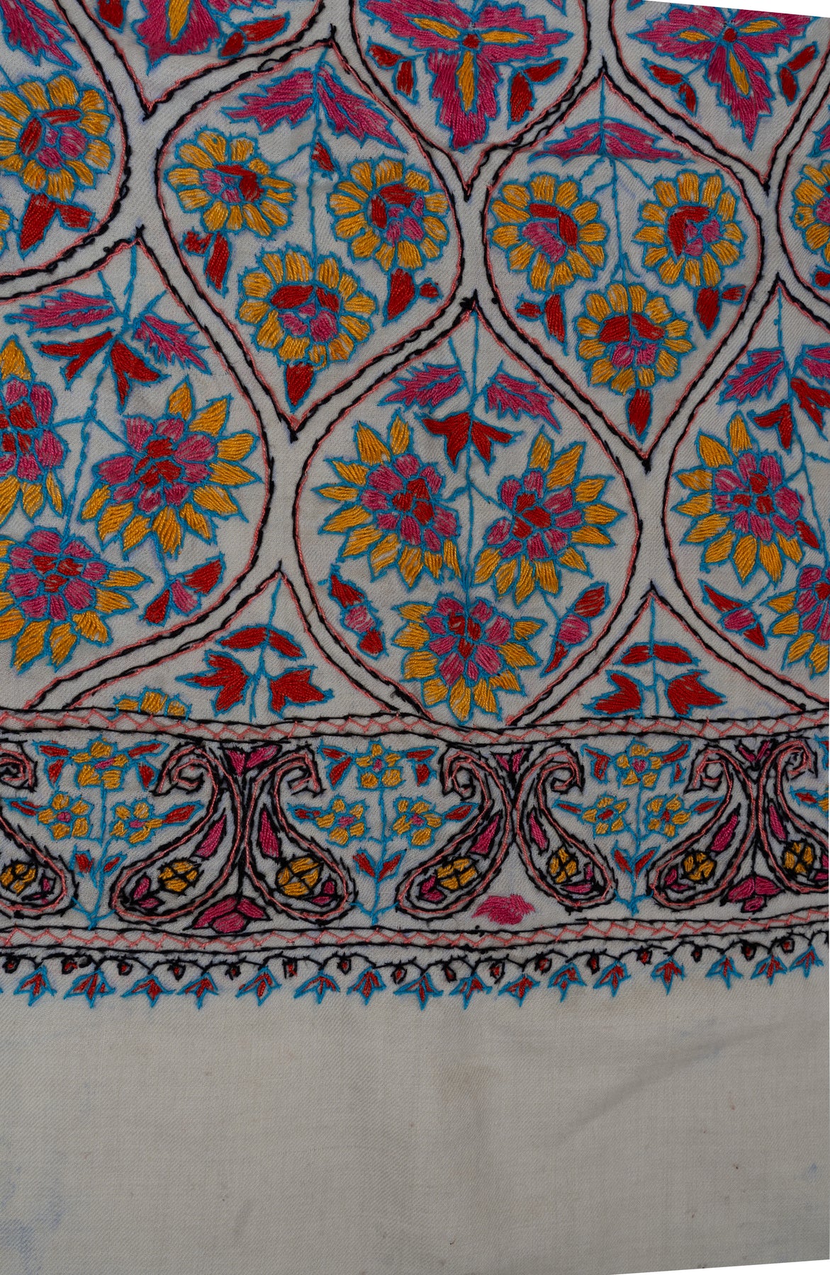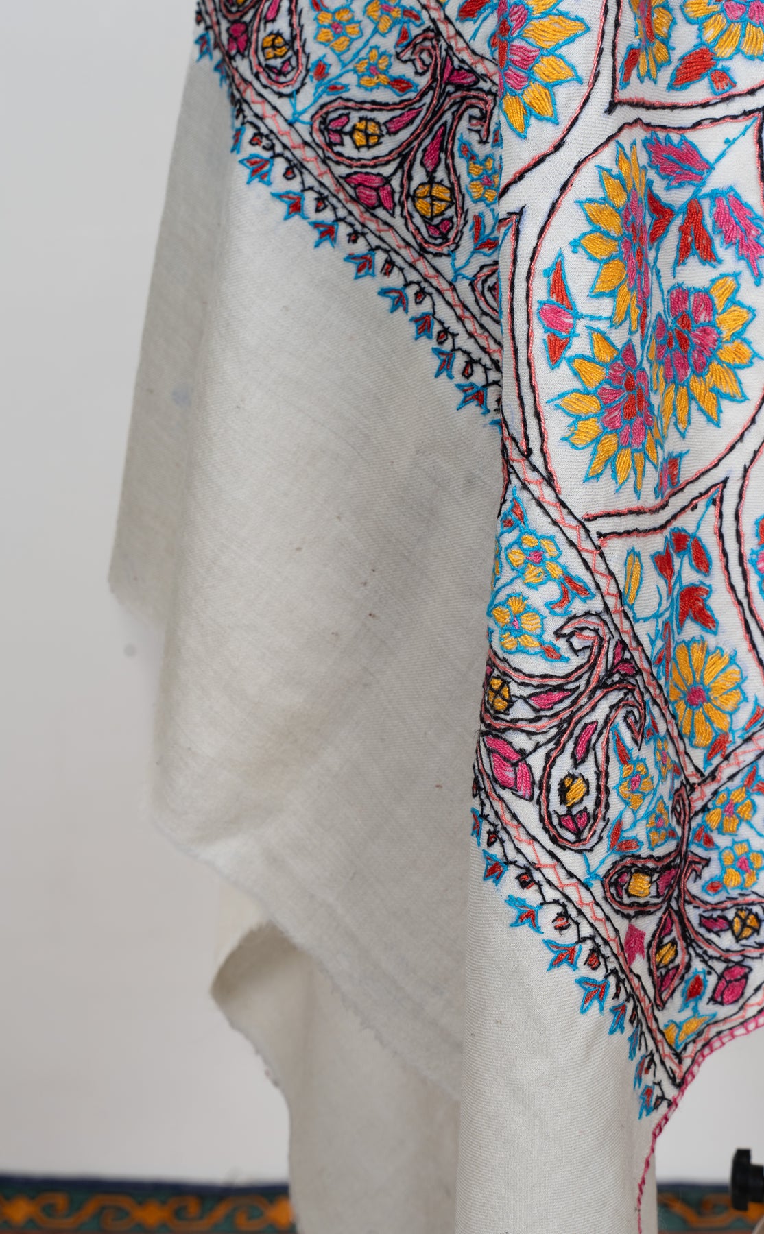 Set on an ivory-toned merino wool base, the embroidery unfolds in a rhythmic arrangement of floral medallions and paisley borders. Shades of sky blue, sunflower yellow, coral pink, and hints of black outlining come together with remarkable clarity—each colour chosen to enhance contrast while preserving balance. The lighter ground allows the embroidery to glow, giving the piece an airy yet intricate presence.