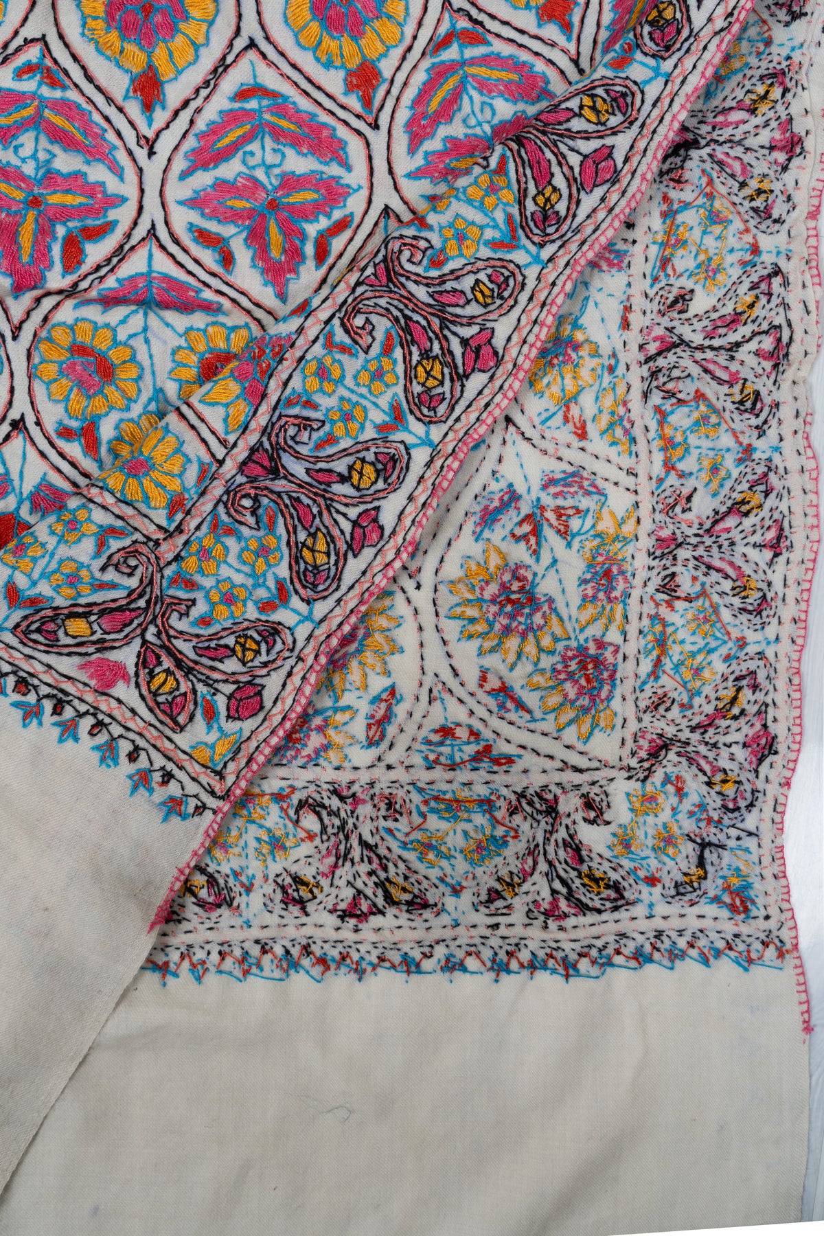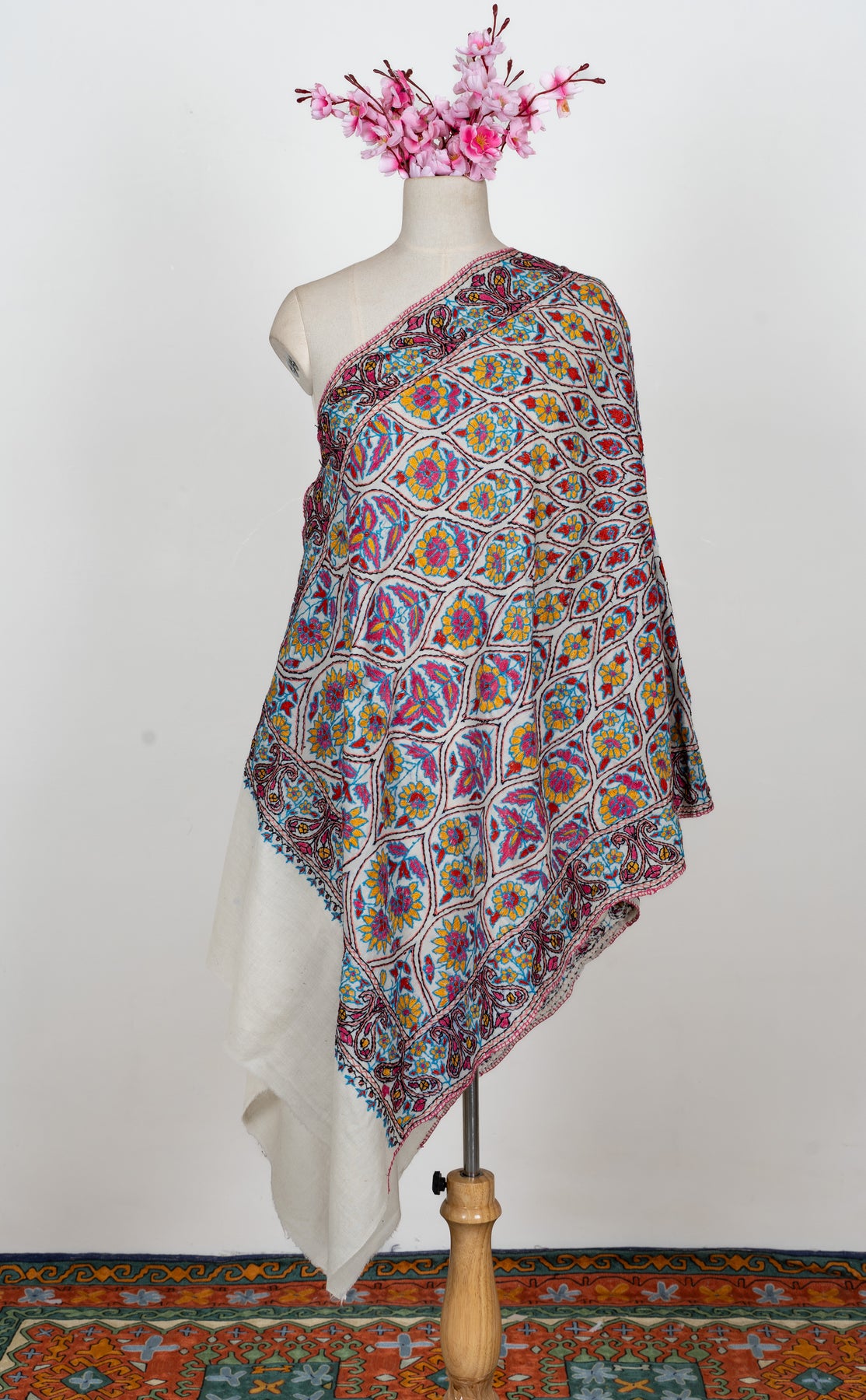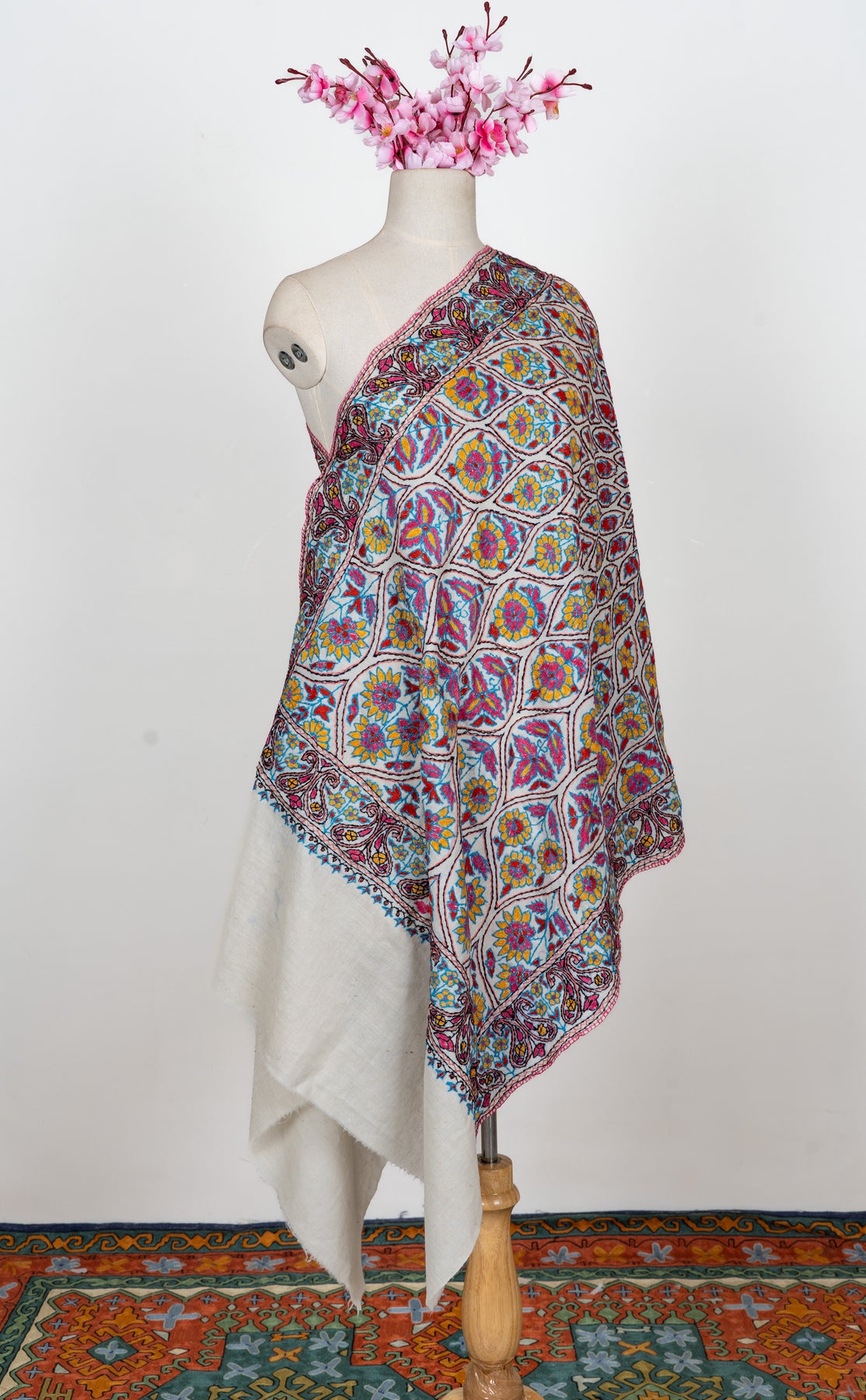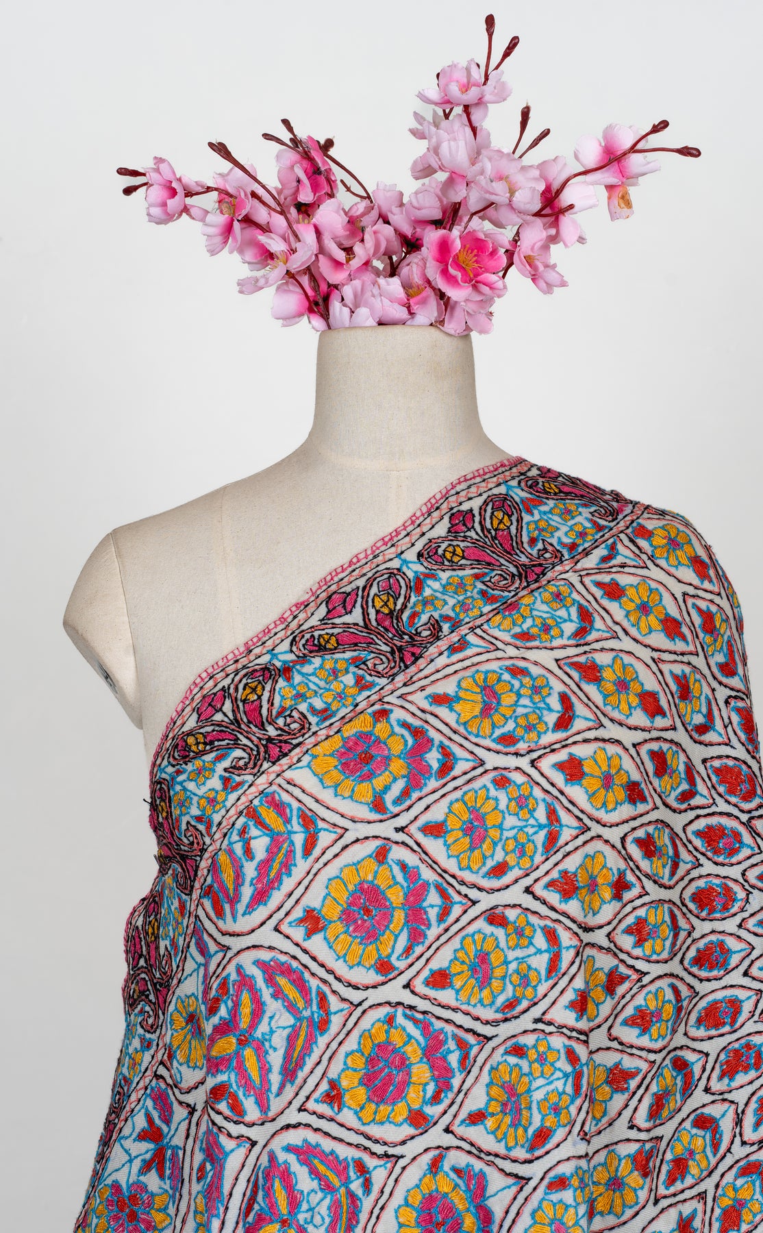 Set on an ivory-toned merino wool base, the embroidery unfolds in a rhythmic arrangement of floral medallions and paisley borders. Shades of sky blue, sunflower yellow, coral pink, and hints of black outlining come together with remarkable clarity—each colour chosen to enhance contrast while preserving balance. The lighter ground allows the embroidery to glow, giving the piece an airy yet intricate presence.