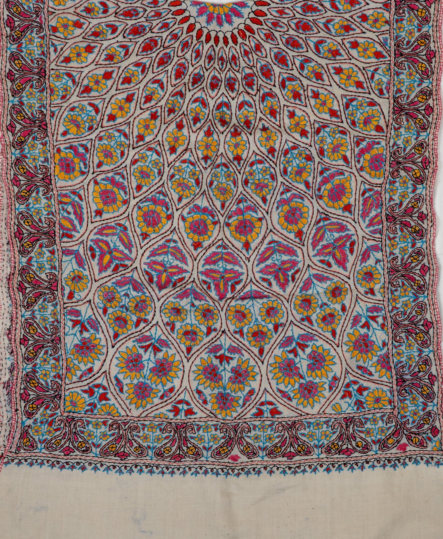 Entirely hand-embroidered in fine Sozni work, this scarf is the result of sustained focus and discipline. Every motif is outlined, filled, and refined stitch by stitch—a process that demands not just skill, but endurance. The repetition you see is not mechanical; it reflects hours of steady hands returning to the same forms until symmetry feels natural, almost effortless.