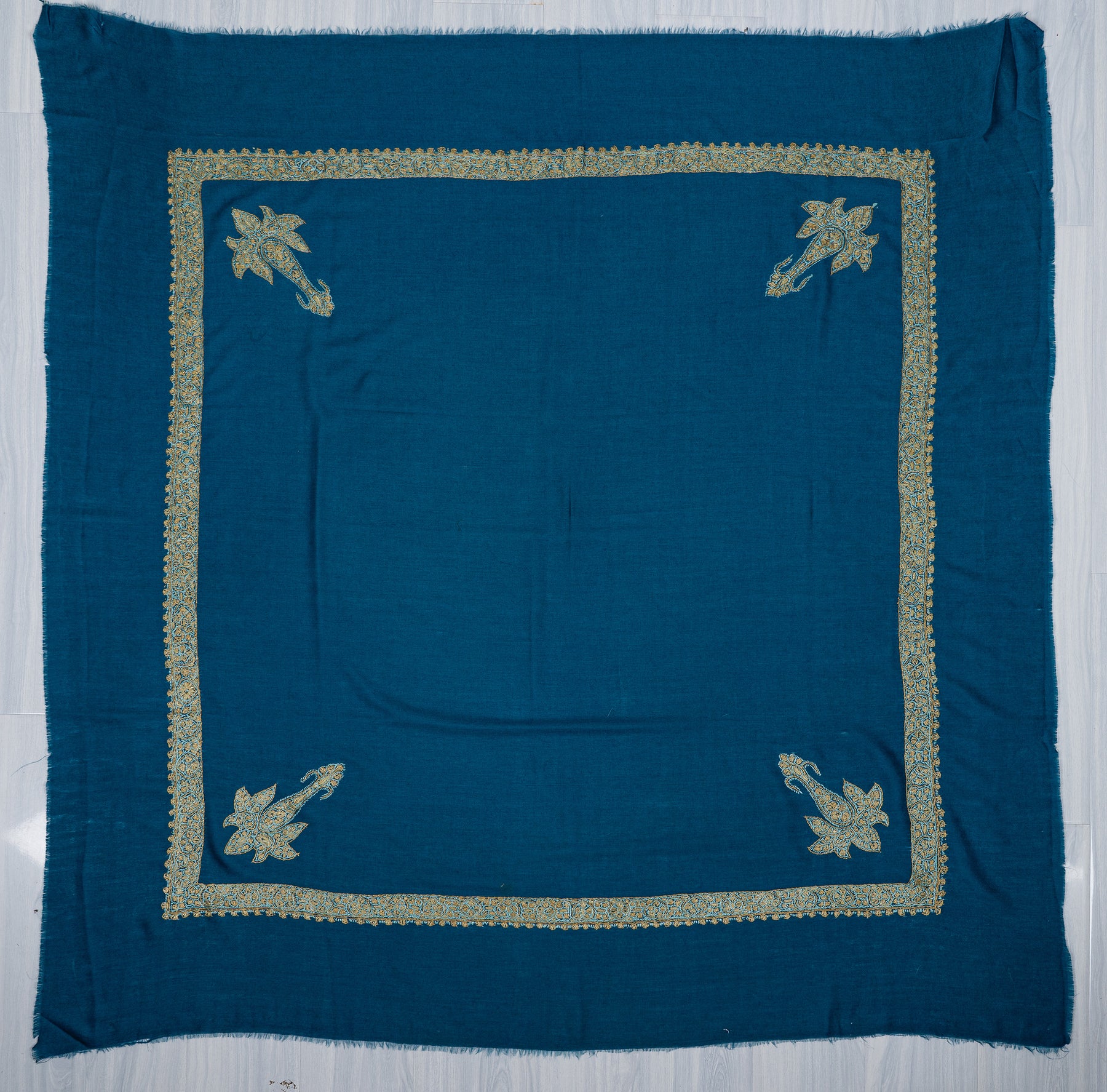 Exude opulence with the Teal Gold Rumal — Sozni Hand Embroidered, a perfect harmony of bold color and delicate craft. Spun from the ultra-fine 120-count merino wool, this Rumal is soft, airy, and light. Sized at 54 inches, it is ideal as a tarha/hijab, shawl, or stylish layering piece.