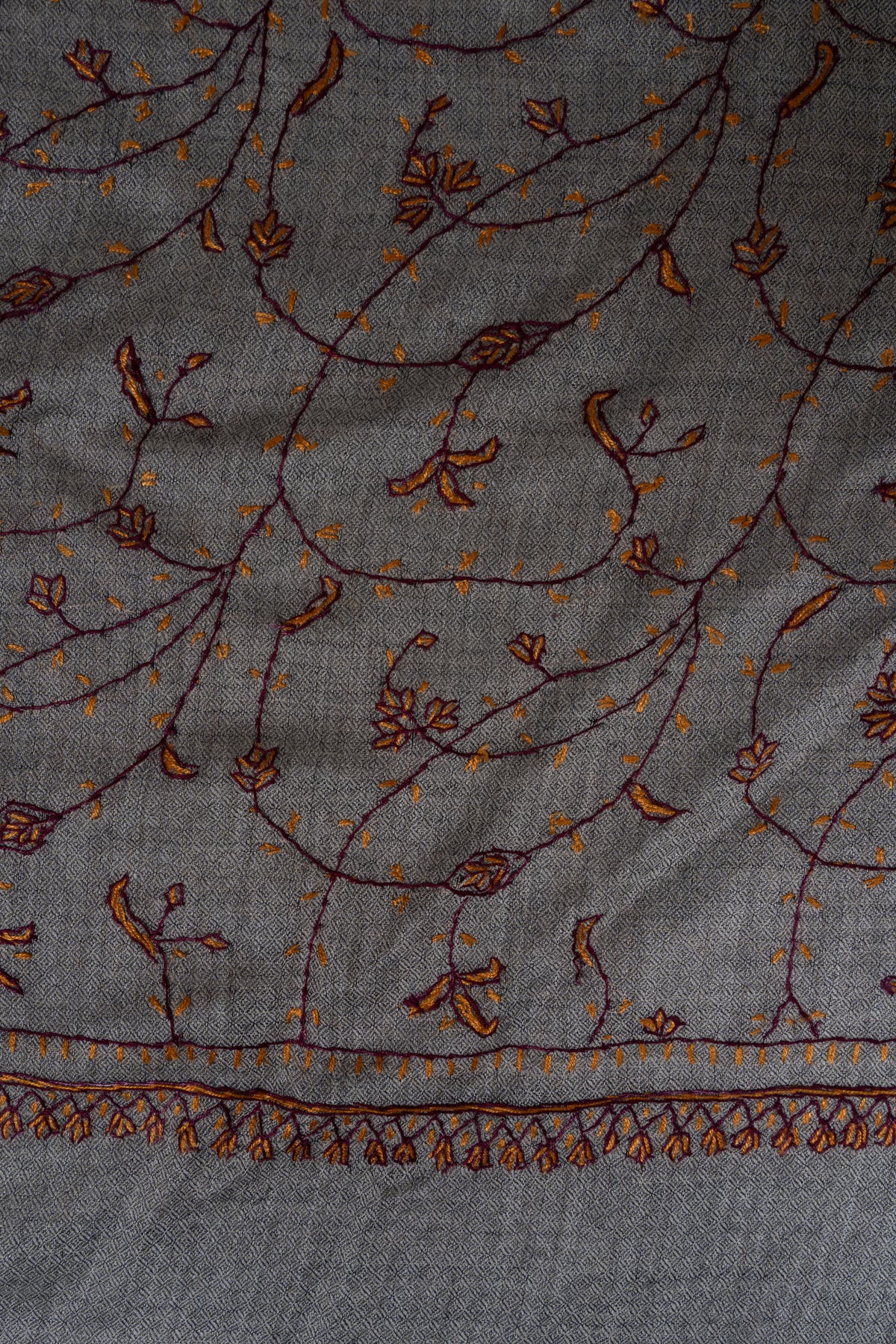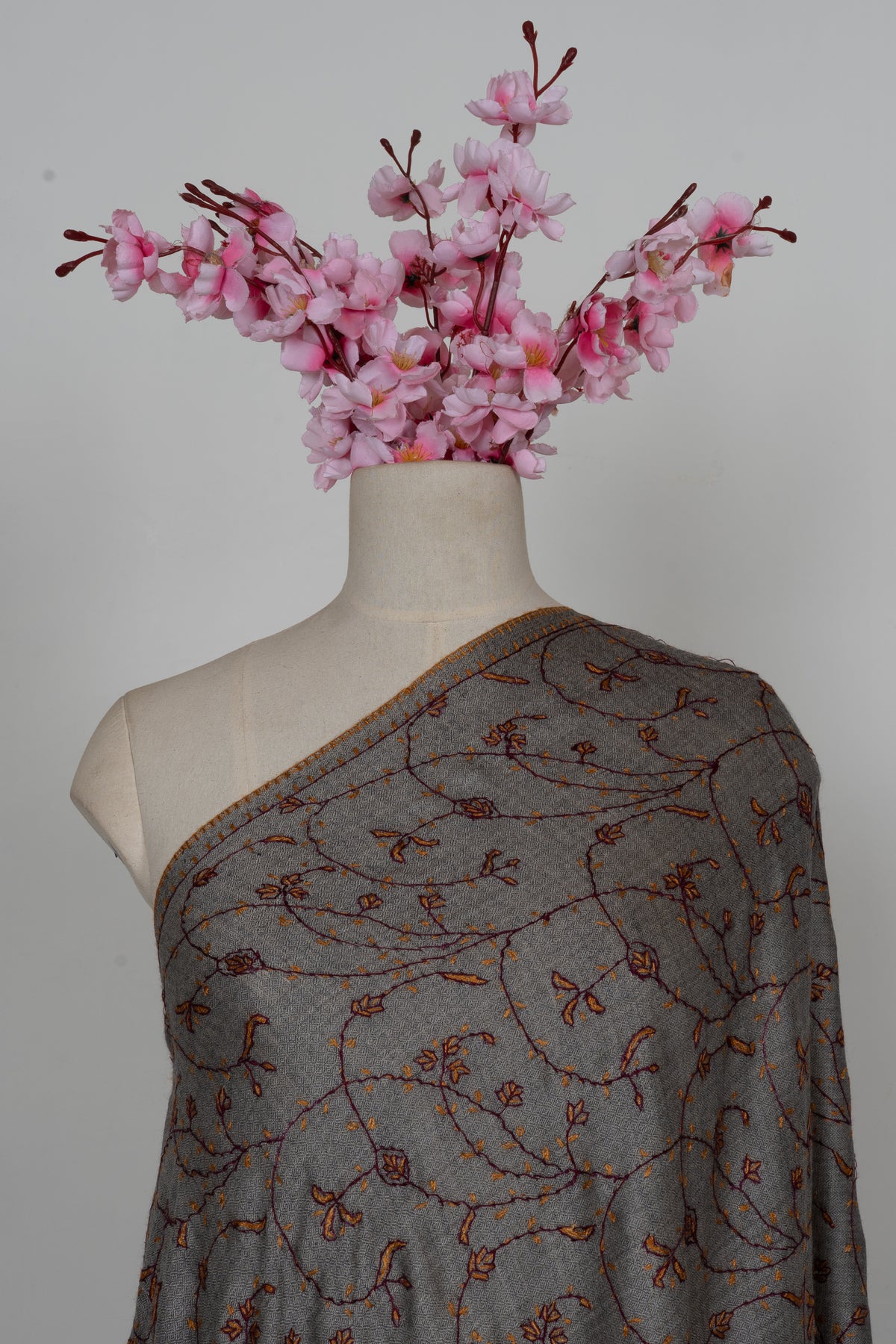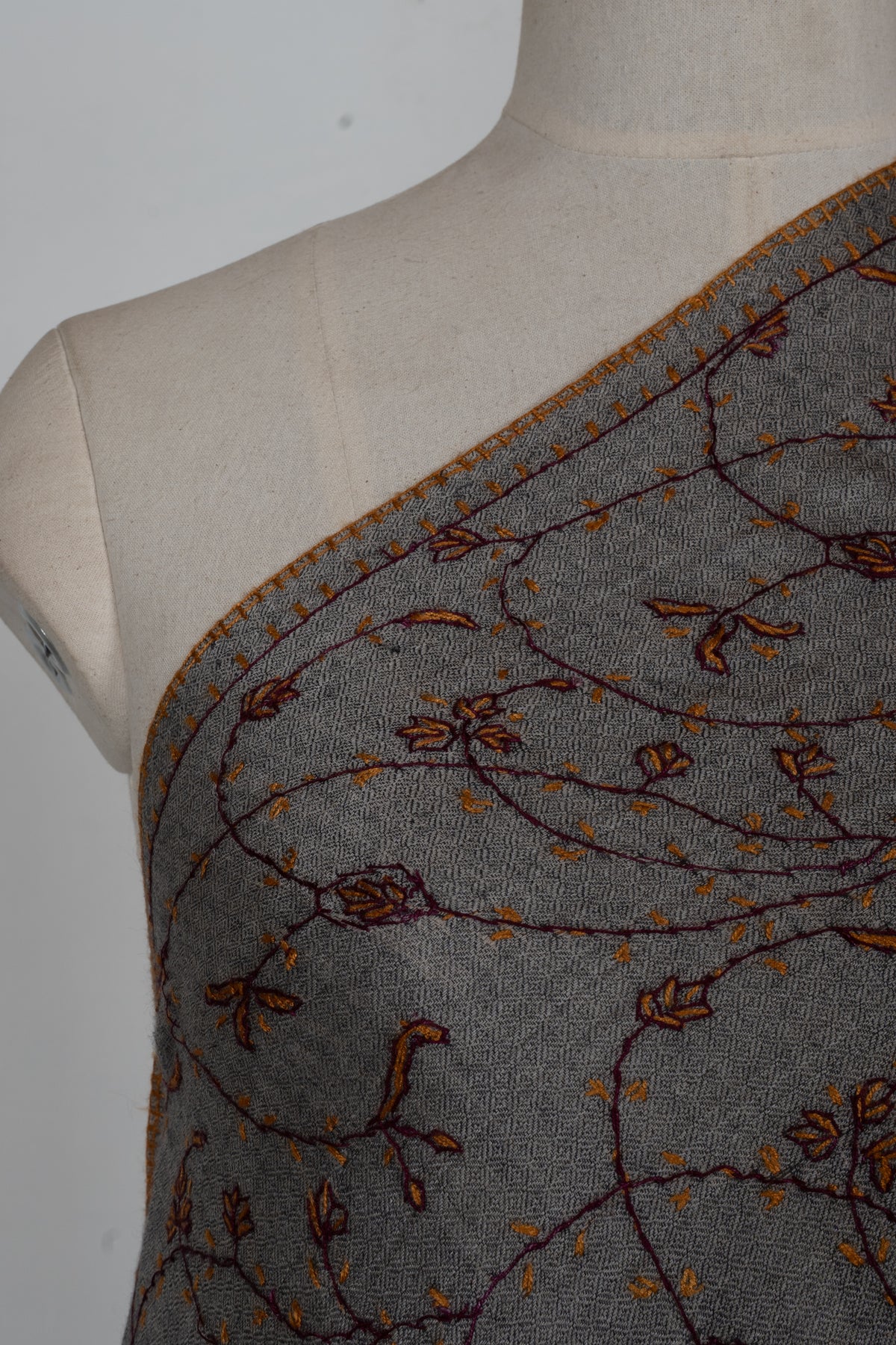 Slate Rust Floral Trail: Merino Wool Hand Embroidered 2.5 Yards Shawl