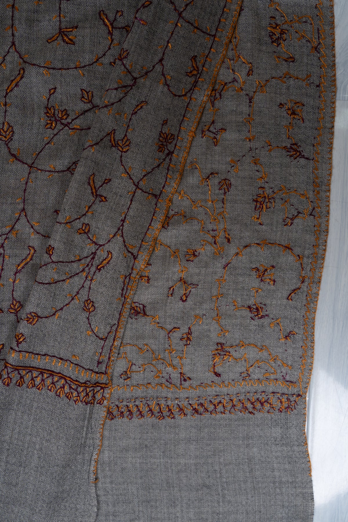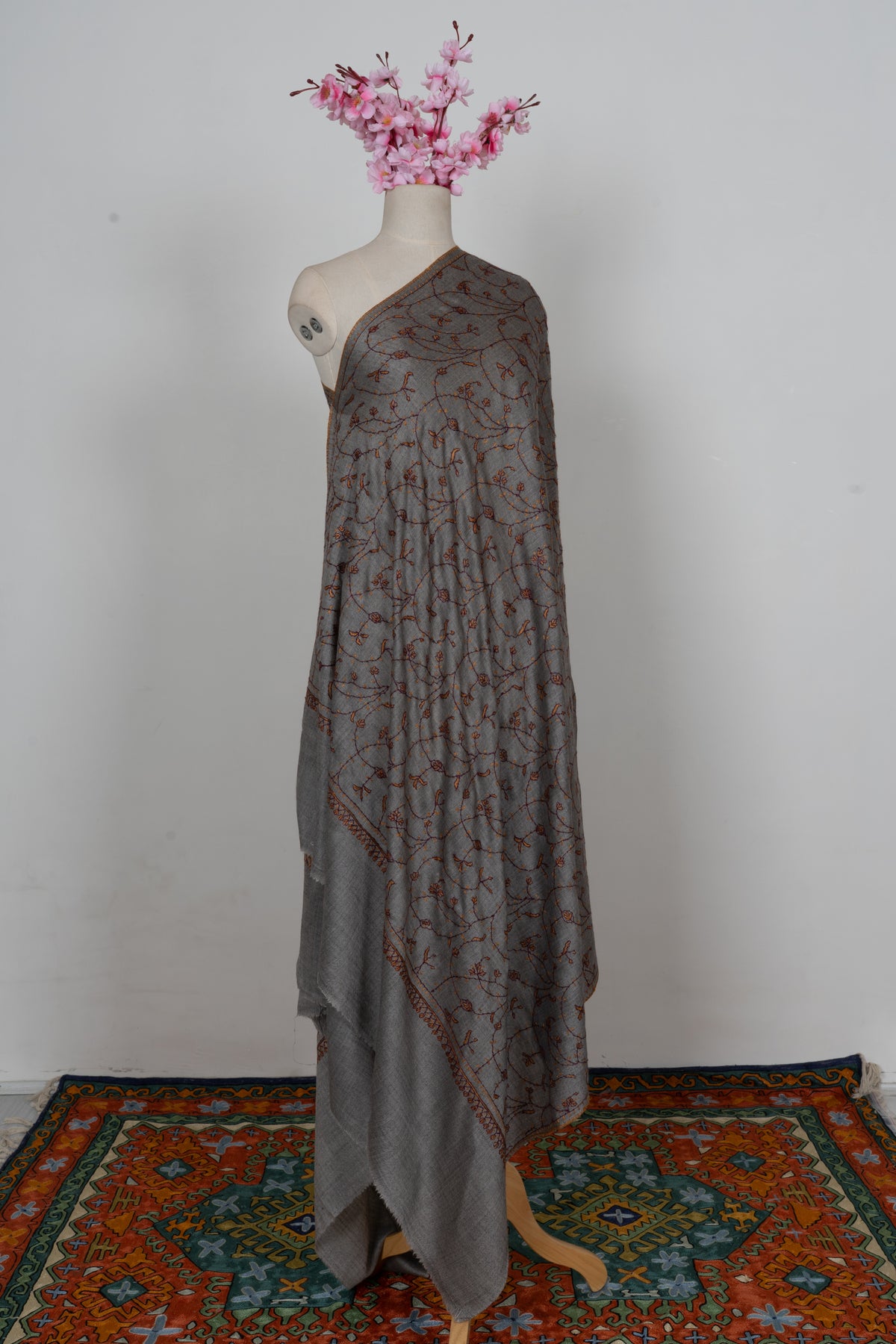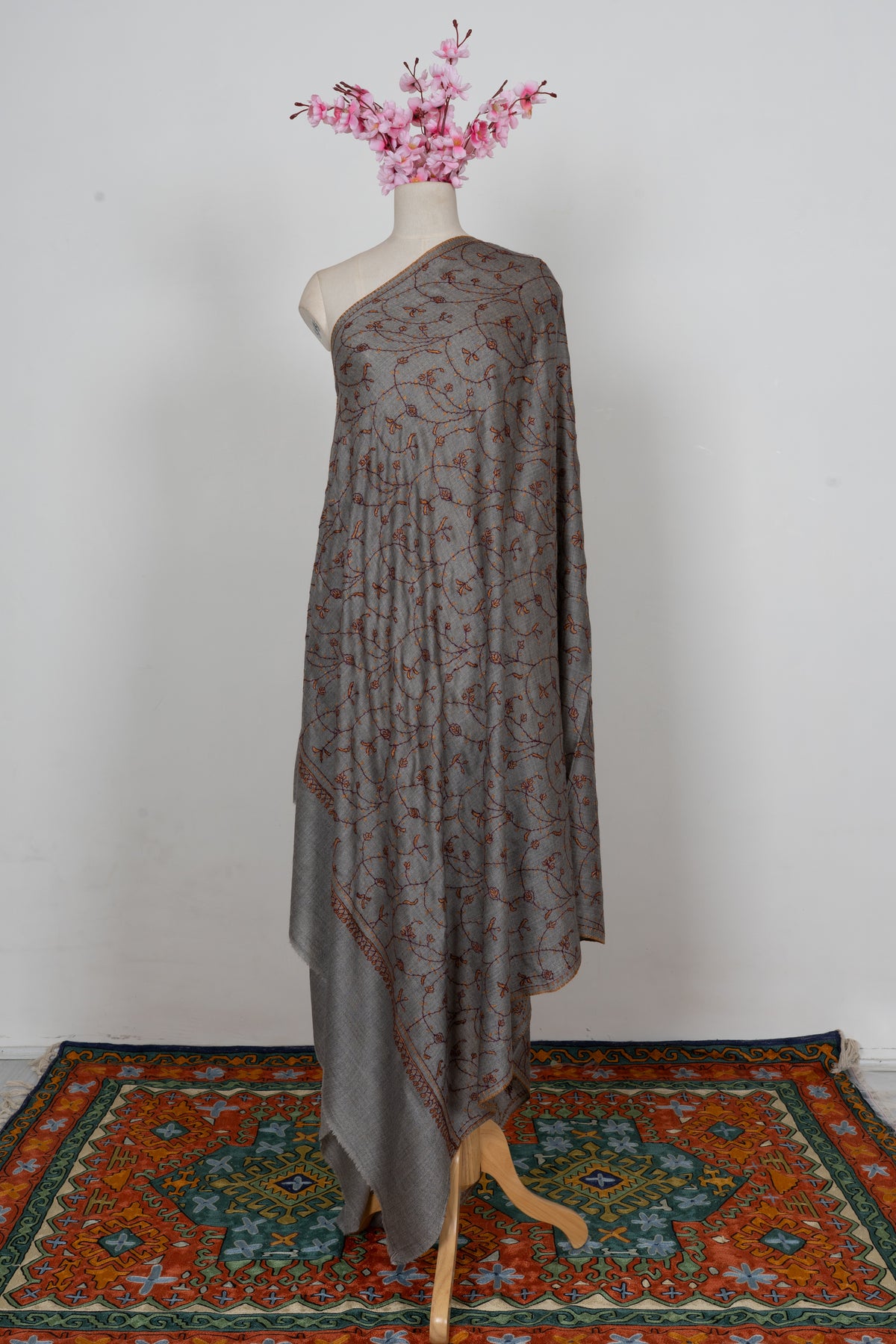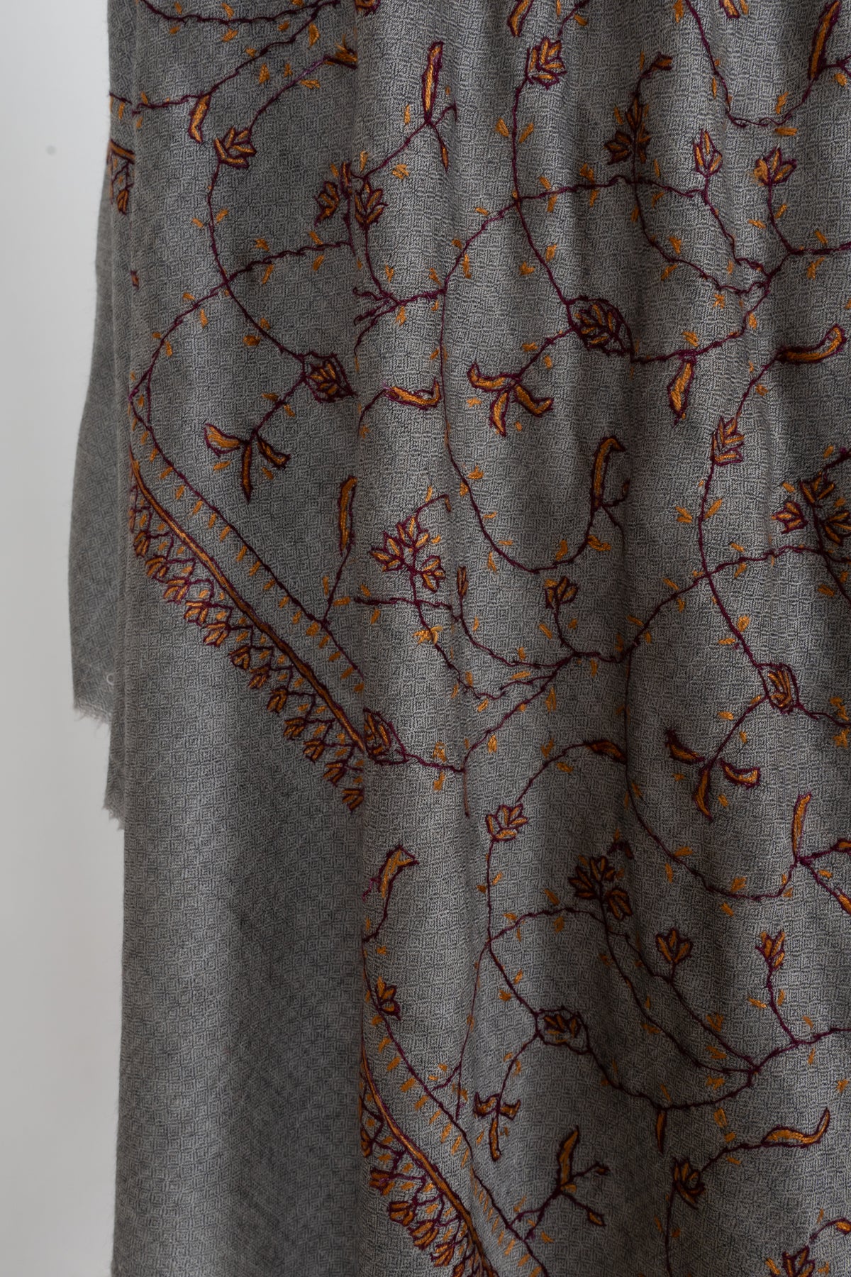Slate Rust Floral Trail: Merino Wool Hand Embroidered 2.5 Yards Shawl