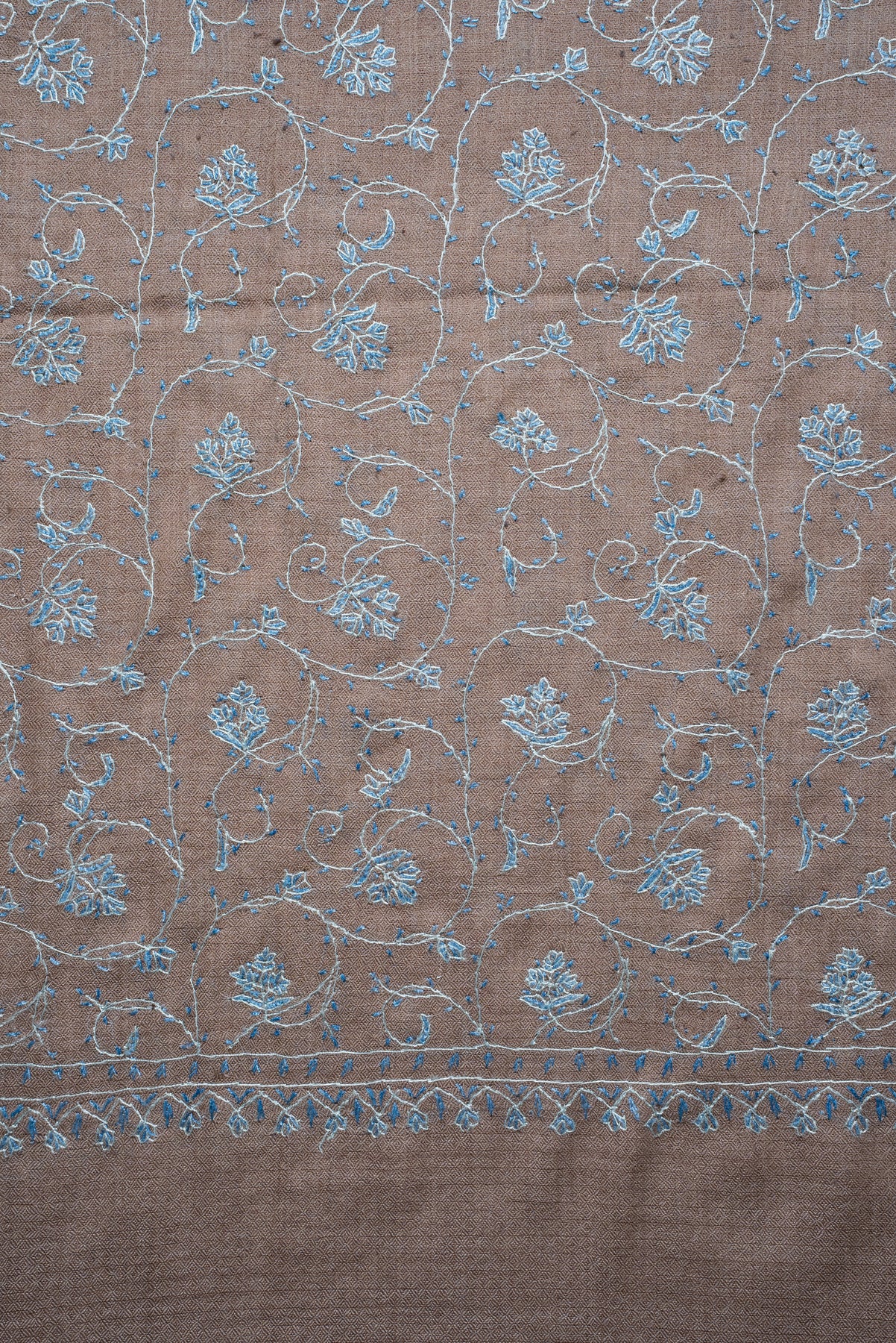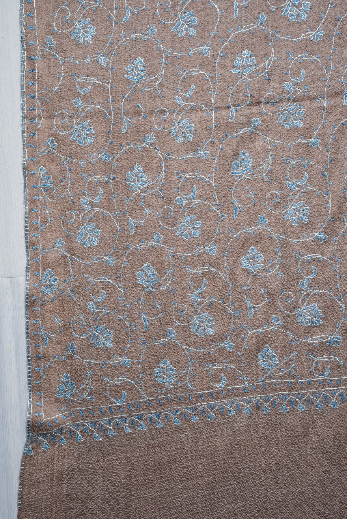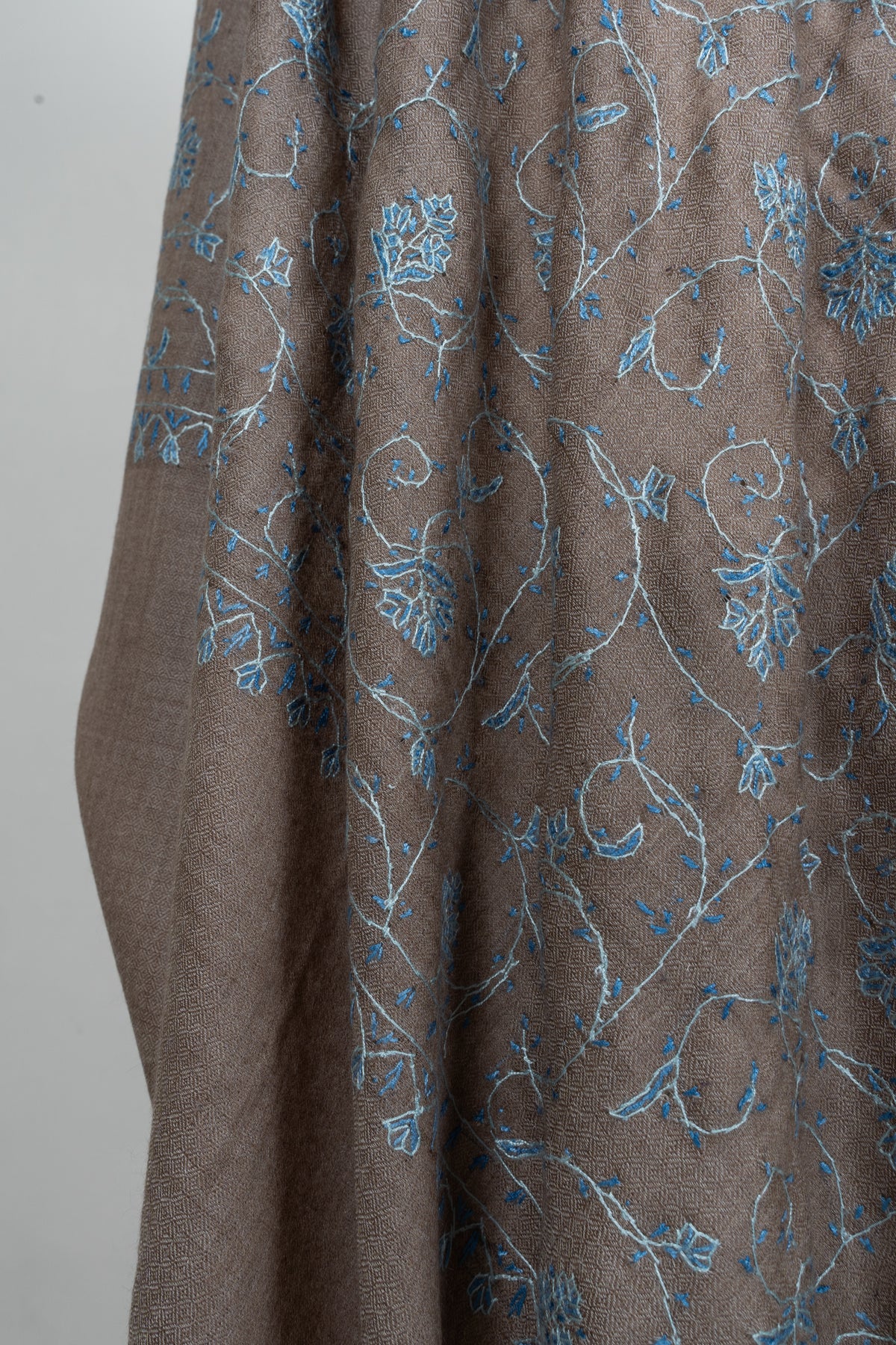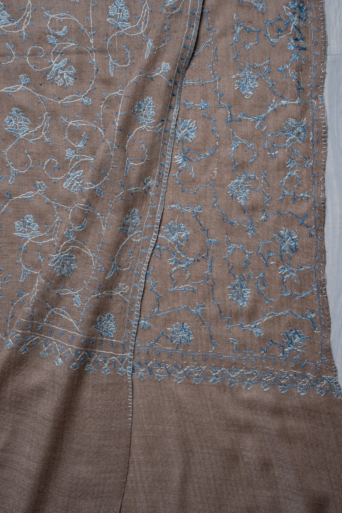Taupe Azure Floral Trail: Merino Wool Hand Embroidered 2.5 Yards Shawl