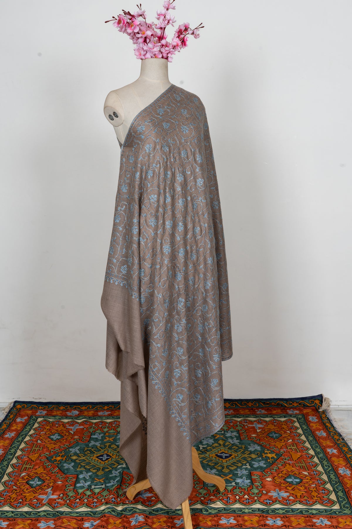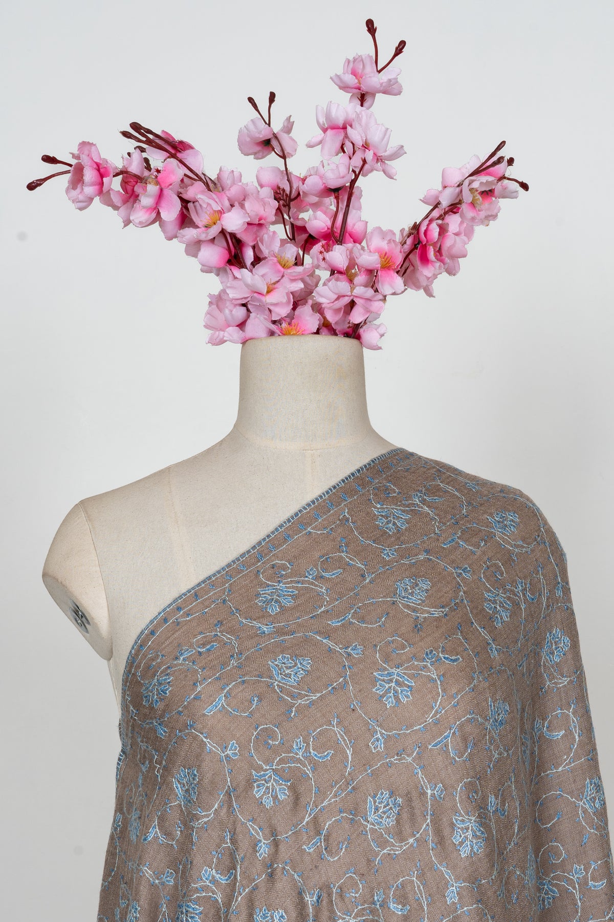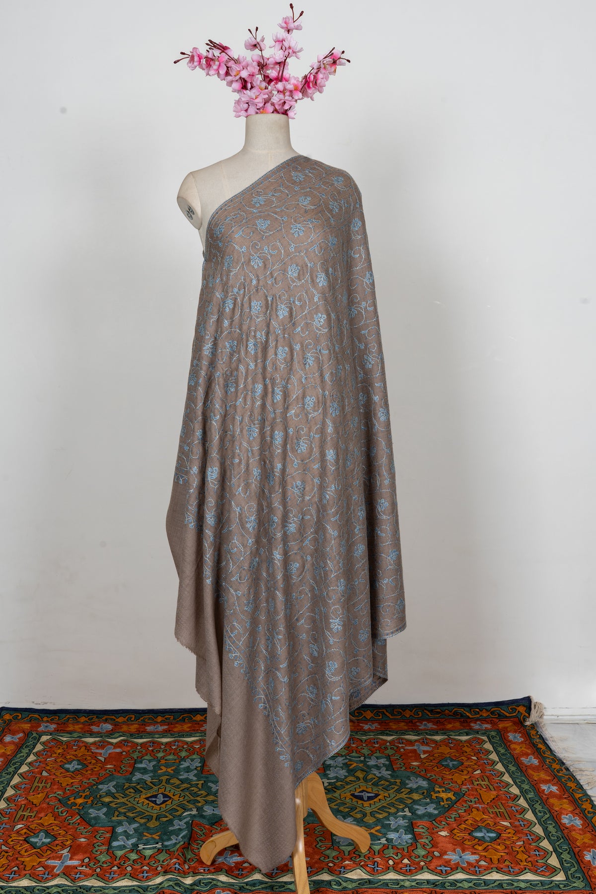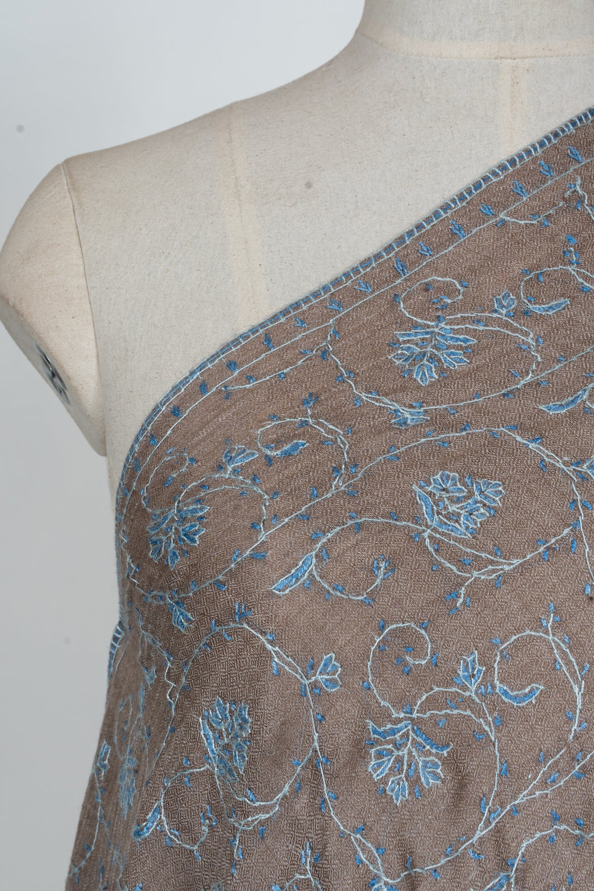 Taupe Azure Floral Trail: Merino Wool Hand Embroidered 2.5 Yards Shawl