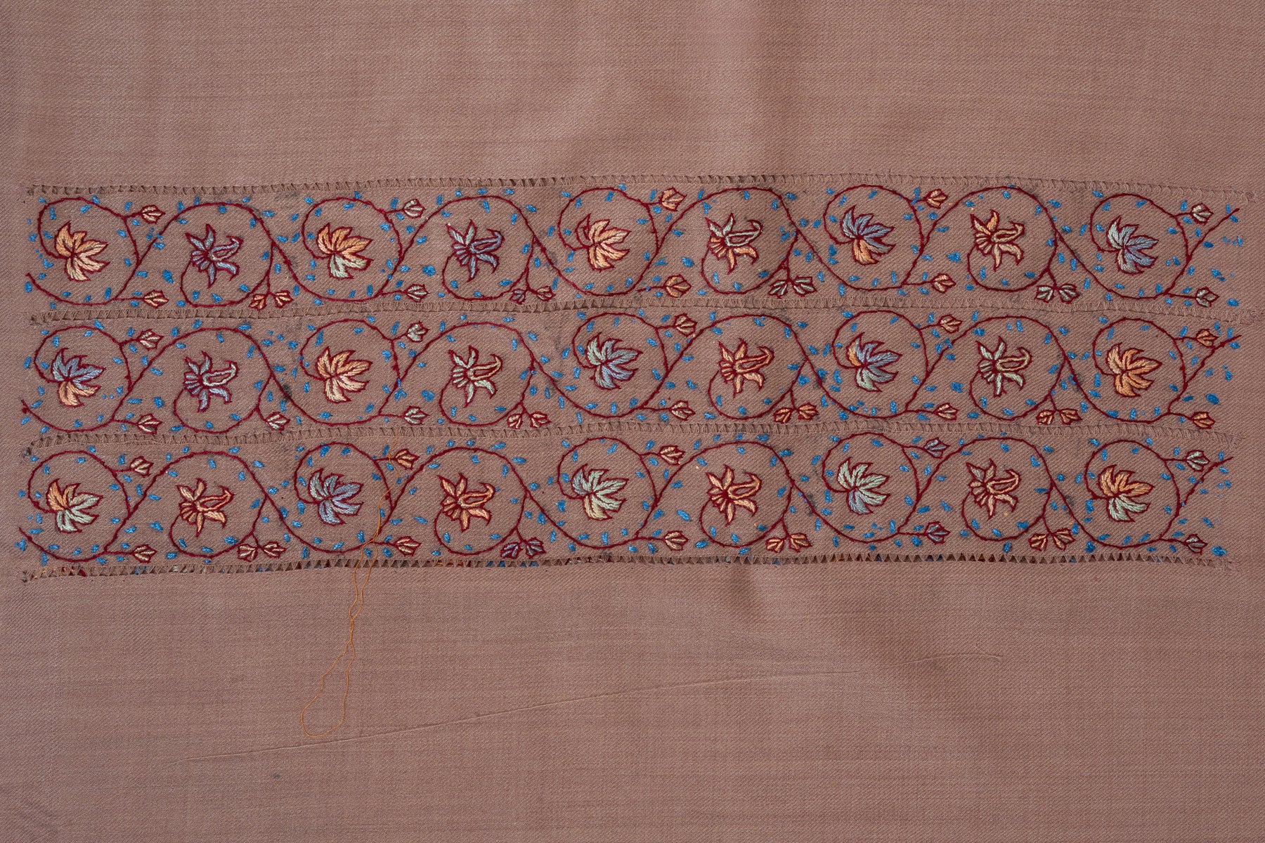 A warm cocoa-toned wool blend suit showcasing the delicate finesse of Kashmiri Sozni hand embroidery. The neckline and borders are accentuated with finely detailed patterns in hues of blue, rust, and mustard, giving it a rich traditional finish.