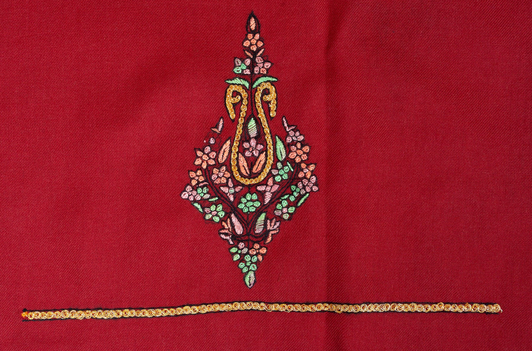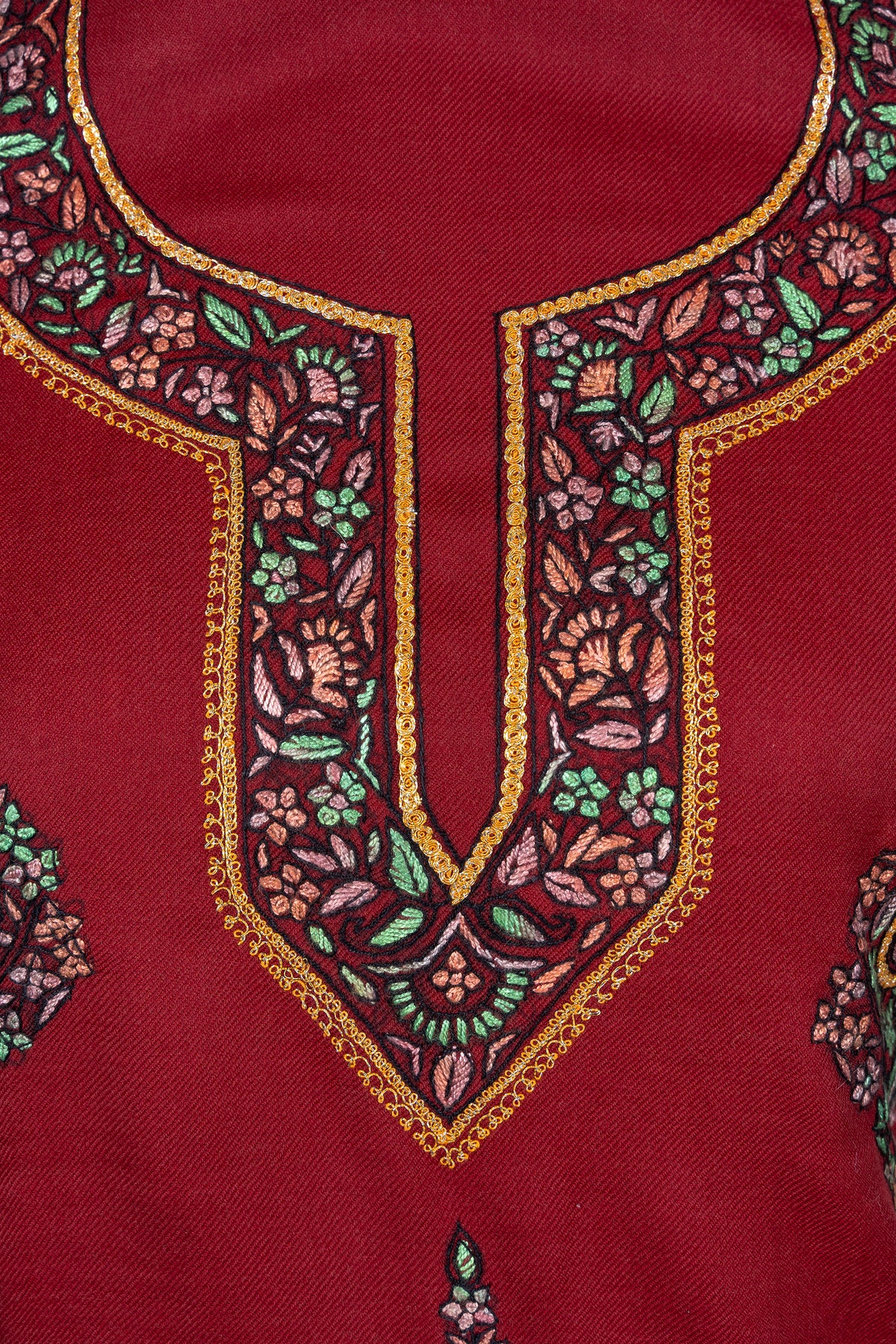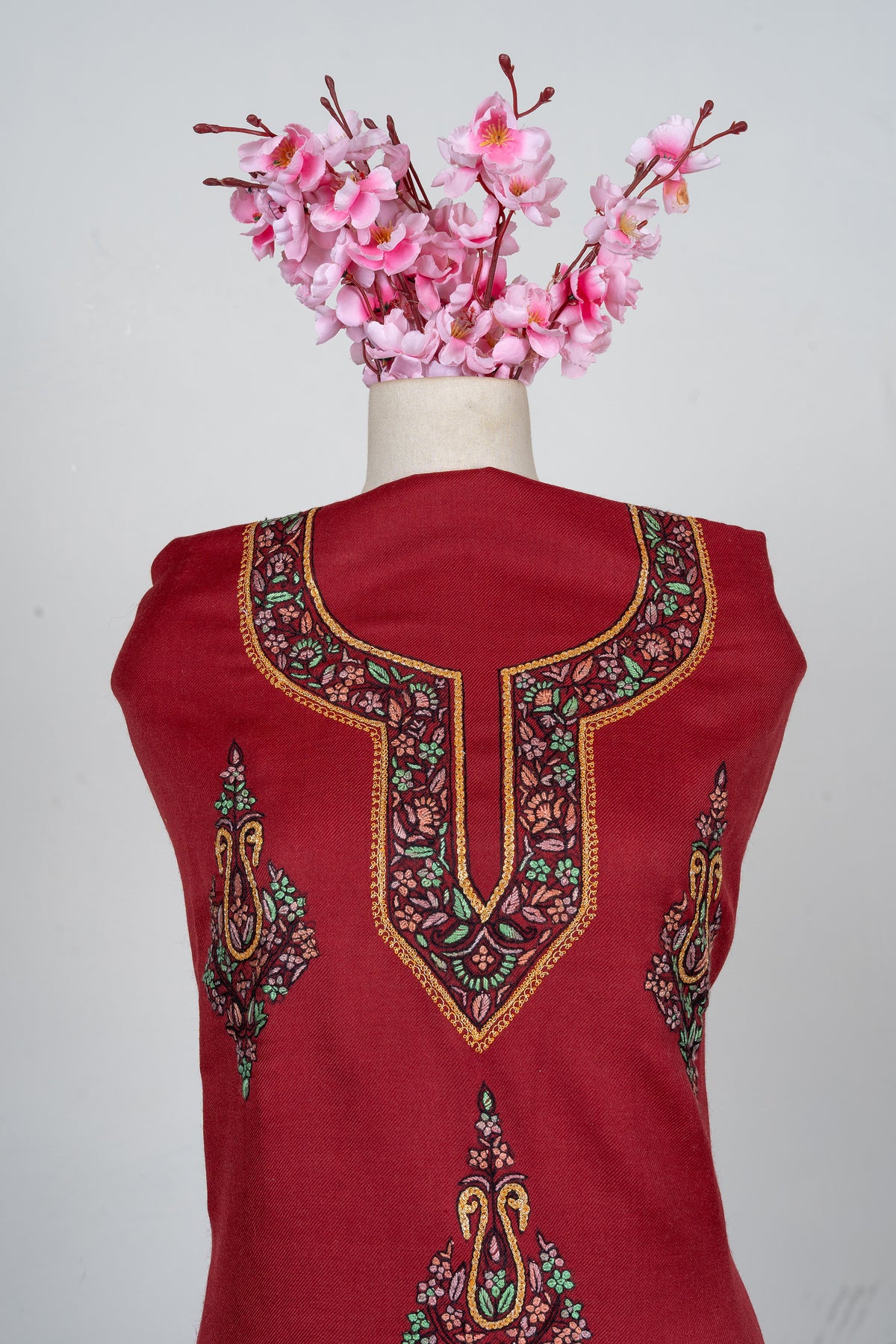 Grace and heritage blend beautifully in this deep crimson wool blend suit, adorned with intricate Sozni hand embroidery. The delicate floral motifs on the neckline and scattered paisley patterns add a regal charm, making it a timeless piece that speaks of Kashmiri artistry.