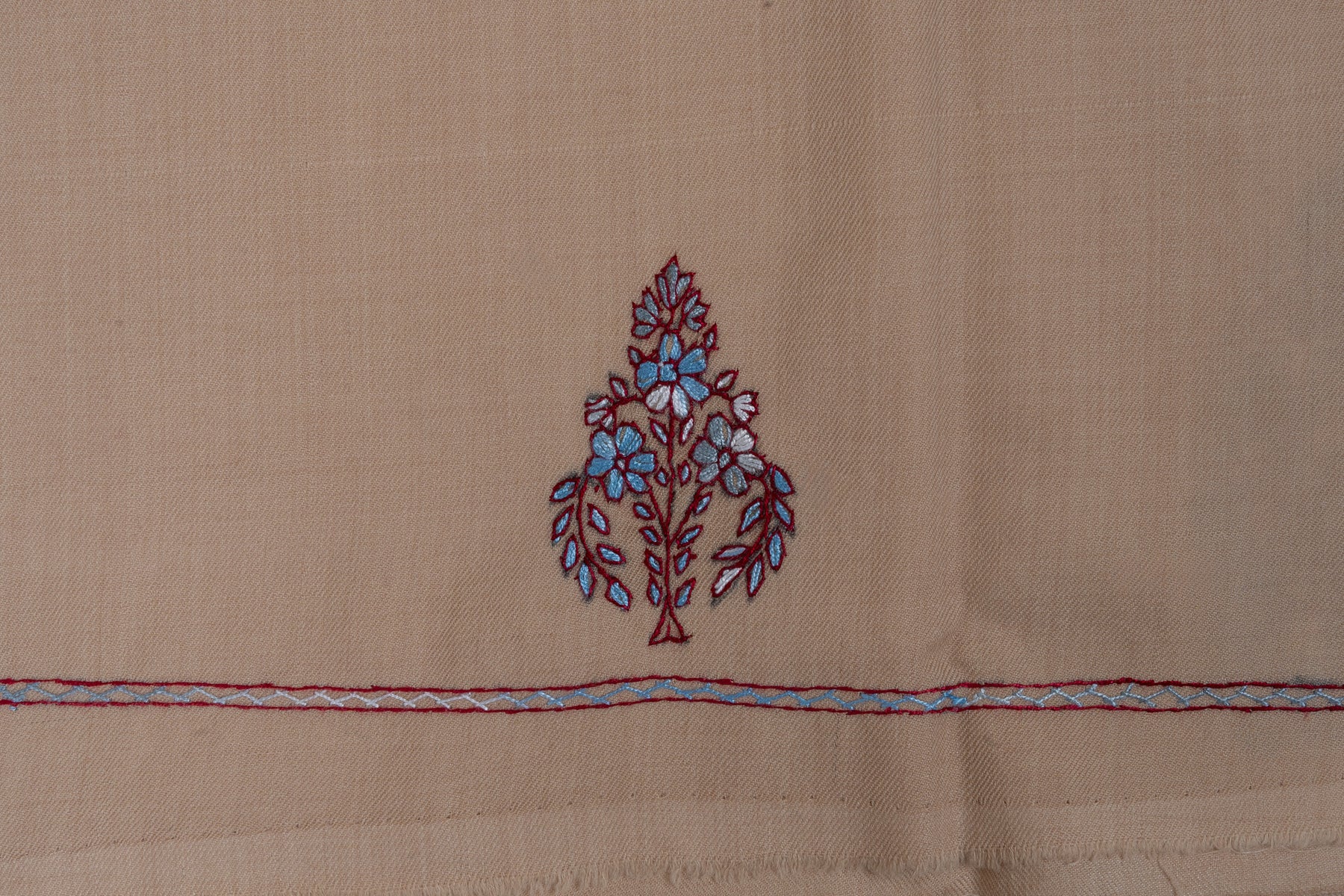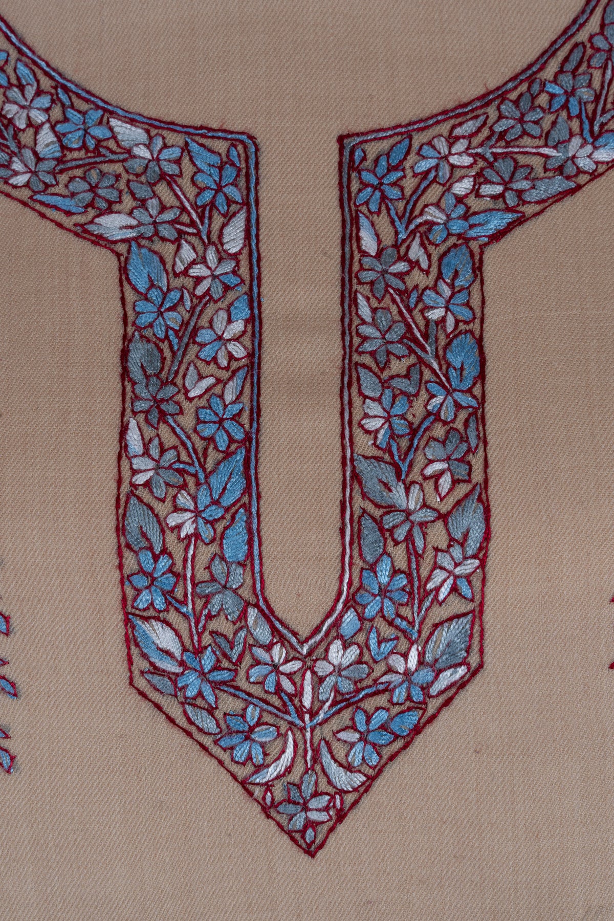 A soothing beige wool blend suit brought to life with detailed Sozni hand embroidery in tones of blue and maroon. The tree motifs across the body and neckline create a beautiful harmony between simplicity and artistry.