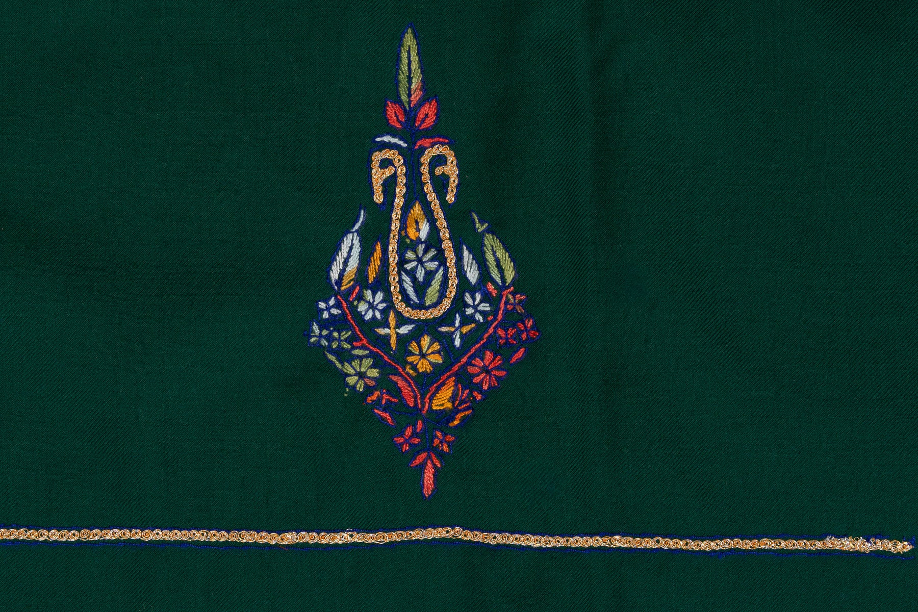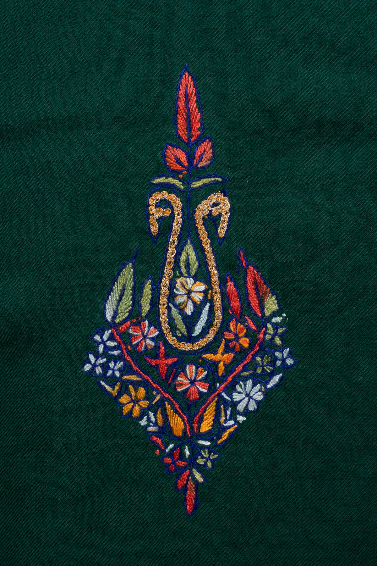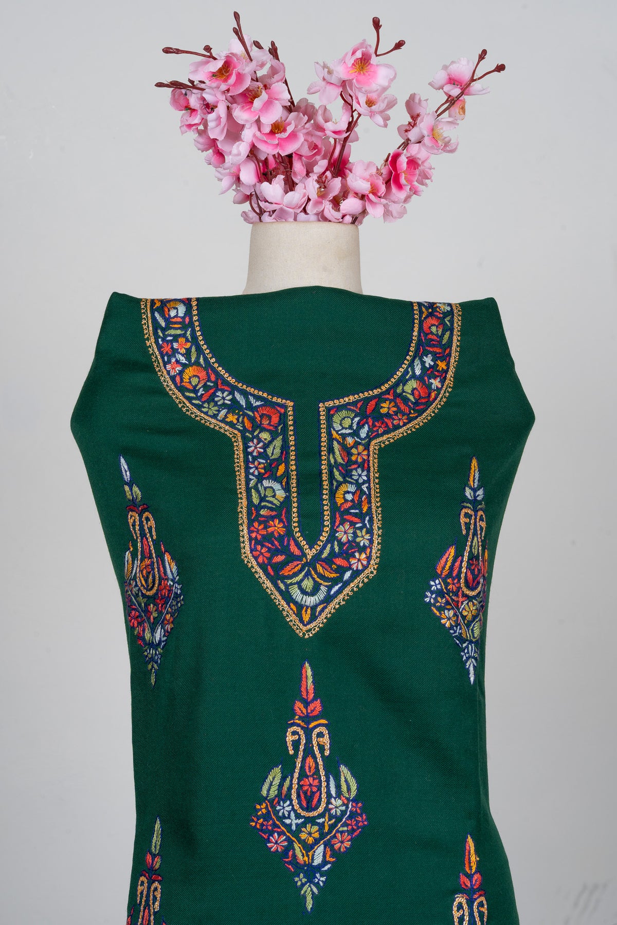 Embrace timeless Kashmiri craftsmanship with this deep emerald green wool blend suit, adorned with intricate Sozni hand embroidery. The multicolored floral and paisley patterns lend the ensemble a regal touch, harmonizing elegance and tradition.