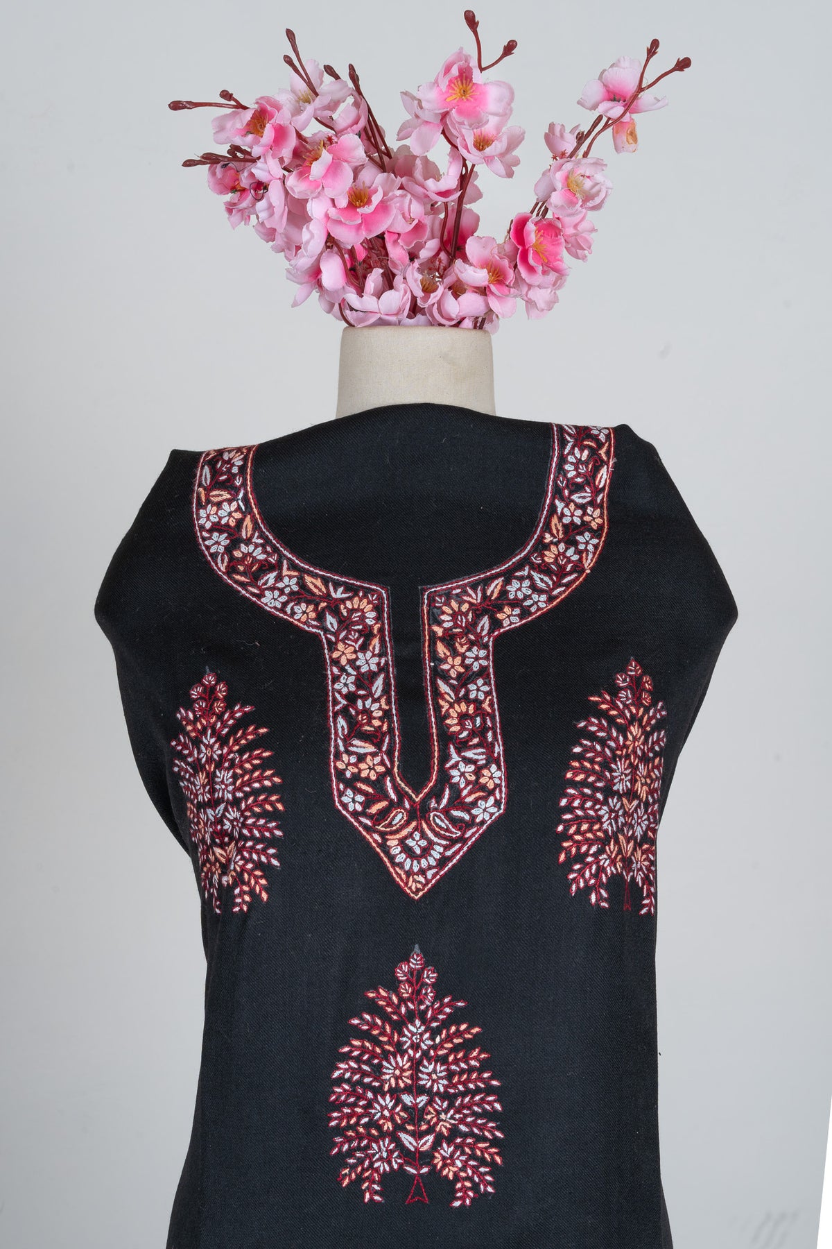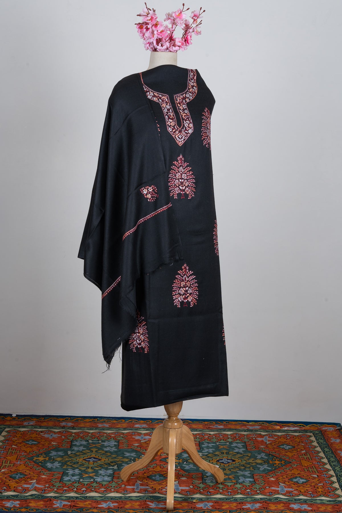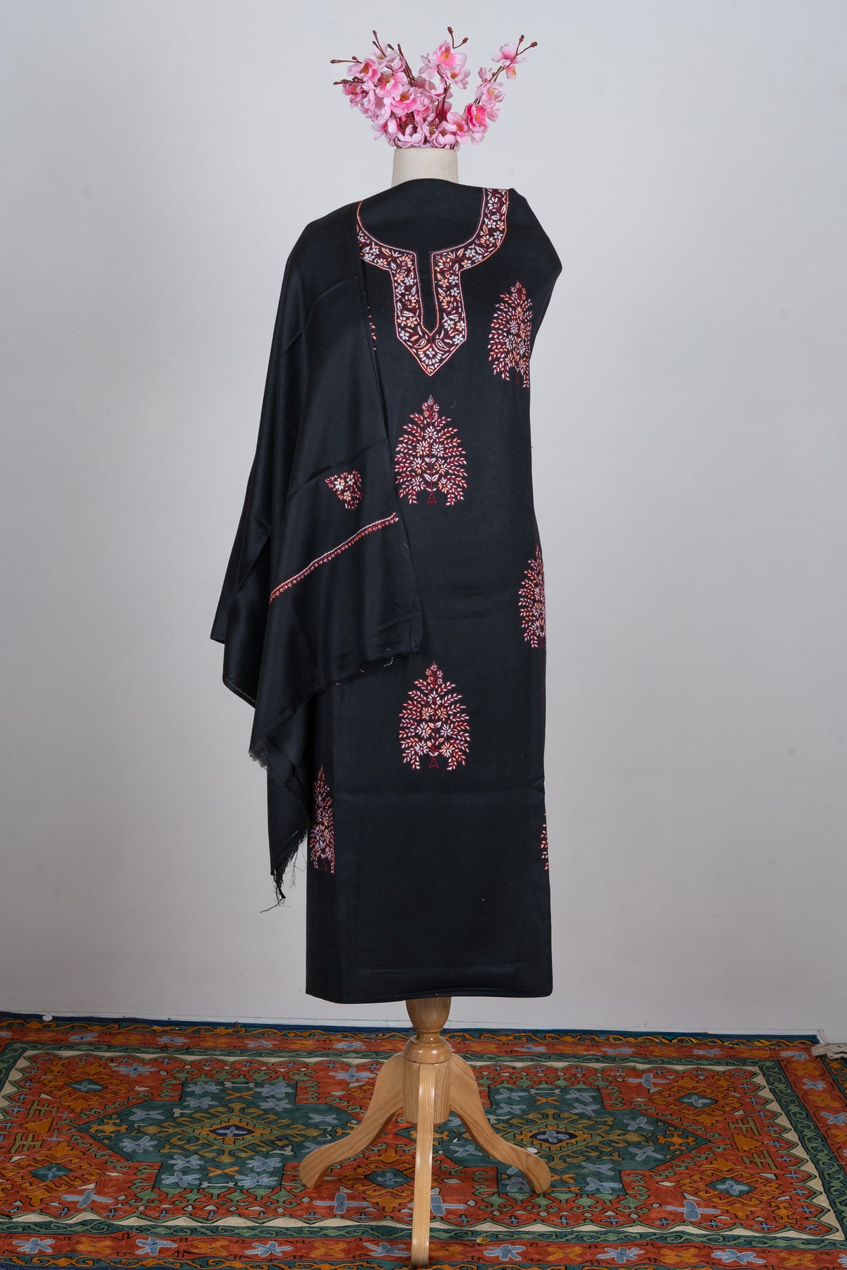 A timeless creation in jet black, this wool blend suit is adorned with intricate Sozni hand embroidery in hues of crimson and ivory. The detailed floral motifs exude regal elegance, while the refined neckline enhances its traditional allure.